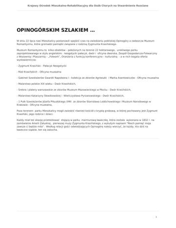 Krajowy Ośrodek Mieszkalno-Rehabilitacyjny dla Osób Chorych na Stwardnienie Rozsiane OPINOGÓRSKIM SZLAKIEM … W dniu 22 lipca nasi Mieszkańcy postanowili spędzić czas na zwiedzaniu pobliskiej Opinogóry a zwłaszcza Muzeum Romantyzmu, które gromadzi pamiątki związane z rodziną Zygmunta Krasińskiego. Muzeum Romantyzmu to kilka obiektów - położonych na terenie 22 hektarowego, urokliwego parku zaprojektowanego w stylu angielskim: neogotycki pałacyk, dwór i oficyna dworska, Zespół Gospodarczo-Folwarczny z Wozownią i Ptaszarnią – „Folwark”, Oranżeria z funkcją konferencyjno – kulturalną - a w nich bogata oferta wystawiennicza: - Zygmunt Krasiński - Pałacyk Neogotycki - Ród Krasińskich - Oficyna muzealna - Gabinet Szwoleżerów Gwardii Napoleona I - kolekcja ze zbiorów Agnieszki i Marka Axentowiczów - Oficyna muzealna - Malarstwo polskie XIX wieku - Dwór Krasińskich, - Srebra i platery warszawskie ze zbiorów Muzeum Mazowieckiego w Płocku - Dwór Krasińskich, - Malarstwo Katarzyny Słowikowskiej i Wieńczysława Pyrzanowskiego - Dwór Krasińskich, - 1 Pułk Szwoleżerów Józefa Piłsudskiego /VM/ ze zbiorów Stanisława Ledóchowskiego i Muzeum Narodowego w Krakowie - Oficyna muzealna, Poza terenem parku Mieszkańcy mogli zwiedzić również kościół z kryptą grobową, w której pochowany jest Zygmunt Krasiński, jego rodzice i dzieci. Każdy miał też okazję przetestować stojącą w parku marmurową ławeczkę, która została wykonana w 1832 r. na zamówienie Amelii Załuskiej, pierwszej muzy Zygmunta Krasińskiego, z wykutym napisem "Niech pamięć moja zawsze ci będzie miła". Według relacji gości odwiedzających Opinogórę należy wierzyć, że każdy, kto dziś na ławeczce siądzie, ten się zakocha. 1