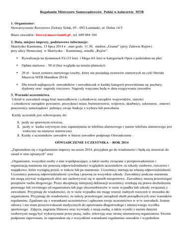 Regulamin Mistrzostw Samorządowców Polski w kolarstwie MTB 1. Organizator: Stowarzyszenie Rowerowe Zielony Szlak, 05 - 092 Łomianki, ul. Dolna 14/5 Biuro zawodów: [email protected] , tel. 609 084 184 2. Data, miejsce imprezy, podstawowe informacje: Skarżysko Kamienna, 13 lipca 2014 r , start godz. 11.30, stadion „Granat” (przy Zalewie Rejów) przy ulicy Słonecznej w Skarżysku – Kamiennej, osiedle „Rejów”. Rywalizacja na dystansach Fit (33 km) i Mega (61 km) w kategoriach Open z podziałem na płeć Opłata startowa – 50 zł (bez względu na termin płatności) 20 zł – koszt zestawu startowego (osoby, które nie posiadają zestawów startowych na cykl Merida Mazovia MTB Marathon 2014) Dla trzech najlepszych zawodników i zawodniczek w każdej kategorii przewidziane są: puchary, dyplomy oraz nagrody rzeczowe. Nagrody wręczane będą w dniu rozgrywania zawodów 3. Warunki uczestnictwa. Udział w zawodach mogą brać marszałkowie i członkowie zarządów województw, starości i członkowie zarządów powiatów, prezydenci miast, burmistrzowie, wójtowie, skarbnicy, sekretarze, etatowi pracownicy samorządowi pełniący swoje funkcje z wyboru lub powołania. Każdy uczestnik jest zobowiązany do: 1. jazdy na sprawnym rowerze, 2. jazdy w kasku sztywnym oraz zapamiętania nr telefonu alarmowego ( numer telefonu alarmowego jest widoczny na numerze startowym). 3. Każdy z uczestników zawodów w biurze zawodów podpisuje Oświadczenie : OŚWIADCZENIE UCZESTNIKA – ROK 2014 „Zapoznałem się z regulaminem imprezy na sezon 2014, przyjąłem go do wiadomości i będą się stosować do zasad w nim opisanych” oraz „Organizator, wszystkie osoby z nim współpracujące, a także osoby związane z przeprowadzeniem i organizacją maratonu nie ponoszą odpowiedzialności względem uczestników za szkody osobowe, rzeczowe i majątkowe, które wystąpią przed, w trakcie lub po maratonie. Uczestnicy startują na własną odpowiedzialność. Uczestnicy ponoszą odpowiedzialność cywilną i prawną za wszystkie szkody. Zawodnicy podczas maratonu nie mogą używać wulgarnych słów ani zachowywać się w sposób niesportowy. Zawodnicy muszą przestrzegać przepisów ruchu drogowego. Przez akceptację niniejszej deklaracji uczestnicy zrzekają się prawa dochodzenia prawnego lub zwrotnego od organizatora lub jego zleceniobiorców w razie wypadku lub szkody związanej z zawodami. Przyjmuję do wiadomości, że w razie wypadku nie mogę wnosić żadnych roszczeń w stosunku do organizatora. Przyjmuję do wiadomości, że należy przestrzegać zarządzeń służb porządkowych oraz warunków regulaminu. Zgadzam się z warunkami uczestnictwa i zgłaszam swoje uczestnictwo w w/w zawodach. Jestem zdrowy i nie mam przeciwwskazań medycznych do uprawiania długotrwałego i intensywnego wysiłku sportowego. Zdjęcia, nagrania filmowe oraz wywiady z moją osobą, a także wyniki z moimi danymi osobowymi mogą być wykorzystane przez prasę, radio, telewizję oraz stronę internetową organizatora. Swoim podpisem zapewniam, że zapoznałem się z wszystkimi warunkami regulaminu zawodów i wypełniłem formularz zgłoszeniowy zgodnie z prawdą oraz kompletnie. Wyrażam zgodę na przetwarzanie moich danych osobowych przez Stowarzyszenie Rowerowe Zielony Szlak z siedzibą w Łomiankach zgodnie z ustawą z dnia 29 sierpnia 1997 r. o ochronie danych osobowych (Dz. U. Nr 133, poz.883). Niniejsza deklaracja obowiązuje na wszystkich edycjach tegorocznego cyklu. Podane dane są prawdziwe, i że znane mu są przepisy art. 233 Kodeksu Karnego o odpowiedzialności karnej za podanie danych niezgodnych z rzeczywistością. Imię - ………….. Nazwisko - ………………..” Uczestnicy Mistrzostw są jednocześnie uczestnikami edycji Merida Mazovia MTB Marathon i muszą zastosować się do zasad opisanych w regulaminie cyklu oraz zobowiązani są do przestrzegania przepisów Kodeksu Ruchu Drogowego. 4. Zgłoszenia Każda osoba biorąca udział w Mistrzostwach zobowiązana jest do wypełnienia formularza i przesłania go na adres [email protected] do dnia 10 lipca lub przedłożenia w dniu zawodów do godz. 11.00 . Formularz zgłoszeniowy Mistrzostwa Samorządowców Polski w kolarstwie MTB 2014 Nazwisko i imię ……………………………………………………………………………. Miejsce zatrudnienia (nazwa, adres )…………………......................................................... ………………………………………………………………………………………………. Pełniona funkcja …………………………………………………………………………. Nazwa reprezentowanej jednostki samorządowej………………………………………….. Pieczątka Urzędu/Zakładu pracy …………………………………..