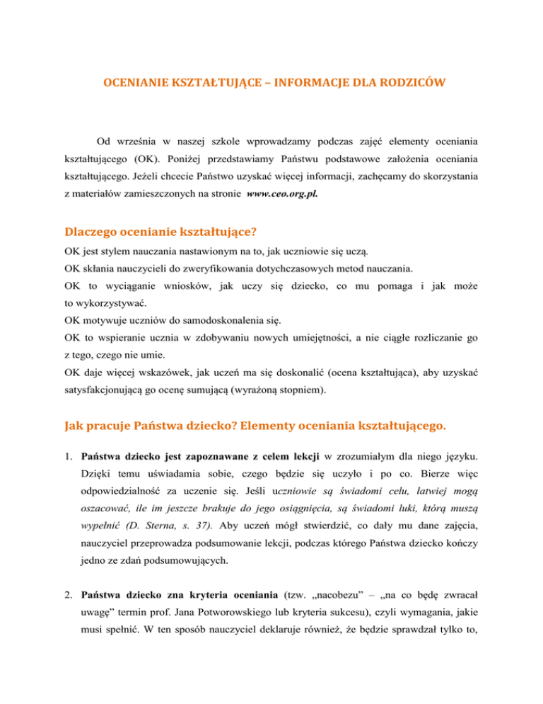 OCENIANIE KSZTAŁTUJĄCE – INFORMACJE DLA RODZICÓW Od września w naszej szkole wprowadzamy podczas zajęć elementy oceniania kształtującego (OK). Poniżej przedstawiamy Państwu podstawowe założenia oceniania kształtującego. Jeżeli chcecie Państwo uzyskać więcej informacji, zachęcamy do skorzystania z materiałów zamieszczonych na stronie www.ceo.org.pl. Dlaczego ocenianie kształtujące? OK jest stylem nauczania nastawionym na to, jak uczniowie się uczą. OK skłania nauczycieli do zweryfikowania dotychczasowych metod nauczania. OK to wyciąganie wniosków, jak uczy się dziecko, co mu pomaga i jak może to wykorzystywać. OK motywuje uczniów do samodoskonalenia się. OK to wspieranie ucznia w zdobywaniu nowych umiejętności, a nie ciągłe rozliczanie go z tego, czego nie umie. OK daje więcej wskazówek, jak uczeń ma się doskonalić (ocena kształtująca), aby uzyskać satysfakcjonującą go ocenę sumującą (wyrażoną stopniem). Jak pracuje Państwa dziecko? Elementy oceniania kształtującego. 1. Państwa dziecko jest zapoznawane z celem lekcji w zrozumiałym dla niego języku. Dzięki temu uświadamia sobie, czego będzie się uczyło i po co. Bierze więc odpowiedzialność za uczenie się. Jeśli uczniowie są świadomi celu, łatwiej mogą oszacować, ile im jeszcze brakuje do jego osiągnięcia, są świadomi luki, którą muszą wypełnić (D. Sterna, s. 37). Aby uczeń mógł stwierdzić, co dały mu dane zajęcia, nauczyciel przeprowadza podsumowanie lekcji, podczas którego Państwa dziecko kończy jedno ze zdań podsumowujących. 2. Państwa dziecko zna kryteria oceniania (tzw. „nacobezu” – „na co będę zwracał uwagę” termin prof. Jana Potworowskiego lub kryteria sukcesu), czyli wymagania, jakie musi spełnić. W ten sposób nauczyciel deklaruje również, że będzie sprawdzał tylko to, co zapowiedział. Eliminuje się efekt zaskoczenia i sytuacje, gdy uczeń otrzymywał ocenę za to, czego nie umie, a nie za to, czego się nauczył. Dzięki „nacobezu” Państwa dziecko wie, jak się przygotować do sprawdzianu, wypracowania, prezentacji itp. Kryteria oceniania przede wszystkim informują (…), czego i w jaki sposób ma się nauczyć. (D. Sterna, s. 47) 3. Państwa dziecko odpowiada na pytania kluczowe, których celem nie jest jedynie wykazanie się wiedzą. Pytania te mają zaciekawiać, motywować do poszukiwania odpowiedzi podczas zajęć, rozwijać wyobraźnię. 4. Państwa dziecko, będąc częścią grupy uczniów klasy, otrzymuje szansę na aktywne uczestnictwo w zajęciach. Wydłużany jest czas na zastanowienie się, aby większa liczba osób mogła przemyśleć odpowiedź. Dlatego dążymy do tego, aby uczniowie nie zgłaszali się do odpowiedzi, tylko udzielali informacji korzystając z metodników (metoda świateł, krótkiej odpowiedzi A, B, C, D, tabliczki, na której mogą zapisać odpowiedź). Nauczyciel w czasie lekcji korzysta z patyczków, na których są imiona uczniów. Dzięki temu Państwa dziecko, jeśli potrzebuje więcej czasu na zastanowienie, może również udzielić odpowiedzi, a nie tylko wysłuchać odpowiedzi osoby, która zgłosiła się pierwsza. Ponadto uczeń sam sprawdza, czy jego odpowiedź była prawidłowa. Nie jest wówczas narażany na wstyd lub stres związany z reakcją innych na błędną odpowiedź. Oczekiwanie na odpowiedź uczy pozostałych tolerancji i cierpliwości. Państwa dziecko często będzie pracować w parze. Dzięki temu może ustalić odpowiedź i poznać różne sposoby spojrzenia na jedno zagadnienie. 5. Państwa dziecko otrzymuje od nauczyciela informację zwrotną. Jest to bardzo istotne podczas wprowadzania nowego materiału oraz nabywania nowych umiejętności. Ma dać szansę uczniowi opanowania wymagań, a nauczycielowi dostarczyć informacji, czy uczeń rozumie omawiane zagadnienie. W zeszycie Państwa dzieci lub pod pracą może się znaleźć informacja zwrotna, która składa się z czterech elementów: mocne strony (++), czyli wskazanie, z czym Państwa dziecko poradziło sobie dobrze; co wymaga poprawy (-), czyli wskazanie tego, co wymaga korekty i dodatkowej pracy; sposób poprawy (Δ), czyli wskazówki dotyczące poprawy pracy; wskazówki, jak należy dalej pracować (→). Dzięki informacji zwrotnej uczeń wie, jak pracować, aby uzyskać lepsze efekty. Otrzymuje wsparcie od nauczyciela. W ten sposób Państwa dziecko może również dostrzec, że od niego zależy to, jaki będzie efekt końcowy, a nauczyciel nie chce go tylko rozliczać z tego, czego nie umie, ale jest osobą, która wspiera jego uczenie się. Efektem takiego działania jest zmniejszenie liczby ocen sumujących (tzw. stopni). Informację zwrotną udzielają również uczniowie osobie uczącej, bo to oni wiedzą, kiedy najlepiej się uczą, co im pomaga w uczeniu i jakie metody są dla nich najlepsze. (D. Sterna, s. 110) 6. Państwa dziecko dokonuje samooceny oraz oceny koleżeńskiej. Jest to najlepszy sposób brania odpowiedzialności za swoją naukę oraz świetna okazja, aby wykazać się empatią. Uczeń czyta i recenzuje pracę kolegi lub koleżanki. Może wskazać, co zostało wykonane dobrze, udzielić wskazówek, poradzić, co zmienić. Tłumaczenie zagadnienia drugiej osobie jest nieocenione we własnym procesie uczenia, ponieważ wymaga użycia swojej wiedzy i zweryfikowania jej w odniesieniu do pracy kolegi lub koleżanki. Opracowała: Agnieszka Torbicka Fragmenty zapisane kursywą pochodzą z książki Danuty Sterny „Ocenianie kształtujące w praktyce. Z przykładami kursu internetowego Akademii Szkoły uczącej się”. Literatura: Danuta Sterna „Ocenianie kształtujące w praktyce. Z przykładami kursu internetowego Akademii Szkoły uczącej się”, Warszawa 2014. Materiały zamieszczone na stronie www.ceo.org.pl.