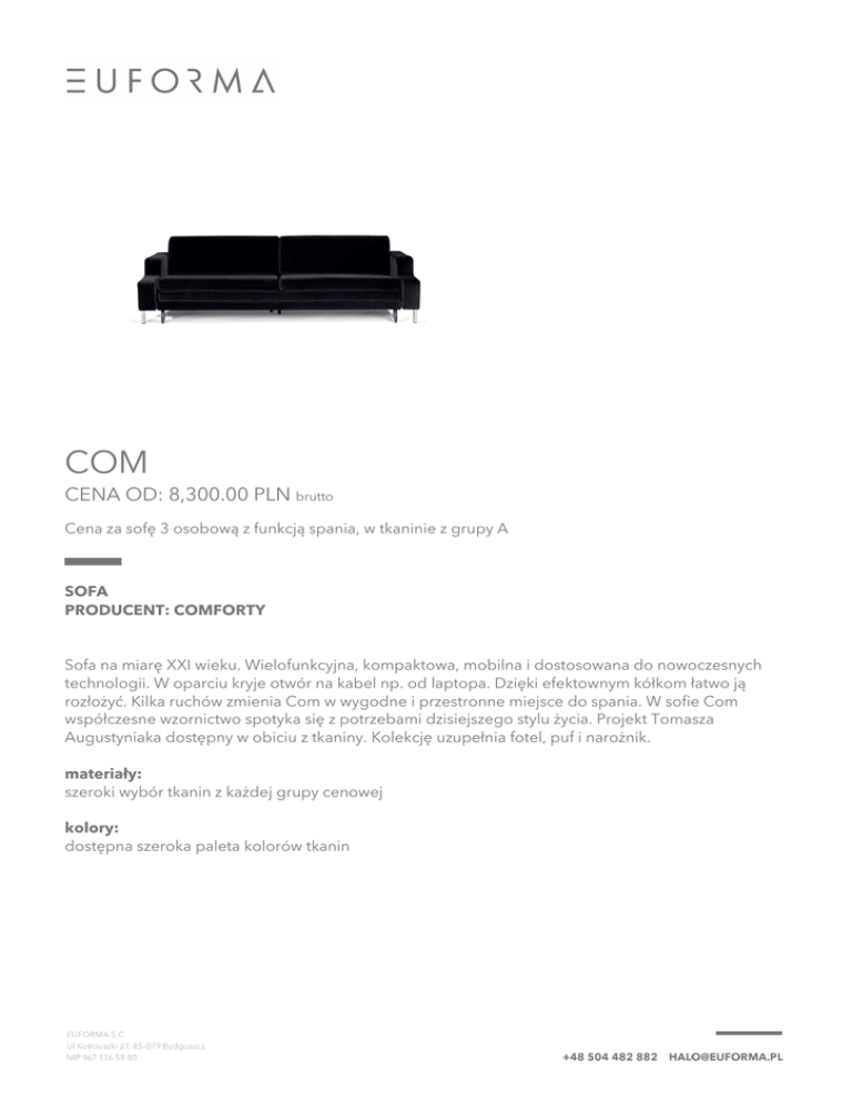COM CENA OD: 8,300.00 PLN brutto Cena za sofę 3 osobową z funkcją spania, w tkaninie z grupy A SOFA PRODUCENT: COMFORTY Sofa na miarę XXI wieku. Wielofunkcyjna, kompaktowa, mobilna i dostosowana do nowoczesnych technologii. W oparciu kryje otwór na kabel np. od laptopa. Dzięki efektownym kółkom łatwo ją rozłożyć. Kilka ruchów zmienia Com w wygodne i przestronne miejsce do spania. W sofie Com współczesne wzornictwo spotyka się z potrzebami dzisiejszego stylu życia. Projekt Tomasza Augustyniaka dostępny w obiciu z tkaniny. Kolekcję uzupełnia fotel, puf i narożnik. materiały: szeroki wybór tkanin z każdej grupy cenowej kolory: dostępna szeroka paleta kolorów tkanin Powered by TCPDF (www.tcpdf.org)