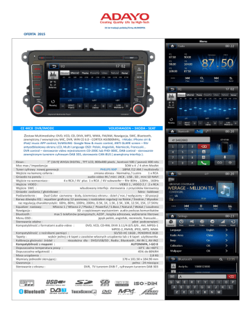 Creating Quality Life by High-Tech 31 lat tradycji polskiej firmy AUDIOPOL OFERTA 2015 Menu CE 4KC8 DVR/iMODE VOLKSWAGEN – SKODA - SEAT Zestaw Multimedialny: DVD, VCD, CD, DIVX, MP3, WMA, FM/AM, Nawigacja, SWC, Bluetooth, zewnętrzny / wewnętrzny MIC, DVR, WIN CE 6.0 - CORTEX A9/800MHz, i-Mode: iPhone siri & iPod/ music APP control, SUMSUNG Google Now & music control, ANTI GLARE screen – filtr antyodblaskowy ekranu LCD, Multi Language OSD: Polski, Angielski, Niemiecki, Francuski... DVR control – sterowanie video rejestratorem CD-200C lub FHD-300C, DAB control - sterowanie zewnętrznym tunerem cyfrowym DAB 303, sterowanie CAN-BUS ( zewnętrzny interfejs ). Ekran : 7” (16:9) WVGA DIGITAL , TFT LCD, 800x480 pixels , kontrast 500 / jasność 400 nits Moc max / Impedancja: 50W x 4 / 4 ohm Mosfet Tuner cyfrowy nowej generacji: PHILIPS NXP 18FM /12 AM / multistrefa Wejście na kamerę cofania : zmiana obrazu - Normalny / Lustro 1 x RCA Gniazdo na panelu : audio-video IN / mini JACK , USB , SD , mini SD NAVI Wyjście na wzmacniacz : 4 x RCA / 4V plus 1 x RCA / 4V subwoofer – filtr 80Hz , 120Hz , 160Hz Wyjście VIDEO : VIDEO 1 , VIDEO 2 / 2 x RCA Wyjście SWC : wbudowany interfejs sterowania z przycisków kierownicy Gniazdo zasilania / głośnikowe : fakra - kablowe Podświetlenie : Dual Color czerwony - biały, ściemniacz ekranu : dzień / noc / wyłączony – 10 pozycji Barwa dźwięku EQ : equalizer graficzny 12-pasmowy z rozdziałem regulacji na Niskie / Średnie / Wysokie raz regulacją charakterystyki: 60Hz, 80Hz, 100Hz, 200Hz, 0.5K, 1K, 1.5K, 2.5K, 10K, 12.5K, 15K, 17.5KHz Equalizer nastawy: Własna 1 / Własna 2 / Płaska / Powerful / S.Bass / Natural / Wokal / Loudness Nawigacja : 3D z częściowym wyciszeniem audio podczas komunikatów Bluetooth : max 5 telefonów powiązanych, A2DP , książka adresowa, wybieranie literowe Menu OSD : język polski, angielski, niemiecki, francuski... Sterowanie zdalne : pilot podczerwieni Kompatybilność z formatami audio-video : DVD, VCD, CD-RW, DIVX 3.11/4.0/5.0/6 , AVI, MPEG-1 MPEG-2, RMVB, JPEG, MP3, WMA Kompatybilność z nośnikami pamięci : SD/SD-HC 16GB , PENDRIVE 8GB Tapety : wybór jednej z 6 tapet z zasobów własnych urządzenia lub z 6 tapet użytkownika Kalibracja głośności źródeł : niezależna dla - DVD/USB/SD , Radia , Bluetooth , AV-IN 1, AV-IN2 Kompatybilność z mapami : AUTOMAPA, I-GO 8 Dopuszczalna temperatura pracy : -10°C do +60°C Dopuszczalna wilgotność : 45% do 80%RH Masa urządzenia : 2,8 KG Wymiary jednostki sterującej : 178 x 101.50 x 184.90 mm Gwarancja : pełna - 24 miesiące Sterowanie z ekranu : DVR, TV tunerem DVB-T , cyfrowym tunerem DAB 303 Schemat połączeń DVR – HD DIGITAL VIDEO RECORDER - cyfrowy rejestrator audio - video GMS FHD-300C HD 1080p, MPEG-4 / H.264 , 3M pixels Sterowanie z ekranu dotykowego Automatyczne nagrywanie podczas jazdy. G -sensor, automatyczna pętla video Szybkie manualne sterowanie nagrywaniem Wysokiej jakości rejestracja obrazu i dźwięku Szeroki kąt widzenia 120 stopni Odtwarzanie obrazu w dowolnym momencie. Małe gabaryty, łatwy montaż. Akceptacja karty micro SDHC do 32GB. Format video MOV, H264 1080p, 30k/s. Napięcie zasilania: 9 -16V. Pobór prądu w czasie pracy: 210mA. Temperatura pracy: 0 – 60C DVR – DIGITAL VIDEO RECORDER - cyfrowy rejestrator audio - video GMS CD-200C 720p, MJPEG, 1M pixels Sterowanie z ekranu dotykowego Automatyczne nagrywanie podczas jazdy. G -sensor, automatyczna pętla video Szybkie manualne sterowanie nagrywaniem Wysokiej jakości rejestracja obrazu i dźwięku Szeroki kąt widzenia 120 stopni Odtwarzanie obrazu w dowolnym momencie. Małe gabaryty, łatwy montaż. Akceptacja karty micro SDHC do 32GB. Format video AVI 720p, 30k/s. Napięcie zasilania: 9 -16V. Pobór prądu w czasie pracy: 150mA. Temperatura pracy: 0 - 60C Importer: AUDIOPOL MATLA CORPORATION 25-808 Kielce , Al.Górników Staszicowskich 132, tel : 41 346 26 60 , fax : 41 346 30 31 e-mail ; [email protected],