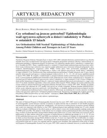 ARTYKUŁ REDAKCYJNY Dent. Med. Probl. 2009, 46, 3, 273–278 ISSN 1644−387X © Copyright by Wroclaw Medical University and Polish Stomatological Association BEATA KAWALA, MARTA SZUMIELEWICZ, ANNA KOZANECKA Czy ortodonci są jeszcze potrzebni? Epidemiologia wad zgryzowo−zębowych u dzieci i młodzieży w Polsce w ostatnich 15 latach Are Orthodontists Still Needed? Epidemiology of Malocclusion Among Polish Children and Teenagers in Last 15 Years Katedra i Zakład Ortopedii Szczękowej i Ortodoncji, Akademia Medyczna im. Piastów Śląskich we Wrocławiu Streszczenie Narodowy Program Ochrony Narządu Żucia w latach 1997–2001 zakładał obniżenie zachorowalności na choroby narządu żucia oraz występowania wad zgryzu przez wdrożenie programów promocji zdrowia i intensyfikację za− pobiegania próchnicy i zapaleniom dziąseł. Oczekiwano 15% obniżenia odsetka dzieci i młodzieży z wadami zgry− zu w stosunku do1995 r. Dane z opublikowanych w ostatnich 15 latach badań epidemiologicznych powinny umoż− liwić ocenę realizacji tego założenia oraz stanowić punkt odniesienia przy tworzeniu kolejnych programów zdro− wotnych umożliwiających osiągnięcie celów WHO. Celem pracy było porównanie aktualnych danych epidemiologicznych dotyczących występowania w Polsce wad zębowo−zgryzowych wśród dzieci i młodzieży w ciągu ostatnich 15 lat. Przedstawiono dane epidemiologiczne pochodzące z badań własnych oraz 21 prac innych autorów dotyczących wad zgryzu w różnych grupach wiekowych (6., 8., 11., 12. i 18. rok życia) opublikowanych w latach 1993–2008. W związku z trudnościami w przeprowadzeniu analizy porównawczej danych przedstawia− nych w poszczególnych publikacjach niemożliwa była jednoznaczna ocena zmian zachodzących w narządzie żu− cia dotyczących zaburzeń zębowo−zgryzowych u dzieci i młodzieży w ciągu ostatnich 15 lat w Polsce. Podjęto je− dynie próbę interpretacji dostępnych danych: większość badań epidemiologicznych prowadzonych w ciągu ostat− nich 15 lat miało charakter regionalny i dotyczyło jedynie kilku rejonów Polski, dlatego nie można jednoznacznie ocenić realizacji założeń Narodowego Programu Ochrony Narządu Żucia w latach 1997–2001. Wydaje się jednak, że planowane cele odnośnie do 15% spadku wad zgryzu nie zostały osiągnięte. Brakuje ponadto jednolitych kry− teriów oceny zaburzeń zgryzowo−zębowych i ich klasyfikacji, co utrudnia analizę porównawczą danych uzyska− nych w badaniach prowadzonych przez różnych autorów. Obserwuje się tendencję do wzrostu częstości występo− wania wad zgryzowo−zębowych w kolejnych grupach wiekowych. Najczęściej występującymi wadami zgryzu wg klasyfikacji Orlik−Grzybowskiej są wady dotylne – tyłozgryzy (Dent. Med. Probl. 2009, 46, 3, 273–278). Słowa kluczowe: wady zgryzu, wady zębowe, epidemiologia. Abstract The aims of National Program of Stomatognathic System Care for years 1997–2001 were to reduce the incidences of stomatognathic system diseases and the occurrence of malocclusions due to initiation of oral health programs and intensification of caries and gingivitis’ prophylactic. 15% decrease in malocclusion occurrence among children and youth was expected with relation to year 1995. Epidemiological data published during last 15 years should allow to evaluate a fulfillment of the above goals as well as help to create new health programs making realization of WHO goals possible. The purpose of the article was to compare current epidemiological data concerning frequ− ency of dento−occlusal disorders among Polish children and youth in last 15 years. Data from own research and 21 publications of other authors about the occurrence of malocclusions in different age groups (6, 8, 11, 12, 18 year of life) published between years 1993 and 2008 were included. An evaluation of changes in stomatognathic system in dento−occlusal disorders among Polish children in the last 15 years was impossible due to difficulties in compa− ring data presented by different authors. An attempt of the data interpretation was done: majority of epidemiologi− cal research in the last 15 years was regional and few regions were included. The realization of the goals of Natio− nal Program of Stomatognathic System Care for years 1997–2001 cannot be evaluated, however, it seems that schedu− 274 B. KAWALA, M. SZUMIELEWICZ, A. KOZANECKA led reduction of 15% of malocclusion was not achieved. Furthermore there is lack of straight rules of dento−occlusal disorders’ diagnosis and their classification. The tendency of increasing frequency of dento−occlusal disorders with age is observed. The most common disorders according to Orlik−Grzybowska’s classification are class II malocc− lusions (Dent. Med. Probl. 2009, 46, 3, 273–278). Key words: malocclusions, teeth disorders, epidemiology. Wytyczne Światowej Organizacji Zdrowia od− nośnie do zdrowia jamy ustnej na 2020 rok zosta− ły sformułowane w sposób ogólny, tworząc ramy do konstruowania programów zdrowotnych na szczeblu narodowym i regionalnym. Ustalone cele i zadania nie są określone w sposób ilościowy, co pozwala na dostosowanie ich do warunków lokal− nych, uwzględniając miejscowe zapotrzebowanie, priorytety, system opieki zdrowotnej oraz warunki socjalno−ekonomiczne. Zalecenia WHO dotyczą w głównej mierze profilaktyki, wczesnego wykry− wania i leczenia zaburzeń wad zgryzu wrodzo− nych, ale odnoszą się również do: – wczesnej diagnostyki i leczenia wad zgryzu znacznie upośledzających wygląd; – zmniejszenia częstości występowania zabu− rzeń estetyki wpływających na codzienne funkcjo− nowanie i relacje społeczne; – zmniejszenia liczby osób doświadczają− cych trudności w żuciu, połykaniu i mówieniu/ko− munikowaniu się, związanych z utratą zębów i wrodzonymi oraz nabytymi deformacjami twa− rzowymi/zębowymi [1]. Szc