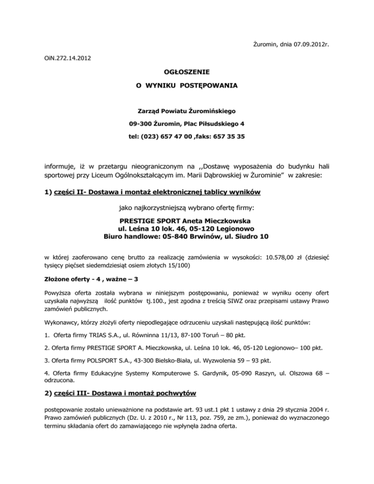 Żuromin, dnia 07.09.2012r. OiN.272.14.2012 OGŁOSZENIE O WYNIKU POSTĘPOWANIA Zarząd Powiatu Żuromińskiego 09-300 Żuromin, Plac Piłsudskiego 4 tel: (023) 657 47 00 ,faks: 657 35 35 informuje, iż w przetargu nieograniczonym na ,,Dostawę wyposażenia do budynku hali sportowej przy Liceum Ogólnokształcącym im. Marii Dąbrowskiej w Żurominie” w zakresie: 1) części II- Dostawa i montaż elektronicznej tablicy wyników jako najkorzystniejszą wybrano ofertę firmy: PRESTIGE SPORT Aneta Mieczkowska ul. Leśna 10 lok. 46, 05-120 Legionowo Biuro handlowe: 05-840 Brwinów, ul. Siudro 10 w której zaoferowano cenę brutto za realizację zamówienia w wysokości: 10.578,00 zł (dziesięć tysięcy pięćset siedemdziesiąt osiem złotych 15/100) Złożone oferty - 4 , ważne – 3 Powyższa oferta została wybrana w niniejszym postępowaniu, ponieważ w wyniku oceny ofert uzyskała najwyższą ilość punktów tj.100., jest zgodna z treścią SIWZ oraz przepisami ustawy Prawo zamówień publicznych. Wykonawcy, którzy złożyli oferty niepodlegające odrzuceniu uzyskali następującą ilość punktów: 1. Oferta firmy TRIAS S.A., ul. Równinna 11/13, 87-100 Toruń – 80 pkt. 2. Oferta firmy PRESTIGE SPORT A. Mieczkowska, ul. Leśna 10 lok. 46, 05-120 Legionowo– 100 pkt. 3. Oferta firmy POLSPORT S.A., 43-300 Bielsko-Biała, ul. Wyzwolenia 59 – 93 pkt. 4. Oferta firmy Edukacyjne Systemy Komputerowe S. Gardynik, 05-090 Raszyn, ul. Olszowa 68 – odrzucona. 2) części III- Dostawa i montaż pochwytów postępowanie zostało unieważnione na podstawie art. 93 ust.1 pkt 1 ustawy z dnia 29 stycznia 2004 r. Prawo zamówień publicznych (Dz. U. z 2010 r., Nr 113, poz. 759, ze zm.), ponieważ do wyznaczonego terminu składania ofert do zamawiającego nie wpłynęła żadna oferta. 3) części IV – Dostawa i montaż ławek szatniowych wraz z wieszakami jako najkorzystniejszą wybrano ofertę firmy: POLSPORT S.A. 43-300 Bielsko-Biała, ul. Wyzwolenia 59 w której zaoferowano cenę brutto za realizację zamówienia w wysokości: 9 560,79 zł (dziewięć tysięcy pięćset sześćdziesiąt złotych 79/100) Złożone oferty - 2 , ważne – 2 Powyższa oferta została wybrana w niniejszym postępowaniu, ponieważ w wyniku oceny ofert uzyskała najwyższą ilość punktów tj.100., jest zgodna z treścią SIWZ oraz przepisami ustawy Prawo zamówień publicznych. Wykonawcy, którzy złożyli oferty niepodlegające odrzuceniu uzyskali następującą ilość punktów: 1. Oferta firmy PRESTIGE SPORT A. Mieczkowska, ul. Leśna 10 lok. 46, 05-120 Legionowo– 45 pkt. 2. Oferta firmy POLSPORT S.A., 43-300 Bielsko-Biała, ul. Wyzwolenia 59 – 100 pkt. 4) części V - Dostawa wykładziny ochronnej oraz wózka jako najkorzystniejszą wybrano ofertę firmy: STEP BY STEP Sp. z o.o. ul. Lawendowa 12A, Owczarnia 05-807 Podkowa Leśna w której zaoferowano cenę brutto za realizację zamówienia w wysokości: 58 488,07 zł (pięćdziesiąt osiem tysięcy czterysta osiemdziesiąt osiem złotych 07/100) Złożone oferty - 1 , ważne – 1 Powyższa oferta została wybrana w niniejszym postępowaniu, ponieważ w wyniku oceny ofert uzyskała najwyższą ilość punktów tj.100., jest zgodna z treścią SIWZ oraz przepisami ustawy Prawo zamówień publicznych. Zatwierdził: Przewodniczący Powiatu Żuromińskiego /-/ Janusz Welenc