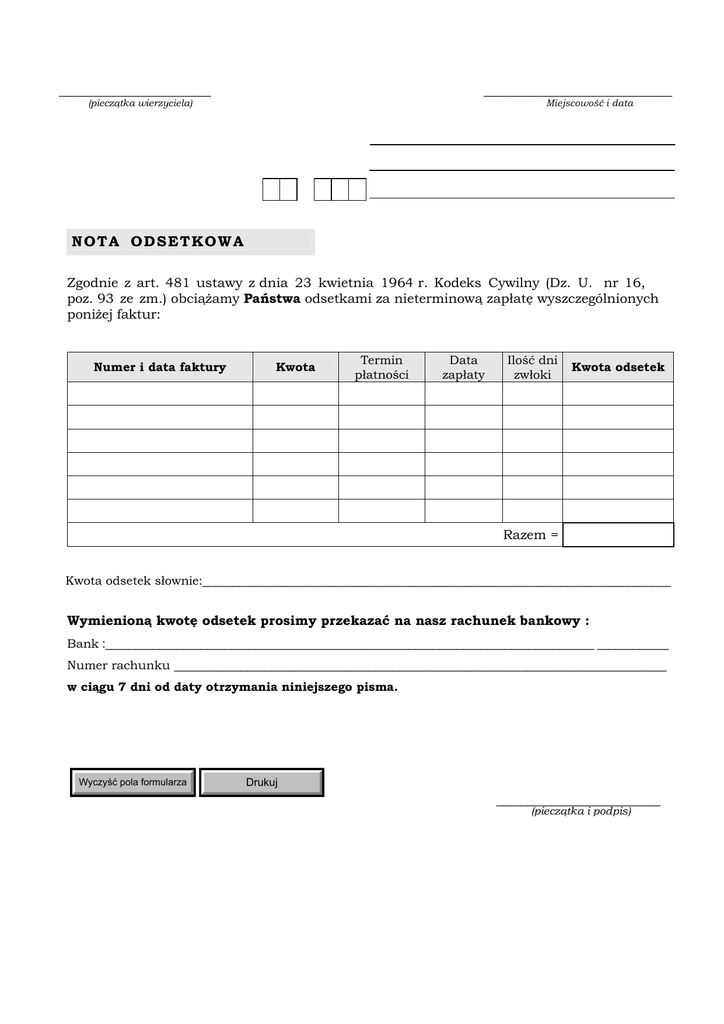 _________________________ _______________________________ (pieczątka wierzyciela) Miejscowość i data N O T A O D S E TK O W A Zgodnie z art. 481 ustawy z dnia 23 kwietnia 1964 r. Kodeks Cywilny (Dz. U. nr 16, poz. 93 ze zm.) obciążamy Państwa odsetkami za nieterminową zapłatę wyszczególnionych poniżej faktur: Numer i data faktury Kwota Termin płatności Data zapłaty Ilość dni zwłoki Kwota odsetek Razem = Kwota odsetek słownie:_____________________________________________________________________________ Wymienioną kwotę odsetek prosimy przekazać na nasz rachunek bankowy : Bank :__________________________________________________________________________________ ____________ Numer rachunku _________________________________________________________________________________ w ciągu 7 dni od daty otrzymania niniejszego pisma. Wyczyść pola formularza Drukuj ___________________________ (pieczątka i podpis)