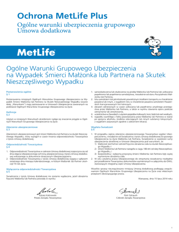 Ochrona MetLife Plus Ogólne warunki ubezpieczenia grupowego Umowa dodatkowa Ogólne Warunki Grupowego Ubezpieczenia na Wypadek Śmierci Małżonka lub Partnera na Skutek Nieszczęśliwego Wypadku Postanowienia ogólne §1 Użytym w niniejszych Warunkach określeniom nadaje się znaczenie przyjęte w Ogólnych Warunkach Grupowego Ubezpieczenia na Życie. 1. samookaleczenia lub okaleczenia na prośbę Małżonka lub Partnera lub usiłowania popełnienia lub popełnienia samobójstwa, niezależnie od stanu Poczytalności Małżonka lub Partnera, 2. lotu samolotem lub jakimkolwiek powietrznym środkiem transportu w charakterze pasażera lub innym, z wyjątkiem lotu w charakterze pasażera samolotem Pasażerskich licencjonowanych linii lotniczych, 3. obrażeń odniesionych w czasie usiłowania lub popełnienia umyślnego przestępstwa przez Małżonka lub Partnera, a także w wyniku stawiania oporu podczas zatrzymania lub aresztowania, 4. uczestnictwa w Zawodach z użyciem pojazdów kołowych, koni, łodzi lub nart wodnych, 5. wypadku wynikłego z faktu pozostawania przez Małżonka lub Partnera w stanie po spożyciu alkoholu, środków odurzających lub innych substancji toksycznych, z wyjątkiem zażywanych zgodnie z zaleceniem lekarza. Zdarzenie ubezpieczeniowe §3 Wypłata Świadczeń §6 Zdarzeniem ubezpieczeniowym jest śmierć Małżonka lub Partnera na skutek Nieszczęśliwego Wypadku, który wystąpił w czasie trwania odpowiedzialności Towarzystwa z tytułu Umowy dodatkowej. 1. W przypadku zajścia zdarzenia ubezpieczeniowego Towarzystwo wypłaci Ubezpieczonemu, niezależnie od Świadczenia z tytułu Umowy dodatkowej Grupowego Ubezpieczenia na Życie Małżonka lub Partnera, Świadczenie w wysokości sumy ubezpieczenia określonej w Umowie Ubezpieczenia pod warunkiem, że: 1) Małżonek lub Partner odniósł fizyczne obrażenia ciała na skutek Nieszczęśliwego Wypadku i 2) śmierć Małżonka lub Partnera nastąpiła w ciągu 180 dni od daty Nieszczęśliwego Wypadku, i 3) bezpośrednią i wyłączną przyczyną śmierci Małżonka lub Partnera były wyżej wymienione obrażenia ciała. 2. W celu ustalenia prawa Ubezpieczonego do otrzymania świadczenia niezbędne jest przedłożenie Towarzystwu dokumentów wymienionych w załączniku do OWU, stanowiącym integralną część Umowy Ubezpieczenia. Postanowienia niniejszych Ogólnych Warunków Grupowego Ubezpieczenia na Wypadek Śmierci Małżonka lub Partnera na Skutek Nieszczęśliwego Wypadku (zwane dalej „Warunkami”) mają zastosowanie w Umowach Ubezpieczenia zawieranych na podstawie Ogólnych Warunków Grupowego Ubezpieczenia na Życie. Definicje §2 Odpowiedzialność Towarzystwa §4 1. Odpowiedzialność Towarzystwa w zakresie Umowy dodatkowej rozpoczyna się od dnia objęcia Ubezpieczonego ochroną ubezpieczeniową z tytułu Umowy dodatkowej wskazanego w dokumencie doręczonym Ubezpieczającemu. 2. Odpowiedzialność Towarzystwa z tytułu Umowy dodatkowej wygasa z upływem ostatniego dnia miesiąca kalendarzowego, w którym Małżonek lub Partner ukończył 70 rok życia. Wyłączenia odpowiedzialności Towarzystwa §5 Świadczenie z tytułu Umowy dodatkowej nie zostanie wypłacone, jeżeli obrażenia fizyczne Małżonka lub Partnera powstały w wyniku: Łukasz Kalinowski Prezes Zarządu Towarzystwa Wszelkie sprawy nieuregulowane niniejszą Umową dodatkową podlegają uregulowaniom Ogólnych Warunków Grupowego Ubezpieczenia na Życie oraz właściwym przepisom obowiązującego prawa. Warszawa, dnia 15 lipca 2014 roku Piotr Sztrauch Członek Zarządu Towarzystwa 1