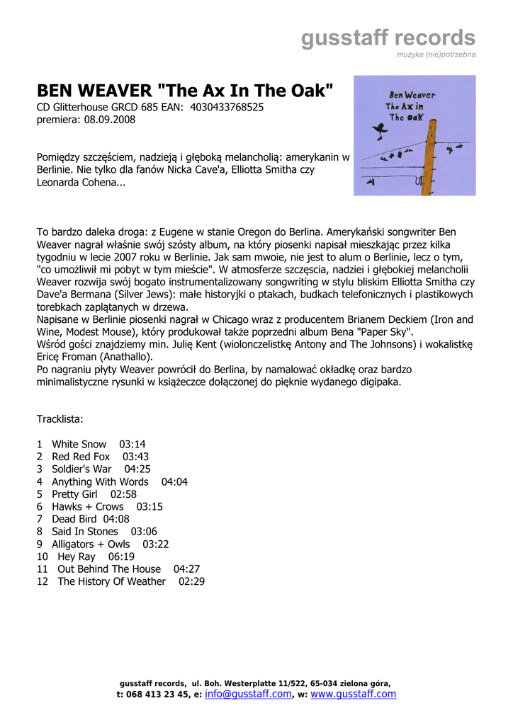 gusstaff records muzyka (nie)potrzebna BEN WEAVER "The Ax In The Oak" CD Glitterhouse GRCD 685 EAN: 4030433768525 premiera: 08.09.2008 Pomiędzy szczęściem, nadzieją i głęboką melancholią: amerykanin w Berlinie. Nie tylko dla fanów Nicka Cave'a, Elliotta Smitha czy Leonarda Cohena... To bardzo daleka droga: z Eugene w stanie Oregon do Berlina. Amerykański songwriter Ben Weaver nagrał właśnie swój szósty album, na który piosenki napisał mieszkając przez kilka tygodniu w lecie 2007 roku w Berlinie. Jak sam mwoie, nie jest to alum o Berlinie, lecz o tym, "co umożliwił mi pobyt w tym mieście". W atmosferze szczęscia, nadziei i głębokiej melancholii Weaver rozwija swój bogato instrumentalizowany songwriting w stylu bliskim Elliotta Smitha czy Dave'a Bermana (Silver Jews): małe historyjki o ptakach, budkach telefonicznych i plastikowych torebkach zaplątanych w drzewa. Napisane w Berlinie piosenki nagrał w Chicago wraz z producentem Brianem Deckiem (Iron and Wine, Modest Mouse), który produkował także poprzedni album Bena "Paper Sky". Wśród gości znajdziemy min. Julię Kent (wiolonczelistkę Antony and The Johnsons) i wokalistkę Ericę Froman (Anathallo). Po nagraniu płyty Weaver powrócił do Berlina, by namalować okładkę oraz bardzo minimalistyczne rysunki w książeczce dołączonej do pięknie wydanego digipaka. Tracklista: 1 2 3 4 5 6 7 8 9 10 11 12 White Snow 03:14 Red Red Fox 03:43 Soldier's War 04:25 Anything With Words 04:04 Pretty Girl 02:58 Hawks + Crows 03:15 Dead Bird 04:08 Said In Stones 03:06 Alligators + Owls 03:22 Hey Ray 06:19 Out Behind The House 04:27 The History Of Weather 02:29 gusstaff records, ul. Boh. Westerplatte 11/522, 65-034 zielona góra, t: 068 413 23 45, e: [email protected], w: www.gusstaff.com