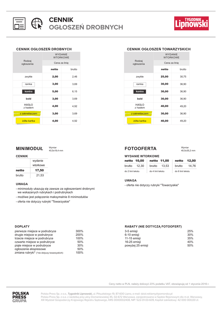 CENNIK OGŁOSZEŃ DROBNYCH CENNIK OGŁOSZEŃ DROBNYCH CENNIK OGŁOSZEŃ TOWARZYSKICH WYDANIE WTORKOWE Rodzaj ogłoszenia WYDANIE WTORKOWE Rodzaj ogłoszenia Cena za linię netto brutto zwykłe 2,00 2,46 ramka 3,00 kontra Cena za linię netto brutto zwykłe 25,00 30,75 3,69 ramka 30,00 36,90 5,00 6,15 kontra 30,00 36,90 bold 3,00 3,69 bold 30,00 36,90 HASŁO z hasłem 4,00 4,92 HASŁO z hasłem 40,00 49,20 z zakreślaczem 3,00 3,69 z zakreślaczem 30,00 36,90 żółta kartka 4,00 4,92 żółta kartka 40,00 49,20 MINIMODUŁ CENNIK Wymiar 40,5x19,4 mm wydanie wtorkowe netto17,50 FOTOOFERTA WYDANIE WTORKOWE netto10,00 netto11,00 Wymiar 40,5x35,2 mm netto 12,00 brutto12,30 brutto13,53 brutto 14,76 do 2 linii tekstu do 4 linii tekstu do 6 linii tekstu brutto21,53 UWAGA UWAGA -m inimoduły ukazują się zawsze za ogłoszeniami drobnymi we wskazanych rubrykach i podrubrykach - oferta nie dotyczy rubryki "Towarzyskie" -m ożliwe jest połączenie maksymalnie 8 minimodułów - oferta nie dotyczy rubryki "Towarzyskie" DOPŁATY RABATY (NIE DOTYCZĄ FOTOOFERT) pierwsze miejsce w podrubryce 300% drugie miejsce w podrubryce 200% trzecie miejsce w podrubryce 100% czwarte miejsce w podrubryce 50% piąte miejsce w podrubryce 30% ogłoszenie ekspresowe 50% zmiana rubryki* (*nie dotyczy towarzyskich)100% 3-5 emisji 6-10 emisji 11-15 emisji 16-25 emisji powyżej 25 emisji 25% 30% 35% 40% 50% Ceny netto w PLN, należy doliczyć 23% podatku VAT, obowiązują od 1 stycznia 2016 r. Polska Press Sp. z o.o., Tygodnik Lipnowski, ul. Piłsudskiego 19, 87-600 Lipno, e-mail: [email protected] Polska Press Sp. z o.o. z siedzibą przy ulicy Domaniewskiej 45, 02-672 Warszawa, zarejestrowana w Sądzie Rejonowym dla m.st. Warszawy, XIII Wydział Gospodarczy Krajowego Rejestru Sądowego, KRS 0000002408, NIP: 522-01-03-609, Kapitał zakładowy: 42 000 000,00 zł.