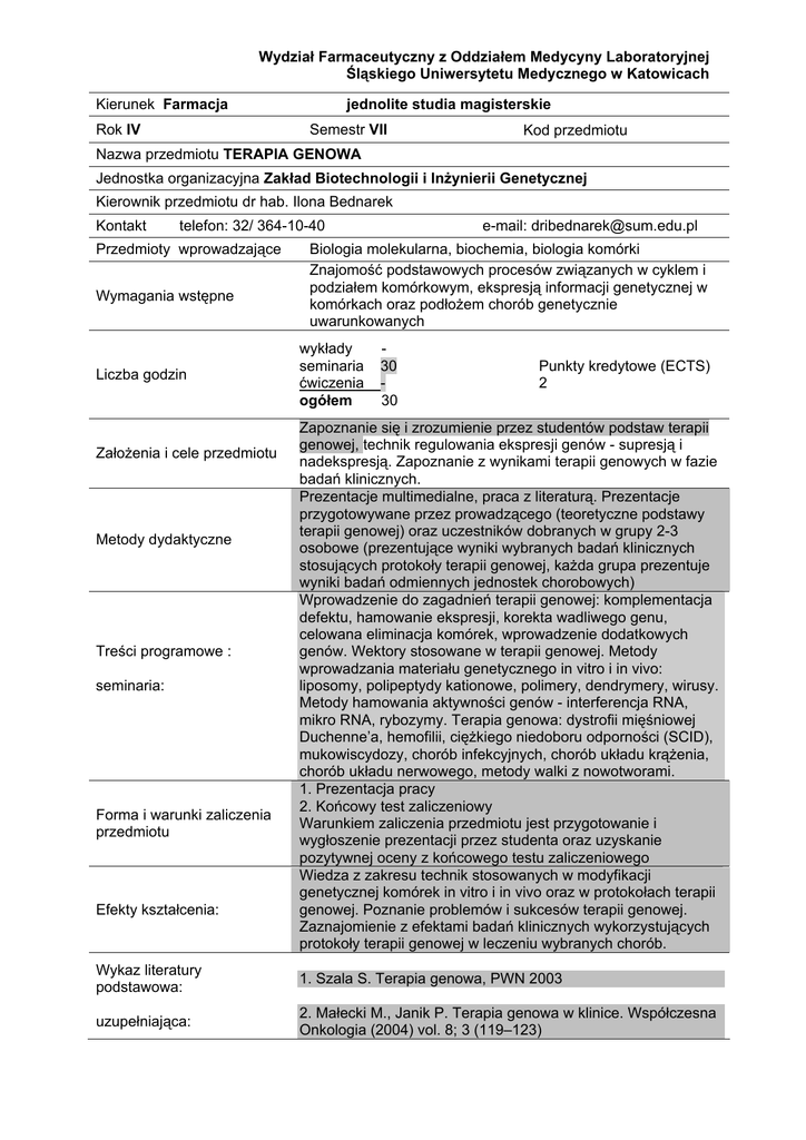 Wydział Farmaceutyczny z Oddziałem Medycyny Laboratoryjnej Śląskiego Uniwersytetu Medycznego w Katowicach Kierunek Farmacja Rok IV jednolite studia magisterskie Semestr VII Kod przedmiotu Nazwa przedmiotu TERAPIA GENOWA Jednostka organizacyjna Zakład Biotechnologii i Inżynierii Genetycznej Kierownik przedmiotu dr hab. Ilona Bednarek Kontakt telefon: 32/ 364-10-40 Przedmioty wprowadzające Wymagania wstępne Liczba godzin Założenia i cele przedmiotu Metody dydaktyczne Treści programowe : seminaria: Forma i warunki zaliczenia przedmiotu Efekty kształcenia: e-mail: [email protected] Biologia molekularna, biochemia, biologia komórki Znajomość podstawowych procesów związanych w cyklem i podziałem komórkowym, ekspresją informacji genetycznej w komórkach oraz podłożem chorób genetycznie uwarunkowanych wykłady seminaria ćwiczenia ogółem 30 30 Punkty kredytowe (ECTS) 2 Zapoznanie się i zrozumienie przez studentów podstaw terapii genowej, technik regulowania ekspresji genów - supresją i nadekspresją. Zapoznanie z wynikami terapii genowych w fazie badań klinicznych. Prezentacje multimedialne, praca z literaturą. Prezentacje przygotowywane przez prowadzącego (teoretyczne podstawy terapii genowej) oraz uczestników dobranych w grupy 2-3 osobowe (prezentujące wyniki wybranych badań klinicznych stosujących protokoły terapii genowej, każda grupa prezentuje wyniki badań odmiennych jednostek chorobowych) Wprowadzenie do zagadnień terapii genowej: komplementacja defektu, hamowanie ekspresji, korekta wadliwego genu, celowana eliminacja komórek, wprowadzenie dodatkowych genów. Wektory stosowane w terapii genowej. Metody wprowadzania materiału genetycznego in vitro i in vivo: liposomy, polipeptydy kationowe, polimery, dendrymery, wirusy. Metody hamowania aktywności genów - interferencja RNA, mikro RNA, rybozymy. Terapia genowa: dystrofii mięśniowej Duchenne’a, hemofilii, ciężkiego niedoboru odporności (SCID), mukowiscydozy, chorób infekcyjnych, chorób układu krążenia, chorób układu nerwowego, metody walki z nowotworami. 1. Prezentacja pracy 2. Końcowy test zaliczeniowy Warunkiem zaliczenia przedmiotu jest przygotowanie i wygłoszenie prezentacji przez studenta oraz uzyskanie pozytywnej oceny z końcowego testu zaliczeniowego Wiedza z zakresu technik stosowanych w modyfikacji genetycznej komórek in vitro i in vivo oraz w protokołach terapii genowej. Poznanie problemów i sukcesów terapii genowej. Zaznajomienie z efektami badań klinicznych wykorzystujących protokoły terapii genowej w leczeniu wybranych chorób. Wykaz literatury podstawowa: 1. Szala S. Terapia genowa, PWN 2003 uzupełniająca: 2. Małecki M., Janik P. Terapia genowa w klinice. Współczesna Onkologia (2004) vol. 8; 3 (119–123) Wydział Farmaceutyczny z Oddziałem Medycyny Laboratoryjnej Śląskiego Uniwersytetu Medycznego w Katowicach 3. Wilczyńska et al., Antyangiogenna terapia genowa Współczesna Onkologia (1999) 4; 139–142 4. Wesołowska A., Wykorzystanie małych interferujących RNA do hamowania ekspresji genów w komórkach ssaków – zastosowanie w neurobiologii. Konferencja „Nowe metody w neurobiologii” 15 grudnia 2004, 7-12 5. Gabryelska M. et al., Zastosowanie technologii interferencji RNA w medycynie. Neuroskop (2006), 8: 143-159.