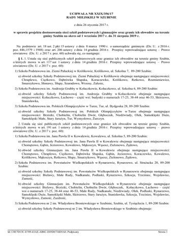 UCHWAŁA NR XXIX/356/17 RADY MIEJSKIEJ W SZUBINIE z dnia 26 stycznia 2017 r. w sprawie projektu dostosowania sieci szkół podstawowych i gimnazjów oraz granic ich obwodów na terenie gminy Szubin na okres od 1 września 2017 r. do 31 sierpnia 2019 r. Na podstawie art. 18 ust. 2 pkt 15 ustawy z dnia 8 marca 1990 r. o samorządzie gminnym (Dz. U. z 2016 r. poz. 446,1579 i 1948) oraz art. 206 ustawy z dnia 14 grudnia 2016 r. Przepisy wprowadzające ustawę – Prawo oświatowe (Dz. U. z 2017 r. poz. 60) uchwala się, co następuje: § 1. 1. Ustala się sieć publicznych szkół podstawowych oraz granice ich obwodów na terenie gminy Szubin, o których mowa w art. 117 ust 1 ustawy z dnia 14 grudnia 2016 r. Przepisy wprowadzające ustawę – Prawo oświatowe (Dz. U. z 2017 r. poz. 60): 1) Szkoła Podstawowa im. Ziemi Pałuckiej w Królikowie, Królikowo, ul. Szkolna 7, 89-200 Szubin: a) obwód szkolny Szkoły Podstawowej im. Ziemi Pałuckiej w Królikowie obejmuje następujące miejscowości: Chraplewo, Ciężkowo, Dąbrówka Słupska, Koraczewko, Królikowo, Retkowo, Rzemieniewice, Smarzykowo, Słonawy, Słupy, Szaradowo, Wrzosy, Zalesie, 2) Szkoła Podstawowa im. Andrzeja Grubby w Kołaczkowie, Kołaczkowo, ul. Szkolna 6, 89-200 Szubin: a) obwód szkolny Szkoły Podstawowej im. Andrzeja Grubby w Kołaczkowie obejmuje następujące miejscowości: Kołaczkowo, Łachowo – część wsi: budynki o numerach 17-25, 38-44 oraz 46-53, Skórzewo, Stanisławka, 3) Szkoła Podstawowa im. Polskich Olimpijczyków w Turze, Tur, ul. Bydgoska 28, 89-200 Szubin: a) obwód szkolny Szkoły Podstawowej im. Polskich Olimpijczyków w Turze obejmuje następujące miejscowości: Brzózki, Chobielin, Chobielin Dwór, Głęboczek, Niedźwiady, Olek, Samoklęski Duże, Samoklęski Małe, Stary Jarużyn, Tur, Wymysłowo, Żurczyn. 2. Ustala się sieć publicznych szkół podstawowych oraz granice ich obwodów na terenie gminy Szubin, o których mowa w art. 191 ust 1 ustawy z dnia 14 grudnia 2016 r. Przepisy wprowadzające ustawę – prawo oświatowe (Dz. U. z 2017 r. poz. 60): 1) Szkoła Podstawowa im. Jana Pawła II w Kowalewie, Kowalewo, ul. Szkolna 5, 89-200 Szubin: a) obwód szkolny Szkoły Podstawowej im. Jana Pawła II w Kowalewie obejmuje następujące miejscowości: Chomętowo, Gąbin, Jeziorowo, Kowalewo, Mąkoszyn, Wąsosz, Zielonowo, Żędowo, b) obwód szkolny Gimnazjum im. Jana Pawła II w Kowalewie obejmuje następujące miejscowości: Chomętowo, Chraplewo, Ciężkowo, Dąbrówka Słupska, Gąbin, Jeziorowo, Koraczewko, Kowalewo, Królikowo, Mąkoszyn, Retkowo, Słupy, Smarzykowo, Wąsosz, Zielonowo, Żędowo, 2) Szkoła Podstawowa im. Powstańców Wielkopolskich w Rynarzewie, Rynarzewo, ul. Strażacka 20, 89-200 Szubin: a) obwód szkolny Szkoły Podstawowej im. Powstańców Wielkopolskich w Rynarzewie obejmuje następujące miejscowości: Bielawy, Małe Rudy, Nadkanale, Podlaski, Rynarzewo, Szkocja, Trzciniec, Wojsławiec, Zamość, b) obwód szkolny Gimnazjum im. Powstańców Wielkopolskich w Rynarzewie obejmuje następujące miejscowości: Bielawy, Brzózki, Chobielin, Chobielin Dwór, Głęboczek, Kołaczkowo, Łachowo – część wsi o numerach 17-25, 38-44 oraz 46-53, Małe Rudy, Nadkanale, Niedźwiady, Olek, Podlaski, Rynarzewo, Samoklęski Duże, Samoklęski Małe, Skórzewo, Stary Jarużyn, Stanisławka, Szkocja, Trzciniec, Wojsławiec, Wymysłowo, Zamość, Zazdrość, 3) Szkoła Podstawowa nr 2 im. Władysława Broniewskiego w Szubinie, Szubin, ul. Tysiąclecia 1, 89-200 Szubin: a) obwód szkolny Szkoły Podstawowej nr 2 im. Władysława Broniewskiego w Szubinie obejmuje: Id: C8E7D13C-E789-43AE-AB6C-E05D6734D5A0. Podpisany Strona 1 - ulice Szubina: Boczna, Brzozowa, J. Dąbrowskiego, Generała Bema, Kcyńska, Kcyńska Nowe Osiedle, Jana Pawła II, Jagodowa, Klonowa, Krasickiego, Leśna, Lipowa, 3 Maja, Modrzewiowa, Mostowa, Nakielska 19 i 21, Nowa, Ogrodowa, Osiedle Cieleckiego, Elizy Orzeszkowej, Pałucka, Plac Wolności, Poziomkowa, Reymonta, Sosnowa, Sportowa, Świerkowa, Tysiąclecia, Wiewiórowskiego, Winnica 3179, - miejscowości: Ameryczka, Pińsko, Wolwark, b) obwód szkolny Gimnazjum nr 2 w Szubinie obejmuje: - ulice Szubina: Boczna, Brzozowa, J. Dąbrowskiego, Generała Bema, Kcyńska, Kcyńska Nowe Osiedle, Jana Pawła II, Jagodowa, Klonowa, Krasickiego, Leśna, Lipowa, 3 Maja, Modrzewiowa, Mostowa, Nakielska 19 i 21, Nowa, Ogrodowa, Osiedle Cieleckiego, Elizy Orzeszkowej, Pałucka, Plac Wolności, Poziomkowa, Reymonta, Sosnowa, Sportowa, Świerkowa, Tysiąclecia, Wiewiórowskiego, Winnica 3179, - miejscowości: Ameryczka, Pińsko, Wolwark. 3. Ustala się sieć publicznych szkół podstawowych oraz granice ich obwodów na terenie gminy Szubin, o których mowa w art. 129 ust. 1 pkt 2 ustawy z dnia 14 grudnia 2016 r. Przepisy wprowadzające ustawę – prawo oświatowe (Dz. U. z 2017 r. poz. 60): 1) Szkoła Podstawowa nr 1 im. Króla Władysława Jagiełły w Szubinie, Szubin, ul. Wyzwolenia 21, 89-200 Szubin, ul. Św. Marcina 11, 89-200 Szubin: a) obwód szkolny Szkoły Podstawowej nr 1 im. Króla Władysława Jagiełły w Szubinie obejmuje: - ulice: Asnyka, Broniewskiego, Browarna, C. K. Norwida, Dąbrowskiej, Dworcowa, Glinica, Harcerska, Kasprowicza, Kilińskiego, Kochanowskiego, Konopnickiej, Kościuszki, Krótka, Ks. Władysława Mączkowskiego, Łabiszyńska, Matejki, Mickiewicza, Młyńska, Nakielska, Paderewskiego, Plac Kościelny, Podgórna, Powstańców Wlkp, Prusa, Reja, Rynek, Sędziwoja Pałuki, Sienkiewicza, Słowackiego, 21 Stycznia, Świętego Marcina, Szenwalda, Szkolna, Wiejska, Winnica od nr 1 do 30, Wyspiańskiego, Wyzwolenia, Zamek, Żeromskiego, - miejscowości: Drogosław, Godzimierz, Grzeczna Panna, Kornelin, Smolniki, Szubin Wieś, Zazdrość, Łachowo – część wsi : budynki o numerach 1-16, 26-37, 45, 54-57, b) obwód szkolny Gimnazjum nr 1 im. Sędziwoja z Szubina obejmuje: - ulice Szubina: Asnyka, Broniewskiego, Browarna, C. K. Norwida, Dąbrows