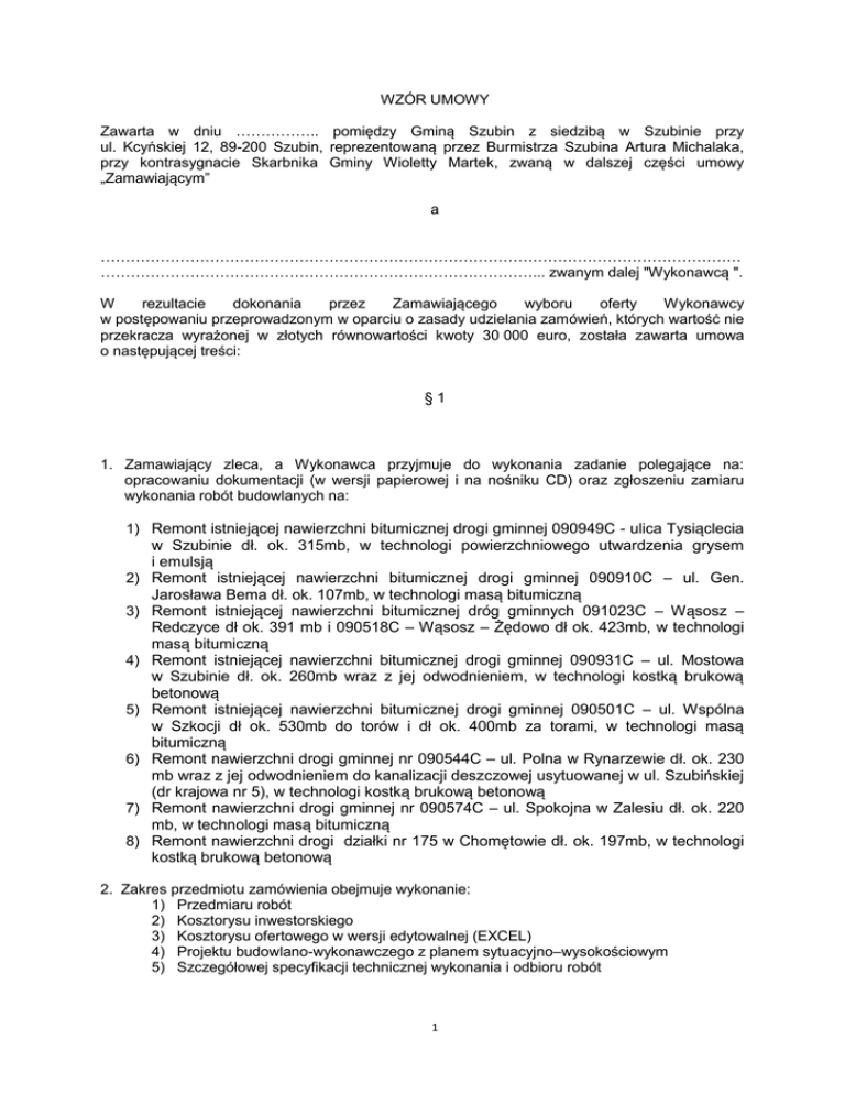 WZÓR UMOWY Zawarta w dniu …………….. pomiędzy Gminą Szubin z siedzibą w Szubinie przy ul. Kcyńskiej 12, 89-200 Szubin, reprezentowaną przez Burmistrza Szubina Artura Michalaka, przy kontrasygnacie Skarbnika Gminy Wioletty Martek, zwaną w dalszej części umowy „Zamawiającym” a ………………………………………………………………………………………………………………… ……………………………………………………………………………... zwanym dalej "Wykonawcą ". W rezultacie dokonania przez Zamawiającego wyboru oferty Wykonawcy w postępowaniu przeprowadzonym w oparciu o zasady udzielania zamówień, których wartość nie przekracza wyrażonej w złotych równowartości kwoty 30 000 euro, została zawarta umowa o następującej treści: §1 1. Zamawiający zleca, a Wykonawca przyjmuje do wykonania zadanie polegające na: opracowaniu dokumentacji (w wersji papierowej i na nośniku CD) oraz zgłoszeniu zamiaru wykonania robót budowlanych na: 1) Remont istniejącej nawierzchni bitumicznej drogi gminnej 090949C - ulica Tysiąclecia w Szubinie dł. ok. 315mb, w technologi powierzchniowego utwardzenia grysem i emulsją 2) Remont istniejącej nawierzchni bitumicznej drogi gminnej 090910C – ul. Gen. Jarosława Bema dł. ok. 107mb, w technologi masą bitumiczną 3) Remont istniejącej nawierzchni bitumicznej dróg gminnych 091023C – Wąsosz – Redczyce dł ok. 391 mb i 090518C – Wąsosz – Żędowo dł ok. 423mb, w technologi masą bitumiczną 4) Remont istniejącej nawierzchni bitumicznej drogi gminnej 090931C – ul. Mostowa w Szubinie dł. ok. 260mb wraz z jej odwodnieniem, w technologi kostką brukową betonową 5) Remont istniejącej nawierzchni bitumicznej drogi gminnej 090501C – ul. Wspólna w Szkocji dł ok. 530mb do torów i dł ok. 400mb za torami, w technologi masą bitumiczną 6) Remont nawierzchni drogi gminnej nr 090544C – ul. Polna w Rynarzewie dł. ok. 230 mb wraz z jej odwodnieniem do kanalizacji deszczowej usytuowanej w ul. Szubińskiej (dr krajowa nr 5), w technologi kostką brukową betonową 7) Remont nawierzchni drogi gminnej nr 090574C – ul. Spokojna w Zalesiu dł. ok. 220 mb, w technologi masą bitumiczną 8) Remont nawierzchni drogi działki nr 175 w Chomętowie dł. ok. 197mb, w technologi kostką brukową betonową 2. Zakres przedmiotu zamówienia obejmuje wykonanie: 1) Przedmiaru robót 2) Kosztorysu inwestorskiego 3) Kosztorysu ofertowego w wersji edytowalnej (EXCEL) 4) Projektu budowlano-wykonawczego z planem sytuacyjno–wysokościowym 5) Szczegółowej specyfikacji technicznej wykonania i odbioru robót 1 6) Projektu stałej organizacji ruchu i inwentaryzacji istniejącego oznakowania oraz uzyskania stosownego zatwierdzenia przez organ zarządzający ruchem na drogach, dla zadań określonych w ust. 1 pkt 2), 3), 5) i 8). 3. Zadanie polegające na zgłoszeniu zamiaru wykonania robót budowlanych, o których mowa w ust. 1 będzie uważane przez Zamawiającego za wykonane przy braku sprzeciwu właściwego organu, do którego zgłoszono zamiar wykonania robót budowlanych, o których mowa w art. 30 ust. 5 ustawy prawo budowlane. §2 Termin wykonania zadania: do 31 maja 2017r. §3 1. Wysokość wynagrodzenia przysługującego Wykonawcy za wykonanie przedmiotu umowy ustalona została na podstawie złożonej oferty i uwzględnia wszystkie koszty niezbędne do realizacji całości zamówienia. 2. Za wykonanie przedmiotu umowy Wykonawca otrzyma wynagrodzenie w wysokości: ………….. zł netto + podatek VAT, tj. brutto ……………. zł (słownie: ………………………………………. 00/100), z tego na realizację zadania, o którym mowa w § 1 ust. 1 pkt: 1) …………. zł brutto, 2) …………. zł brutto, 3) …………. zł brutto, 4) …………. zł brutto, 5) …………. zł brutto, 6) …………. zł brutto, 7) …………. zł brutto, 8) …………. zł brutto. 3. Zmiana wysokości łącznego wynagrodzenia brutto, o którym mowa w ust. 2 będzie możliwa w przypadku zmiany stawki podatku VAT w trakcie realizacji przedmiotu zamówienia. Zmiana nastąpi z dniem wejścia w życie aktu prawnego zmieniającego stawkę. Zmiana stawki podatku VAT nie wymaga spisania aneksu. 4. Strony postanawiają, że rozliczenie za przedmiot umowy nastąpi na podstawie faktury za wykonanie zamówienia, o którym mowa w § 1. 5. Faktura Wykonawcy wystawiona będzie w terminie 7 dni od daty podpisania protokołu przekazania dokumentacji na: Gmina Szubin Urząd Miejski w Szubinie ul. Kcyńska 12, 89-200 Szubin, NIP 558-172-32-33, za wykonanie przedmiotu zamówienia. 6. Podstawę do wystawienia faktury stanowić będzie protokół przekazania dokumentacji, który podpisany będzie przez przedstawicieli Wykonawcy i Zamawiającego. 7. Protokół sporządzony będzie przy braku sprzeciwu właściwego organu, do którego zgłoszono zamiar wykonania robót budowlanych, o których mowa w art. 30 ust. 5 ustawy prawo budowlane. 8. Strony ustalają, że termin zapłaty faktury Wykonawcy przez Zamawiającego będzie wynosił do 21 dni licząc od daty dostarczenia faktury do siedziby Zamawiającego. 9. W razie opóźnienia w zapłacie wynagrodzenia przez Zamawiającego, Wykonawcy przysługują odsetki w ustawowej wysokości. 2 §4 Wykonawca oświadcza, iż posiada odpowiednie kwalifikacje oraz wymagane prawem uprawnienia niezbędne do wykonania przedmiotu umowy. §5 1. Wykonawca zapłaci kary umowne Zamawiającemu w przypadku: 1) odstąpienia od umowy w wysokości 30% łącznego wynagrodzenia brutto, o którym mowa w § 3 ust. 2. 2) opóźnienia w wykonaniu przedmiotu umowy – w wysokości 2 % łącznego wynagrodzenia brutto,o którym mowa w § 3 ust. 2. za każdy dzień opóźnienia, 3) opóźnienia w usunięciu wad w przedmiocie umowy – w wysokości 2 % łącznego wynagrodzenia brutto, o którym mowa w § 3 ust. 2. za każdy dzień opóźnienia, licząc od ustalonego prze