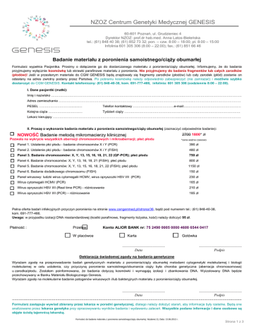 NZOZ Centrum Genetyki Medycznej GENESIS 60-601 Poznań, ul. Grudzieniec 4 Dyrektor NZOZ: prof.dr hab.med. Anna Latos-Bieleńska tel.: (61) 848 40 38; (61) 852 73 32; pon. – czw. 8:00 – 18:00; pt. 8:00 – 15:00 Infolinia 601 305 306 (8:00 – 22:00); fax.: (61) 851 66 46 Badanie materiału z poronienia samoistnego/ciąży obumarłej Formularz wypełnia Pacjentka. Prosimy o dołączenie go do dostarczanego materiału z poronienia/ciąży obumarłej. Informujemy, że do badania przyjmujemy wyłącznie kosmówkę lub skrawki parafinowe materiału z poronienia. Nie przyjmujemy do badania fragmentów lub całych zarodków (płodów)! Jeśli w przesłanym materiale do CGM GENESIS będą znajdowały się fragmenty zarodków (płodów) lub cały zarodek (płód) zostanie on odesłany na adres zwrotny podany przez Państwa. Po pobraniu kosmówkę należy odpowiednio zabezpieczyć (nie zamrażać) i możliwie szybko dostarczyć do CGM GENESIS. Kontakt telefoniczny: (61) 848-40-38, kom. 691-777-466, infolinia: 601 305 306 (codziennie 8:00 – 22:00). I. Dane pacjentki (matki): Imię i nazwisko ……………………………………………………………………………………………………...…………………………………………… Adres zamieszkania ………………………………………………………………………………………………..............……………..…………………… PESEL ………………………............. Telefon kontaktowy ………………………………e-mail:.....………………………………………. Kolejna ciąża ………………………… Tydzień ciąży ………………………………………………………………………………………… Lekarz kierujący ………………………………………………………………………………………………..............………………….…………………… II. Proszę o wykonanie badania materiału z poronienia samoistnego/ciąży obumarłej (zaznaczyć odpowiednie badanie): NOWOŚĆ Badanie metodą mikromacierzy klinicznej 2700 1800* zł Pozwala na wykrycie wszystkich aberracji chromosomowych i mikroaberracji; płeć płodu *cena ważna czasowo Panel 1. Ustalenie płci płodu - badanie chromosomów X i Y (PCR) 390 zł Panel 2. Ustalenie płci płodu - badanie chromosomów X i Y (FISH) 480 zł Panel 3. Badanie chromosomów: X, Y, 13, 15, 16, 18, 21, 22 (QF-PCR); płeć płodu 750 zł Panel 4. Badanie chromosomów: X, Y, 13, 16, 18, 21 (FISH); płeć płodu 800 zł Panel 5. Badanie chromosomów: X, Y, 13, 15, 16, 18, 21, 22 (FISH); płeć płodu 1150 zł Panel 6. Badanie dodatkowego chromosomu (FISH) 150 zł Panel wirusowy: ludzki wirus cytomegalii HCMV, wirus opryszczki HSV I/II (PCR) 230 zł Wirus cytomegalii HCMV (PCR) 165 zł Wirus opryszczki HSV I/II (Real time PCR) - różnicowanie 210 zł Wirus opryszczki HSV I/II (PCR) – różnicowanie 185 zł Pełna oferta badań infekcyjnych przyczyn poronienia na stronie www.cengenmed.pl/strona/36, bądź pod numerem tel.: (61) 848-40-38, kom. 691-777-466. Uwaga: w przypadku izolacji DNA niestandardowej (kostki parafinowe, fragmenty łożyska, kość) należy doliczyć 95 zł. Płatność : Przelew W placówce Konto ALIOR BANK nr: 75 2490 0005 0000 4600 6544 0417 Karta ………………………… Data Gotówka ………………………… Podpis Deklaracja świadomej zgody na badania genetyczne Wyrażam zgodę na przeprowadzenie badań genetycznych materiału z poronienia/ciąży obumarłej metodami cytogenetyki molekularnej i biologii molekularnej w celu ustalenia, czy przyczyną poronienia samoistnego/obumarcia ciąży była choroba genetyczna (aberracja chromosomowa) u zarodka/płodu. Zostałam poinformowana, że badania dotyczą kosmówki i wymagają izolacji i zbankowania DNA. Wyizolowany DNA będzie przechowywany w Banku Materiału Biologicznego Genesis. Wyrażam zgodę na molekularne badanie patogenów wirusowych i/lub bakteryjnych materiału z poronienia/ciąży obumarłej. ………………………… Data ………………………… Podpis …………………………………………………………………………………………………………………………………………………………………………...…..... Formularz zastępuje wywiad zbierany przez lekarza w poradni genetycznej, dlatego należy dołożyć starań, aby informacje były rzetelne. Będą one analizowane przez lekarza genetyka przy opracowywaniu wyników badania i wydawaniu zaleceń. Wszystkie podane informacje i dane osobowe są objęte ścisłą tajemnicą lekarską. Formularz do badania materiału z poronienia samoistnego/ciąży obumarłej. Wydanie:13, Data: 13.06.2012 r. Strona 1 z 3 III. Dane dotyczące aktualnego poronienia/obumarcia aktualnej ciąży Data i godzina pobrania materiału z poronienia: ……………………………………..…………………………………………………………………….…………… Kto pobierał materiał z poronienia: Lekarz w czasie zabiegu Pacjentka po poronieniu jaja płodowego Jak uzyskano ciążę, z której materiał ma być badany genetycznie: W sposób naturalny, w czasie krótszym niż rok od podjęcia starań o dziecko W sposób naturalny, ale po dłuższym okresie braku ciąży – jak długim? ............................................................................................................... Po inseminacji nasieniem partnera Po inseminacji nasieniem dawcy Po in vitro (IVF) lub ICSI Dodatkowe uwagi ................................................................................................................................................................................................................... Czy w ciąży, z której materiał z poronienia ma być obecnie badany pacjentka chorowała ? Tak Nie Jeśli tak, w którym tygodniu, na co, czy przyjmowała 