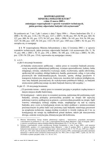 ROZPORZĄDZENIE MINISTRA INFRASTRUKTURY1) z dnia 12 marca 2009 r. zmieniające rozporządzenie w sprawie warunków technicznych, jakim powinny odpowiadać budynki i ich usytuowanie2) Na podstawie art. 7 ust. 2 pkt 1 ustawy z dnia 7 lipca 1994 r. – Prawo budowlane (Dz. U. z 2006 r. Nr 156, poz. 1118, i Nr 170, poz. 1217, z 2007 r. Nr 88, poz. 587, Nr 99, poz. 665, Nr 127, poz. 880, Nr 191, poz. 1373, Nr 247, poz. 1844, z 2008 r. Nr 145, poz. 914, Nr 199, poz. 1227, Nr 206, poz. 1287, Nr 210, poz. 1321 i Nr 227, poz. 1505 oraz z 2009 r. Nr 18, poz. 97) zarządza się, co następuje: § 1. W rozporządzeniu Ministra Infrastruktury z dnia 12 kwietnia 2002 r. w sprawie warunków technicznych, jakim powinny odpowiadać budynki i ich usytuowanie (Dz. U. Nr 75, poz. 690, z 2003 r. Nr 33, poz. 270, z 2004 r. Nr 109, poz. 1156 oraz z 2008 r. Nr 201, poz. 1238 i Nr 228, poz. 1514), wprowadza się następujące zmiany: 1) w § 3: a) pkt 6 otrzymuje brzmienie: „6) budynku użyteczności publicznej – należy przez to rozumieć budynek przeznaczony na potrzeby administracji publicznej, wymiaru sprawiedliwości, kultury, kultu religijnego, oświaty, szkolnictwa wyższego, nauki, wychowania, opieki zdrowotnej, społecznej lub socjalnej, obsługi bankowej, handlu, gastronomii, usług, w tym usług pocztowych lub telekomunikacyjnych, turystyki, sportu, obsługi pasażerów w transporcie kolejowym, drogowym, lotniczym, morskim lub wodnym śródlądowym, oraz inny budynek przeznaczony do wykonywania podobnych funkcji; za budynek użyteczności publicznej uznaje się także budynek biurowy lub socjalny,”, b) pkt 15 - 18 otrzymują brzmienie: „15) poziomie terenu – należy przez to rozumieć przyjętą w projekcie rzędną terenu w danym miejscu działki budowlanej, 16) kondygnacji – należy przez to rozumieć poziomą, nadziemną lub podziemną część budynku, zawartą pomiędzy powierzchnią posadzki na stropie lub najwyżej położonej warstwy podłogowej na gruncie, a powierzchnią posadzki na stropie, bądź warstwy osłaniającej izolację cieplną stropu, znajdującego się nad tą częścią budynku, przy czym za kondygnację uważa się także poddasze z pomieszczeniami przeznaczonymi na pobyt ludzi oraz poziomą część budynku stanowiącą przestrzeń na urządzenia techniczne, mającą średnią wysokość w świetle większą niż 2 m; za kondygnację nie uznaje się nadbudówek ponad dachem, takich jak maszynownia dźwigu, centrala wentylacyjna, klimatyzacyjna lub kotłownia, 1) 2) Minister Infrastruktury kieruje działem administracji rządowej – budownictwo, gospodarka przestrzenna i mieszkaniowa na podstawie § 1 ust. 2 pkt 1 rozporządzenia Prezesa Rady Ministrów z dnia 16 listopada 2007 r. w sprawie szczegółowego zakresu działania Ministra Infrastruktury (Dz. U. Nr 216, poz. 1594); Niniejsze rozporządzenie zostało notyfikowane Komisji Europejskiej w dniu 8 maja 2008 r., pod numerem 2008/0185/PL, zgodnie z § 4 rozporządzenia Rady Ministrów z dnia 23 grudnia 2002 r. w sprawie sposobu funkcjonowania krajowego systemu notyfikacji norm i aktów prawnych (Dz. U. Nr 239, poz. 2039 oraz z 2004 r. Nr 65, poz. 597), które wdraża dyrektywę 98/34/WE z dnia 22 czerwca 1998 r. ustanawiającą procedurę udzielania informacji w zakresie norm i przepisów technicznych (Dz. Urz. WE L 204 z 21 lipca 1998 r., z późn. zm.; Dz. Urz. UE Polskie wydanie specjalne, rozdz. 13, t. 20, str. 337). wt60_po_uzgod_09_03_06proj28_czarny 1 17) kondygnacji podziemnej – należy przez to rozumieć kondygnację zagłębioną ze wszystkich stron budynku, co najmniej do połowy jej wysokości w świetle poniżej poziomu przylegającego do niego terenu, a także każdą usytuowaną pod nią kondygnację, 18) kondygnacji nadziemnej – należy przez to rozumieć każdą kondygnację niebędącą kondygnacją podziemną,”, c) pkt 22 otrzymuje brzmienie: „22) terenie biologicznie czynnym – należy przez to rozumieć teren z nawierzchnią ziemną urządzoną w sposób zapewniający naturalną wegetację, a także 50%, powierzchni tarasów i stropodachów z taką nawierzchnią, nie mniejszą jednak niż 10 m2, oraz wodę powierzchniową na tym terenie,”; 2) § 6 otrzymuje brzmienie: „§ 6. Wysokość budynku, służącą do przyporządkowania temu budynkowi odpowiednich wymagań rozporządzenia, mierzy się od poziomu terenu przy najniżej położonym wejściu do budynku lub jego części, znajdującym się na pierwszej kondygnacji nadziemnej budynku, do górnej powierzchni najwyżej położonego stropu, łącznie z grubością izolacji cieplnej i warstwy ją osłaniającej bez uwzględniania wyniesionych ponad tę płaszczyznę maszynowni dźwigów i innych pomieszczeń technicznych, bądź do najwyżej położonego punktu stropodachu, lub konstrukcji przekrycia budynku znajdującego się bezpośrednio nad pomieszczeniami przeznaczonymi na pobyt ludzi.”; 3) § 9 otrzymuje brzmienie: „1. Wymagane w rozporządzeniu wymiary należy rozumieć, jako uzyskane z uwzględnieniem wykończenia powierzchni elementów budynku, a w odniesieniu do szerokości drzwi, jako wymiary w świetle ościeżnicy. 2. Grubość skrzydła drzwi po otwarciu nie może pomniejszać wymiaru szerokości otworu w świetle ościeżnicy. 3. Określone w rozporządzeniu odległości budynków od innych budynków, urządzeń budowlanych lub granicy działki budowlanej mierzy się w poziomie w miejscu ich najmniejszego oddalenia. 4. Dla budynków istniejących dopuszcza się przyjmowanie odległości, o których mowa w ust. 3, bez uwzględnienia grubości warstw izolacji termicznej, tynków lub okładzin zewnętrznych, przy czym nie dotyczy to ściany budynku usytuowanej bezpośrednio przy granicy działki. 5. Wykaz Polskich Norm powołanych w rozporządzeniu określa załącznik nr 1 do rozporządzenia.”; 4) § 12 otrzymuje brzmienie: „§ 12.1. Jeżeli z przepisów § 13, 60 i 271 – 273 lub przepisów odrębnych okre