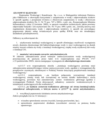 SZANOWNY KLIENCIE! Regionalne Wodociągi i Kanalizacja Sp. z o.o. w Białogardzie informuje Państwa, jako Odbiorców o obowiązku korzystania z zaopatrzenia w wodę i odprowadzania ścieków w sposób zgodny z przepisami (Ustawa o zbiorowym zaopatrzeniu w wodę i zbiorowym odprowadzaniu ścieków Dz. U. Nr 72 poz. 747 z 2001r. z póź. zm., Rozporządzenie Ministra Infrastruktury z dnia 12 kwietnia 2002r. w sprawie warunków technicznych, jakim powinny odpowiadać budynki i ich usytuowanie Dz. Nr 75 poz. 690 z późn. zm., zawartą umową oraz regulaminem dostarczania wody i odprowadzania ścieków), w sposób nie powodujący pogorszenia jakości usług świadczonych przez spółkę RWiK oraz nie utrudniający działalność przedsiębiorstwa. Odbiorcy są zobowiązani do: 1. użytkowania instalacji wodociągowej w sposób eliminujący możliwość wystąpienia awarii, skażenia chemicznego lub bakteriologicznego wody w sieci wodociągowej na skutek między innymi cofania się wody z instalacji wodociągowej, ciepłej wody użytkowej lub wody z instalacji CO, 2. montażu i utrzymania zaworów antyskażeniowych. W zakresie zabezpieczenia przed wtórnym zanieczyszczeniem wody wodociągowej przeznaczonej do spożycia przez ludzi w/w rozporządzenie oraz PN-EN 1717 z 23 października 2003r. stawia następujące wymagania do obowiązkowego stosowania: • §113.7 w/w rozporządzenia określa – „instalacja wodociągowa powinna mieć zabezpieczenia uniemożliwiające wtórne zanieczyszczenie wody, zgodnie z wymaganiami dla przepływów zwrotnych, określonymi w Polskiej Normie dotyczącej projektowania instalacji wodociągowej,” • §115.1 rozporządzenia – „na każdym połączeniu wewnętrznej instalacji wodociągowej zimnej wody lub zewnętrznej na terenie działki budowlanej z siecią wodociągową, powinien być zainstalowany zestaw wodomierza głównego zgodnie z wymaganiami Polskich Norm dotyczących zabudowy zestawów wodomierzowych w instalacjach wodociągowych dla wodomierzy,” • §115.2 „za każdym zestawem wodomierza głównego od strony instalacji należy zainstalować zabezpieczenie, o którym mowa w §113.7” tj. zawór antyskażeniowy, 3. weryfikacji poprawności działania zaworu antyskażeniowego Zakres przeglądu (raz na 12 miesięcy) : • • wizualne sprawdzenie zaworu (wycieki, korozja powierzchni, itp.). sprawdzenie poprawności działania (szczelności zaworu) za pomocą kurka upustowego. Przykładowy zalecany schemat montażu zestawu wodomierzowego wraz z zabezpieczeniem antyskażeniowym Mając na uwadze fakt, iż część naszych klientów nie wyposażyło swojej instalacji wewnętrznej w ten jakże ważny i konieczny element, prosimy o niezwłoczny montaż zaworu antyskażeniowego (w przypadku jego braku) na będącej własnością Odbiorcy instalacji wewnętrznej. Inkasenci naszej firmy będą na bieżąco odnotowywać fakt montażu w/w zaworu. Brak zaworu zwrotnego może spowodować skażenie sieci wodociągowej związane z przedostaniem się do jej wnętrza substancji stwarzających zagrożenie dla zdrowia i życia Odbiorców wody. Skażenie spowodowało by konieczność zamknięcia dostawy wody oraz wykonanie dezynfekcji i płukanie sieci które to koszty poniesie Odbiorca. Informujemy, że podczas wymiany wodomierza głównego przez pracowników Spółki istniej możliwość zlecenia montażu zaworu antyskażeniowego. Koszt jaki Państwo ponoszą to cena zakupu zaworu antyskażeniowego (DN 15 - 19,68zł, DN 20 25,83zł). Bezpłatny montaż zaworu dotyczy wyłącznie Odbiorców których instalacja wodociągowa pozwala na montaż zaworu podczas rutynowej wymiany wodomierza. Poniżej przedstawiamy wymagany zawór antyskażeniowy w zależności od rodzaju przyłącza wodociągowego: Rodzaj przyłącza Dom jednorodzinny z wyposażeniem podstawowym Instalacja p. poż (hydrantowy, tryskaczowa) Instalacja grzewcza Budynek mieszkalny wielorodzinny, obiekt użyteczności publicznej Obiekt usługowy lub przemysłowy Rodzaj zaworu antyskażeniowego EA EA BA BA BA