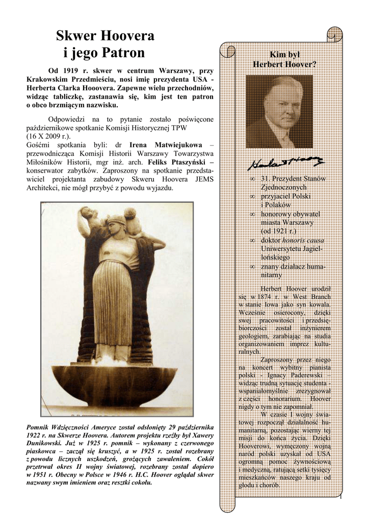 Skwer Hoovera i jego Patron Od 1919 r. skwer w centrum Warszawy, przy Krakowskim Przedmieściu, nosi imię prezydenta USA Herberta Clarka Hooovera. Zapewne wielu przechodniów, widząc tabliczkę, zastanawia się, kim jest ten patron o obco brzmiącym nazwisku. Odpowiedzi na to pytanie zostało poświęcone październikowe spotkanie Komisji Historycznej TPW (16 X 2009 r.). Gośćmi spotkania byli: dr Irena Matwiejukowa – przewodnicząca Komisji Historii Warszawy Towarzystwa Miłośników Historii, mgr inŜ. arch. Feliks Ptaszyński – konserwator zabytków. Zaproszony na spotkanie przedstawiciel projektanta zabudowy Skweru Hoovera JEMS Architekci, nie mógł przybyć z powodu wyjazdu. Kim był Herbert Hoover? • • • • • Pomnik Wdzięczności Ameryce został odsłonięty 29 października 1922 r. na Skwerze Hoovera. Autorem projektu rzeźby był Xawery Dunikowski. JuŜ w 1925 r. pomnik – wykonany z czerwonego piaskowca – zaczął się kruszyć, a w 1925 r. został rozebrany z powodu licznych uszkodzeń, groŜących zawaleniem. Cokół przetrwał okres II wojny światowej, rozebrany został dopiero w 1951 r. Obecny w Polsce w 1946 r. H.C. Hoover oglądał skwer nazwany swym imieniem oraz resztki cokołu. 31. Prezydent Stanów Zjednoczonych przyjaciel Polski i Polaków honorowy obywatel miasta Warszawy (od 1921 r.) doktor honoris causa Uniwersytetu Jagiellońskiego znany działacz humanitarny Herbert Hoover urodził się w 1874 r. w West Branch w stanie Iowa jako syn kowala. Wcześnie osierocony, dzięki swej pracowitości i przedsiębiorczości został inŜynierem geologiem, zarabiając na studia organizowaniem imprez kulturalnych. Zaproszony przez niego na koncert wybitny pianista polski - Ignacy Paderewski – widząc trudną sytuację studenta wspaniałomyślnie zrezygnował z części honorarium. Hoover nigdy o tym nie zapomniał. W czasie I wojny światowej rozpoczął działalność humanitarną, pozostając wierny tej misji do końca Ŝycia. Dzięki Hooverowi, wymęczony wojną naród polski uzyskał od USA ogromną pomoc Ŝywnościową i medyczną, ratującą setki tysięcy mieszkańców naszego kraju od głodu i chorób. 1 Dr Irena Matwiejukowa opowiedziała zebranym o humanitarnej działalności Herberta Hoovera na rzecz Polaków w okresie I wojny światowej i w pierwszych latach II Rzeczypospolitej. Zaprezentowała zdjęcia z wystawy czasowej „Herbert Hoover a Polska”, otwartej w Muzeum Uniwersytetu Jagiellońskiego w 2005 r. Amerykańska Administracja Pomocy przesyłała do Polski Ŝywność z własnych zasobów jak równieŜ paczki ofiarowane przez Polonię, która rocznie przygotowywała ich ok. 50 tysięcy. Herbert Hoover interesował się sytuacją Polaków, a szczególnie losem osieroconych i głodujących dzieci. Przekazywał środki na ich doŜywianie. Dzięki jego staraniom do młodego państwa, popłynęło wiele ton Ŝywności, odzieŜy, bawełny i środków transportu. Rodzina Ŝydowska z okolic Warszawy. 30% pomocy amerykańskiej płynęło do polskich śydów. 2 Dzieje Skweru Hoovera przedstawił Komisji Historycznej mgr inŜ. arch. Feliks Augustyn Ptaszyński, który przybył na spotkanie wraz z śoną Danutą Anną Ptaszyńską, historykiem sztuki i konserwatorem zabytków. Kamień z tablicą informującą o tym, Ŝe nazwa Skwer Hoovera została nadana w 1922 r. w dowód wdzięczności za pomoc USA dla Polski organi- zowaną przez tego wybitnego Amerykanina. Kim jest Feliks Ptaszyński? Urodził się w Ptaszynie na ziemi łowickiej. Z wykształcenia architekt. W Ŝyciu dorosłym związany z dwoma miastami: Koszalinem i Warszawą. W latach 19791990 konserwator zabytków Miasta Stołecznego Warszawy. Autor wielu artykułów dotyczących ochrony i konserwacji zabytków. Inicjator i organizator odbudowy pomnika płk. E.M. House´a oraz budowy pomnika Jana Matejki w Warszawie. Ustawienie tablicy odbyło się 26 czerwca 1992 r. z inicjatywy Feliksa Ptaszyńskiego. Fot. Aleksander Prugar / AG Widok przedstawia Krakowskie Przedmieście w 1865 r. z nowo załoŜonym skwerem i kamienicami. W 2009 r. na Skwerze Hoovera został zbudowany przez władze miasta niski pawilon z ogromną salą podziemną. Cała powierzchnia pawilonu liczy 898 m ², a część podziemna, gdzie działać będzie restauracja i galeria ma aŜ 351 m ². Na wierzchu widać tylko niewielki, przeszklony pawilon (115 m kw.). W podziemiach będą się odbywały wernisaŜe, koncerty i będzie działa scena letnia. Obecnie w pawilonie mieści się Filia Centrum Artystycznego Fabryka Trzciny. 3 FotoreportaŜ z zebrania Komisji Historycznej w dniu 16 października 2009 r. Tekst i zdjęcia z zebrania: Halina Niemiec 4