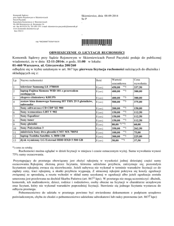 Komornik Sądowy przy Sądzie Rejonowym w Skierniewicach Paweł Pacyński Kancelaria Komornicza w Skierniewicach 96-100 Skierniewice ul. Reymonta 2A tel. /fax 46 8333176, 781 693 370 e-mail: [email protected] www.komornik-skierniewice.pl Km 194/13 Skierniewice, dnia 08-09-2014 Sz P . #ak *0020000778504*/0419/ *0020000778504* OBWIESZCZENIE O LICYTACJI RUCHOMOŚCI Komornik Sądowy przy Sądzie Rejonowym w Skierniewicach Paweł Pacyński podaje do publicznej wiadomości, że w dniu 12-11-2014r. o godz. 11:00 w lokalu: 01-460 Warszawa, ul. Górczewska 200/260 odbędzie się w trybie ustalonym w art. 867 kpc pierwsza licytacja ruchomości należących do dłużnika i składających się z: Lp. Nazwa ruchomości Ilość 1 2 telewizor Samsung LE 37R818 laptop Fujitsu Siemens WID 101 z przewodem zasilającym ekspres ciśnieniowy KRUPS zestaw kina domowego Samsung HT THX 25 5 głośników, subwoofer Sony odtwarzacz CD CDP XE 900 Sony wzmacniacz LBT V 902 Sony Equalizer Sony tuner Sony głośniki Sony Palystation 3 miniwieża Sony dwa głosniki CMT MX 700NI laptop Toshiba Satellite A 3850 13B dysk wymienny LG External HDD HXD 5 500 GB 1 [szt.] 1 [szt.] Wartość szacunkowa 450,00 **) 400,00 **) 1 [szt.] 1 [szt.] 400,00 500,00 **) 300,00 375,00 1 [szt.] 1 [szt.] 1 [szt.] 1 [szt.] 2 [szt.] 1 [szt.] 1 [szt.] 1 [szt.] 1 [szt.] 200,00 **) 150,00 **) 150,00 **) 150,00 **) 80,00 *) **) 350,00 **) 100,00 **) 300,00 **) 50,00 **) 150,00 112,50 112,50 112,50 60,00 262,50 75,00 225,00 37,50 3 4 5 6 7 8 9 10 11 12 13 **) Cena wywołania 337,50 300,00 *) cena za sztukę Ruchomości można oglądać w dzień licytacji w miejscu i czasie oznaczonym wyżej. Suma wywołania wynosi 75% sumy oszacowania. Przystępujący do przetargu obowiązany jest złożyć rękojmię w wysokości jednej dziesiątej części sumy oszacowania. Rękojmię złożoną przez licytanta, któremu udzielono przybicia, zatrzymuje się; pozostałym licytantom rękojmię zwraca się niezwłocznie. Jeżeli nabywca nie wykonał w terminie warunków licytacji co do zapłaty ceny, traci rękojmię, a skutki przybicia wygasają. Z utraconej rękojmi pokrywa się koszty egzekucji związanej ze sprzedażą, a reszta wchodzi w skład sumy uzyskanej w egzekucji albo jeżeli egzekucja została umorzona jest przelewana na dochód Skarbu Państwa (art. 8671 kpc). W przetargu nie mogą uczestniczyć: dłużnik, komornik, ich małżonkowie, dzieci, rodzice i rodzeństwo, osoby obecne na licytacji w charakterze urzędowym oraz licytant, który nie wykonał warunków poprzedniej licytacji. Stawienie się jednego licytanta wystarcza do odbycia przetargu. Pełnomocnictwo do udziału w przetargu powinno być stwierdzone dokumentem z podpisem urzędowo poświadczonym, chyba że chodzi o pełnomocnictwo udzielone adwokatowi lub radcy prawnemu (art. 8672 kpc) UWAGA:Licytacja może się nie odbyć bez podania przyczyny. Jeżeli drzwi będą zamknięte, będą otwierane na koszt i odpowiedzialność obowiązanegodłużnika. Łukasz Mąkolski Bartłomiej Reczek Anna Bartczak-Lisik Paweł Pacyński aplikant komorniczy asesor komorniczy asesor komorniczy komornik sądowy