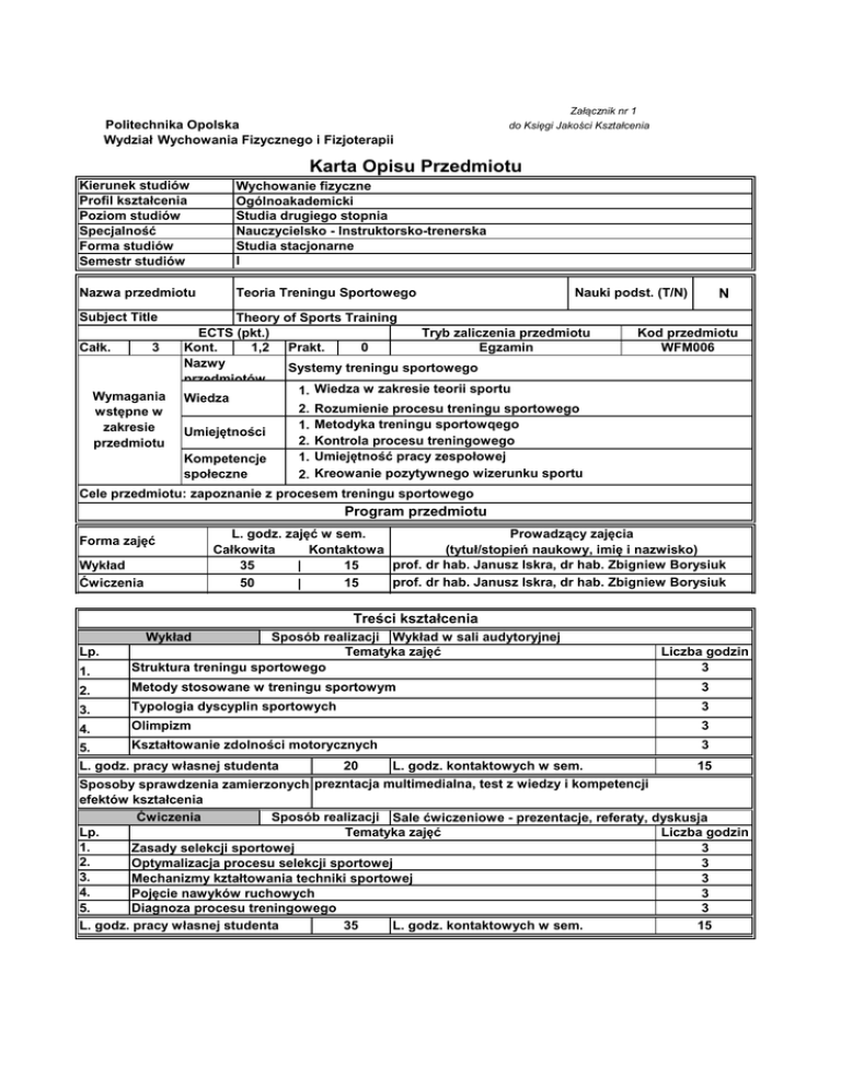 Załącznik nr 1 Politechnika Opolska Wydział Wychowania Fizycznego i Fizjoterapii do Księgi Jakości Kształcenia Karta Opisu Przedmiotu Kierunek studiów Profil kształcenia Poziom studiów Specjalność Forma studiów Semestr studiów Wychowanie fizyczne Ogólnoakademicki Studia drugiego stopnia Nauczycielsko - Instruktorsko-trenerska Studia stacjonarne I Nazwa przedmiotu Teoria Treningu Sportowego Subject Title Całk. 3 Wymagania wstępne w zakresie przedmiotu Nauki podst. (T/N) Theory of Sports Training ECTS (pkt.) Tryb zaliczenia przedmiotu Kont. 1,2 Prakt. 0 Egzamin Nazwy Systemy treningu sportowego przedmiotów 1. Wiedza w zakresie teorii sportu Wiedza 2. Rozumienie procesu treningu sportowego 3. 1. Metodyka treningu sportowqego Umiejętności 2. Kontrola procesu treningowego 3. 1. Umiejętność pracy zespołowej Kompetencje społeczne 2. Kreowanie pozytywnego wizerunku sportu N Kod przedmiotu WFM006 3. Cele przedmiotu: zapoznanie z procesem treningu sportowego Program przedmiotu Forma zajęć Wykład Ćwiczenia L. godz. zajęć w sem. Prowadzący zajęcia Całkowita Kontaktowa (tytuł/stopień naukowy, imię i nazwisko) prof. dr hab. Janusz Iskra, dr hab. Zbigniew Borysiuk 35 15 | prof. dr hab. Janusz Iskra, dr hab. Zbigniew Borysiuk 50 15 | | Treści kształcenia Wykład 1. Sposób realizacji Wykład w sali audytoryjnej Tematyka zajęć Struktura treningu sportowego 2. Metody stosowane w treningu sportowym 3 3. Typologia dyscyplin sportowych 3 4. Olimpizm 3 Lp. Kształtowanie zdolności motorycznych 5. L. godz. pracy własnej studenta 20 Liczba godzin 3 3 L. godz. kontaktowych w sem. 15 Sposoby sprawdzenia zamierzonych prezntacja multimedialna, test z wiedzy i kompetencji efektów kształcenia Ćwiczenia Sposób realizacji Sale ćwiczeniowe - prezentacje, referaty, dyskusja Lp. Tematyka zajęć Liczba godzin 1. Zasady selekcji sportowej 3 2. Optymalizacja procesu selekcji sportowej 3 3. Mechanizmy kztałtowania techniki sportowej 3 4. Pojęcie nawyków ruchowych 3 5. Diagnoza procesu treningowego 3 L. godz. pracy własnej studenta 35 L. godz. kontaktowych w sem. 15 Sposoby sprawdzenia zamierzonych zaliczenie na ocenę w formie testu Wiedza Efekty kształcenia dla przedmiotu - po zakończonym cyklu kształcenia Umiejętności Kompetencje społeczne K_U05 - Łączy postulaty działań edukacji zdrowotnej z samopromocją. Wykorzystuje swoje kompetencje, zdolności i 1. umiejętności sportowe do promowania aktywnych form spędzania czasu wolnego K_U05 - Łączy postulaty działań edukacji zdrowotnej z samopromocją. Wykorzystuje swoje kompetencje, zdolności i 1. umiejętności sportowe do promowania aktywnych form spędzania czasu wolnego. K_K01 - Rozumie potrzebę uniwersalnego doskonalenia się w zakresie kwalifikacji i kompetencji. Jest świadomy znaczenia 1. motywacji, systematyczności i staranności w aktywności poznawczej nauczyciela i podmiotu oddziaływania edukacyjnego 4. Metody dydaktyczne: Wykład, dyskusja problemowa, prezentacje multimedialne. Forma i warunki zaliczenia przedmiotu: Egzamin ustny, ćwiczenia w formie testowej. Literatura podstawowa: [1] Czajkowski Z. (1991) Nauczanie techniki sportowej,COS. Warszawa [2] Ryguła I.(2000) Optymalizacja treningu sportowqego.AWF Katowice. [3] [4] Sozański H. (1993) Podstawy treningu sportowego, COS Warszawa. Literatura uzupełniająca: [1] Ulatowski T.,(1976) Teoria sportu.AWF Warszawa. [2] Szopa J.,(1999) Zarys antropomotoryki. PWN Kraków. [3] [4] Ziemilska A.,(1983) Uwarunkowania szkolenia sportowego dzieci i młodzieży.RCMSz.Warzawa. ______________ * niewłaściwe przekreślić ………………………………………………….. ………………………………………………………. (kierownik jednostki organizacyjnej/bezpośredni przełożony: pieczęć/podpis (Dziekan Wydziału pieczęć/podpis)