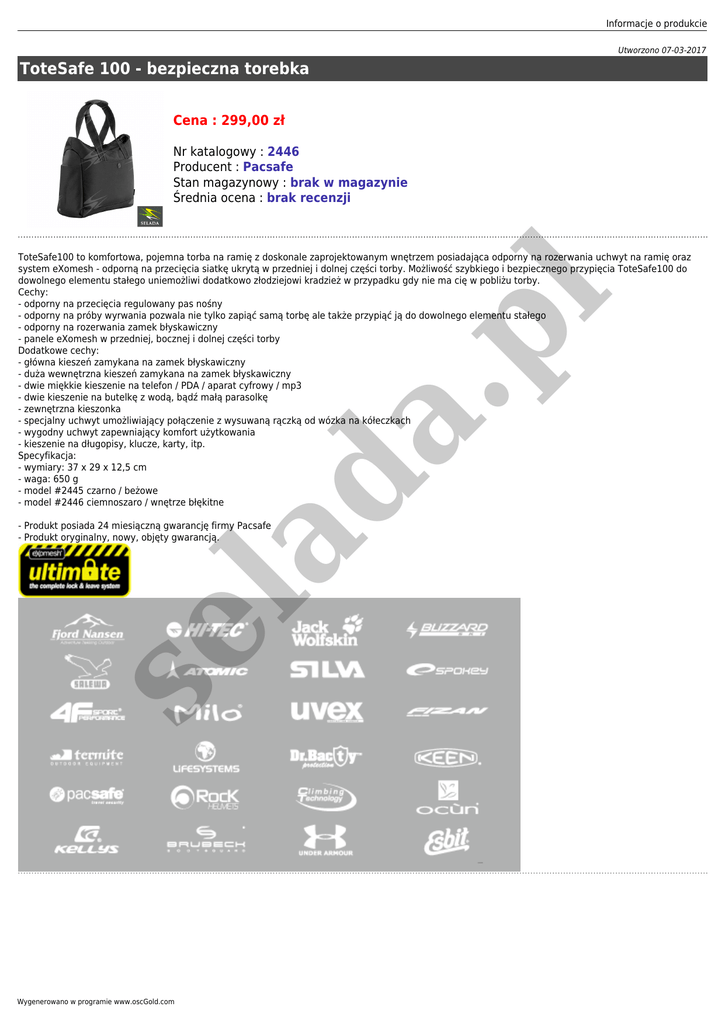 Informacje o produkcie Utworzono 07-03-2017 ToteSafe 100 - bezpieczna torebka Cena : 299,00 zł Nr katalogowy : 2446 Producent : Pacsafe Stan magazynowy : brak w magazynie Średnia ocena : brak recenzji da .p l ToteSafe100 to komfortowa, pojemna torba na ramię z doskonale zaprojektowanym wnętrzem posiadająca odporny na rozerwania uchwyt na ramię oraz system eXomesh - odporną na przecięcia siatkę ukrytą w przedniej i dolnej części torby. Możliwość szybkiego i bezpiecznego przypięcia ToteSafe100 do dowolnego elementu stałego uniemożliwi dodatkowo złodziejowi kradzież w przypadku gdy nie ma cię w pobliżu torby. Cechy: - odporny na przecięcia regulowany pas nośny - odporny na próby wyrwania pozwala nie tylko zapiąć samą torbę ale także przypiąć ją do dowolnego elementu stałego - odporny na rozerwania zamek błyskawiczny - panele eXomesh w przedniej, bocznej i dolnej części torby Dodatkowe cechy: - główna kieszeń zamykana na zamek błyskawiczny - duża wewnętrzna kieszeń zamykana na zamek błyskawiczny - dwie miękkie kieszenie na telefon / PDA / aparat cyfrowy / mp3 - dwie kieszenie na butelkę z wodą, bądź małą parasolkę - zewnętrzna kieszonka - specjalny uchwyt umożliwiający połączenie z wysuwaną rączką od wózka na kółeczkach - wygodny uchwyt zapewniający komfort użytkowania - kieszenie na długopisy, klucze, karty, itp. Specyfikacja: - wymiary: 37 x 29 x 12,5 cm - waga: 650 g - model #2445 czarno / beżowe - model #2446 ciemnoszaro / wnętrze błękitne se la - Produkt posiada 24 miesiączną gwarancję firmy Pacsafe - Produkt oryginalny, nowy, objęty gwarancją. Wygenerowano w programie www.oscGold.com