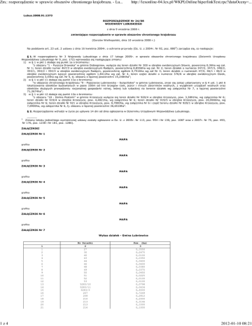 Zm.: rozporządzenie w sprawie obszarów chronionego krajobrazu. - Lu... 1z4 http://lexonline-04.lex.pl/WKPLOnline/hiperlinkText.rpc?dataOceny=... Lubus.2008.91.1373 ROZPORZĄDZENIE Nr 24/08 WOJEWODY LUBUSKIEGO z dnia 9 września 2008 r. zmieniające rozporządzenie w sprawie obszarów chronionego krajobrazu (Gorzów Wielkopolski, dnia 10 września 2008 r.) Na podstawie art. 23 ust. 2 ustawy z dnia 16 kwietnia 2004r. o ochronie przyrody (Dz. U. z 2004r. Nr 92, poz. 8801) zarządza się, co następuje: § 1. W rozporządzeniu Nr 3 Wojewody Lubuskiego z dnia 17 lutego 2005r. w sprawie obszarów chronionego krajobrazu (Dziennik Urzędowy Województwa Lubuskiego Nr 9, poz. 172) wprowadza się następujące zmiany: 1) w § 1 w pkt 1 dodaje się punkt 1a o brzmieniu: "z obszaru "1 - Puszcza Drawska" w gminie Dobiegniew, wyłącza się teren działki Nr 300 w obrębie ewidencyjnym Słowin, powierznię 0,36ha wg zał. Nr 1; teren działki numer 467/3 w obrębie ewidencyjnym Radęcin, powierzchnię 8,8556ha wg zał. Nr 2; teren działek o numerze 347/2, 347/3, 348/2, 353/1, 354/2 i 354/3 w obrębie ewidencyjnym Radęcin, powierzchnię ogółem 0,7516ha wg zał Nr 3; teren działek o numerach 47/4, 46/1 i 46/2 w obrębie ewidencyjnym Łęczyn powierzchnię ogółem 1,8412ha wg zał. Nr 4, teren części działki o numerze 376/6 w obrębie ewidencyjnym Osiek, powierzchnię 3,44ha wg zał. Nr 5, tj. obszaru o łącznej powierzchni 15,2484ha"; 2) w § 1 w pkt 11 dodaje się punkt 11a o brzmieniu: "w obszarze chronionego krajobrazu "9 - Pojezierze Lubniewicko - Sulęcińskie" w gminie Lubniewice, znosi się zakaz ustanowiony w § 4 ust. 1 pkt 6 lokalizowania obiektów budowlanych w pasie 100m od linii brzegów rzek, jezior i innych zbiorników wodnych, z wyjątkiem urządzeń wodnych oraz obiektów służących prowadzeniu racjonalnej gospodarki rolnej, leśnej lub rybackiej na terenie działek wg załącznika Nr 7, o łącznej powierzchni 71,3674ha"; 3) w § 1 w pkt 12 dodaje się punkt 12a o brzmieniu: "z obszaru "10 - Dolina Postomi" w gminie Krzeszyce wyłącza się teren działki Nr 920/4 w obrębie Krzeszyce, pow. 3,3891ha, wg załącznika Nr 6; teren działki Nr 919/4 w obrębie Krzeszyce, pow. 4,4821ha, wg załącznika Nr 6; teren działki Nr 919/5 w obrębie Krzeszyce, pow. 20,9906ha, wg załącznika Nr 6; teren działki Nr 921 w obrębie Krzeszyce, pow. 0,7000ha, wg załącznika Nr 6 i część terenu działki Nr 920/1 w obrębie Krzeszyce, pow. 7,0900ha, wg załącznika Nr 6, tj. obszaru o łącznej powierzchni 36,6518ha". § 2. Rozporządzenie wchodzi w życie po upływie 14 dni od dnia ogłoszenia w Dzienniku Urzędowym Województwa Lubuskiego. ______ Zmiany tekstu jednolitego wymienionej ustawy zostały ogłoszone w Dz. U. z 2005r. Nr 113, poz. 954 i Nr 130, poz. 1087 oraz z 2007r. Nr 75, poz. 493, Nr 176, poz. 1238 i Nr 181, poz. 1286). 1 ZAŁĄCZNIKI ZAŁĄCZNIK Nr 1 MAPA grafika ZAŁĄCZNIK Nr 2 MAPA grafika ZAŁĄCZNIK Nr 3 MAPA grafika ZAŁĄCZNIK Nr 4 MAPA grafika ZAŁĄCZNIK Nr 5 MAPA grafika ZAŁĄCZNIK Nr 6 MAPA grafika ZAŁĄCZNIK Nr 7 Wykaz działek - Gmina Lubniewice 1 1 2 3 4 5 6 7 8 9 10 11 12 13 14 15 16 17 18 19 20 21 Nr Działki 2 27 30 40 43 44 46 48 49 50 51 52 53 5283/10 5283/11 5283/3 207 208 210 213 213 216 Pow. (ha) 3 0,3550 0,2475 0,0100 0,0350 0,0400 0,0600 0,0380 0,0375 0,0450 0,0225 0,0100 0,0100 0,0798 0,0634 0,4500 0,7249 0,2812 0,2000 0,3146 0,3300 0,1000 2012-01-10 08:21 Zm.: rozporządzenie w sprawie obszarów chronionego krajobrazu. - Lu... 2z4 22 23 24 25 26 27 28 29 30 31 32 33 34 35 36 37 38 39 40 41 42 43 44 45 46 47 48 49 50 51 52 53 54 55 56 57 58 59 60 61 62 63 64 65 66 67 68 69 70 71 72 73 74 75 76 77 78 79 80 81 82 83 84 85 86 87 88 89 90 91 92 93 94 95 96 97 98 99 100 101 102 103 104 105 106 107 108 109 110 111 112 113 114 115 116 117 118 119 120 121 122 217 223 225 228 229 230 231 232 234 235 237 239 241 242 243 250 260 261 262 263 264 265 266 267 268 269 271 273 274 275 276 277 278 279 280 281 289 290 291 292 294 295 296 297 298 299 300 301 302 303 304 305 306 309 310 312 313 316 317 318 319 320 332 335 336 337 340 343 344 345 346 347 348 349 350 351 352 353 354 357 359 360 361 362 364 365 366 366 367 368 368 369 370 371 387 393 394 399 401 438 456 http://lexonline-04.lex.pl/WKPLOnline/hiperlinkText.rpc?dataOceny=... 0,0050 0,9000 0,0650 0,1900 0,1500 0,1490 0,1900 0,1800 0,0100 0,1250 0,2250 0,1350 0,0713 0,0712 0,3600 0,0875 0,0216 0,0315 0,0358 1,0186 0,0195 0,0731 0,1701 0,2101 0,0271 0,0703 0,0662 0,1053 0,0890 0,0876 0,0914 0,0911 0,0923 0,0943 0,1356 0,0380 0,0882 0,0831 0,6100 0,4800 0,3450 0,3450 0,2844 0,7797 0,0982 0,0845 0,0798 0,0799 0,0333 0,3596 0,0107 0,0241 0,0107 0,0310 0,1415 0,4647 0,0497 0,1963 0,2494 0,3392 0,0653 0,0659 0,0340 0,1577 0,2746 0,2562 0,0344 0,0351 0,0108 0,1525 0,0736 0,0156 0,0556 0,0548 0,0729 0,1451 0,0409 0,0624 0,0984 0,0531 0,1423 0,1526 0,0877 0,0909 0,2238 0,2567 0,0726 0,0250 0,0499 0,1164 0,0300 0,6960 0,4050 0,3350 0,0100 0,0200 0,0450 0,0100 0,0200 0,0225 0,0337 2012-01-10 08:21 Zm.: rozporządzenie w sprawie obszarów chronionego krajobrazu. - Lu... 3z4 123 124 125 126 127 128 129 130 131 132 133 134 135 136 137 138 139 140 141 142 143 144 145 146 147 148 149 150 151 152 153 154 155 156 157 158 159 160 161 162 163 164 165 166 167 168 169 170 171 172 173 174 175 176 177 178 179 180 181 182 183 184 185 186 187 188 189 190 191 192 193 194 195 196 197 198 199 200 201 202 203 204 205 206 207 208 209 210 211 212 213 214 215 216 217 218 219 220 221 222 223 468 469 474 475 476 477 485 486 488 490 491 492 494 495 496 497 498 499 503 504 505 506 507 508 509 510 511 512 513 514 515 516 520 522 523 524 525 526 527 528 529 530 535 536 537 538 539 540 542 544 545 546 547 548 549 551 552 553 554 555 556 557 558 559 560 561 562 563 565 567 569 570 5307/5 572 5284/1 5284/4 575 597 599 600 601 631 632 633 647 648 678 695 696 697 699 700 702 703 704 705 707 713 714 836 871 http://lexonline-04.lex.pl/WKPLOnline/hi
