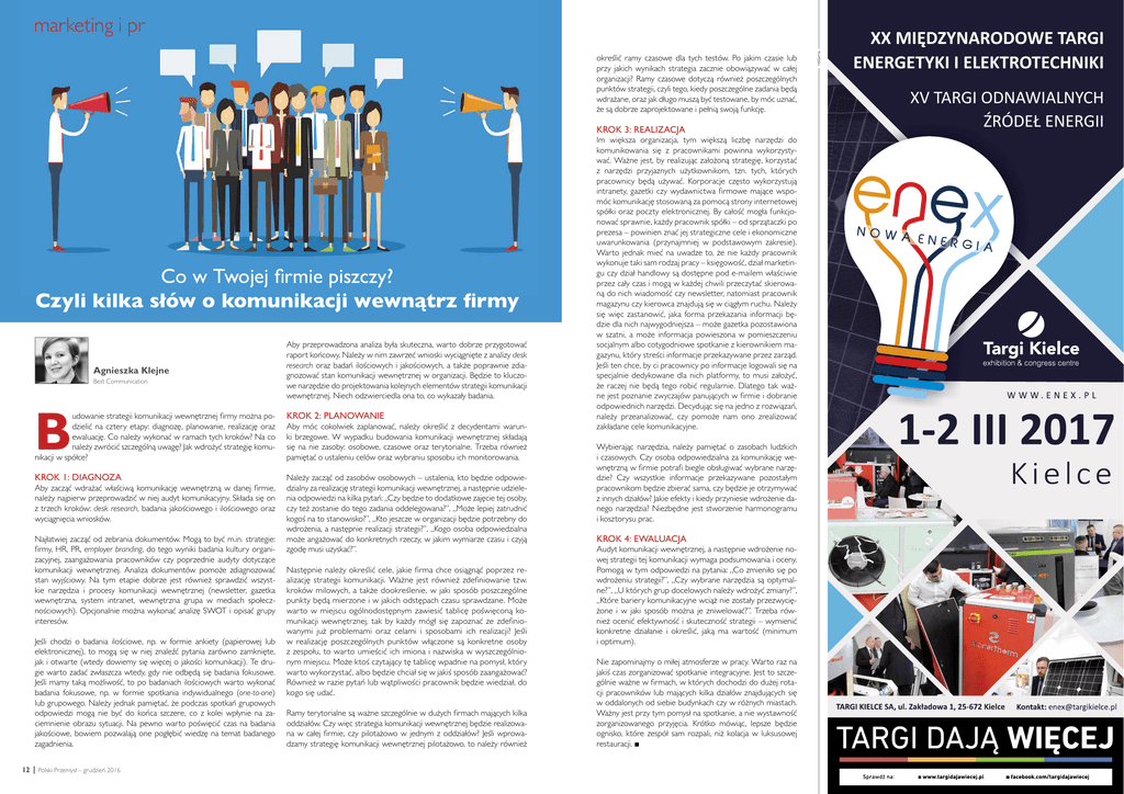 określić ramy czasowe dla tych testów. Po jakim czasie lub przy jakich wynikach strategia zacznie obowiązywać w całej organizacji? Ramy czasowe dotyczą również poszczególnych punktów strategii, czyli tego, kiedy poszczególne zadania będą wdrażane, oraz jak długo muszą być testowane, by móc uznać, że są dobrze zaprojektowane i pełnią swoją funkcję. KROK 3: REALIZACJA Co w Twojej firmie piszczy? Czyli kilka słów o komunikacji wewnątrz firmy Agnieszka Klejne Best Communication B Aby przeprowadzona analiza była skuteczna, warto dobrze przygotować raport końcowy. Należy w nim zawrzeć wnioski wyciągnięte z analizy desk research oraz badań ilościowych i jakościowych, a także poprawnie zdiagnozować stan komunikacji wewnętrznej w organizacji. Będzie to kluczowe narzędzie do projektowania kolejnych elementów strategii komunikacji wewnętrznej. Niech odzwierciedla ona to, co wykazały badania. udowanie strategii komunikacji wewnętrznej firmy można podzielić na cztery etapy: diagnozę, planowanie, realizację oraz ewaluację. Co należy wykonać w ramach tych kroków? Na co należy zwrócić szczególną uwagę? Jak wdrożyć strategię komunikacji w spółce? KROK 2: PLANOWANIE KROK 1: DIAGNOZA Należy zacząć od zasobów osobowych – ustalenia, kto będzie odpowiedzialny za realizację strategii komunikacji wewnętrznej, a następnie udzielenia odpowiedzi na kilka pytań: „Czy będzie to dodatkowe zajęcie tej osoby, czy też zostanie do tego zadania oddelegowana?”, „Może lepiej zatrudnić kogoś na to stanowisko?”, „Kto jeszcze w organizacji będzie potrzebny do wdrożenia, a następnie realizacji strategii?”, „Kogo osoba odpowiedzialna może angażować do konkretnych rzeczy, w jakim wymiarze czasu i czyją zgodę musi uzyskać?”. Aby zacząć wdrażać właściwą komunikację wewnętrzną w danej firmie, należy najpierw przeprowadzić w niej audyt komunikacyjny. Składa się on z trzech kroków: desk research, badania jakościowego i ilościowego oraz wyciągnięcia wniosków. Najłatwiej zacząć od zebrania dokumentów. Mogą to być m.in. strategie: firmy, HR, PR, employer branding, do tego wyniki badania kultury organizacyjnej, zaangażowania pracowników czy poprzednie audyty dotyczące komunikacji wewnętrznej. Analiza dokumentów pomoże zdiagnozować stan wyjściowy. Na tym etapie dobrze jest również sprawdzić wszystkie narzędzia i procesy komunikacji wewnętrznej (newsletter, gazetka wewnętrzna, system intranet, wewnętrzna grupa w mediach społecznościowych). Opcjonalnie można wykonać analizę SWOT i opisać grupy interesów. Jeśli chodzi o badania ilościowe, np. w formie ankiety (papierowej lub elektronicznej), to mogą się w niej znaleźć pytania zarówno zamknięte, jak i otwarte (wtedy dowiemy się więcej o jakości komunikacji). Te drugie warto zadać zwłaszcza wtedy, gdy nie odbędą się badania fokusowe. Jeśli mamy taką możliwość, to po badaniach ilościowych warto wykonać badania fokusowe, np. w formie spotkania indywidualnego (one-to-one) lub grupowego. Należy jednak pamiętać, że podczas spotkań grupowych odpowiedzi mogą nie być do końca szczere, co z kolei wpłynie na zaciemnienie obrazu sytuacji. Na pewno warto poświęcić czas na badania jakościowe, bowiem pozwalają one pogłębić wiedzę na temat badanego zagadnienia. 12 | Polski Przemysł – grudzień 2016 Aby móc cokolwiek zaplanować, należy określić z decydentami warunki brzegowe. W wypadku budowania komunikacji wewnętrznej składają się na nie zasoby: osobowe, czasowe oraz terytorialne. Trzeba również pamiętać o ustaleniu celów oraz wybraniu sposobu ich monitorowania. Następnie należy określić cele, jakie firma chce osiągnąć poprzez realizację strategii komunikacji. Ważne jest również zdefiniowanie tzw. kroków milowych, a także dookreślenie, w jaki sposób poszczególne punkty będą mierzone i w jakich odstępach czasu sprawdzane. Może warto w miejscu ogólnodostępnym zawiesić tablicę poświęconą komunikacji wewnętrznej, tak by każdy mógł się zapoznać ze zdefiniowanymi już problemami oraz celami i sposobami ich realizacji? Jeśli w realizację poszczególnych punktów włączone są konkretne osoby z zespołu, to warto umieścić ich imiona i nazwiska w wyszczególnionym miejscu. Może ktoś czytający tę tablicę wpadnie na pomysł, który warto wykorzystać, albo będzie chciał się w jakiś sposób zaangażować? Również w razie pytań lub wątpliwości pracownik będzie wiedział, do kogo się udać. Ramy terytorialne są ważne szczególnie w dużych firmach mających kilka oddziałów. Czy więc strategia komunikacji wewnętrznej będzie realizowana w całej firmie, czy pilotażowo w jednym z oddziałów? Jeśli wprowadzamy strategię komunikacji wewnętrznej pilotażowo, to należy również Im większa organizacja, tym większą liczbę narzędzi do komunikowania się z pracownikami powinna wykorzystywać. Ważne jest, by realizując założoną strategię, korzystać z narzędzi przyjaznych użytkownikom, tzn. tych, których pracownicy będą używać. Korporacje często wykorzystują intranety, gazetki czy wydawnictwa firmowe mające wspomóc komunikację stosowaną za pomocą strony internetowej spółki oraz poczty elektronicznej. By całość mogła funkcjonować sprawnie, każdy pracownik spółki – od sprzątaczki po prezesa – powinien znać jej strategiczne cele i ekonomiczne uwarunkowania (przynajmniej w podstawowym zakresie). Warto jednak mieć na uwadze to, że nie każdy pracownik wykonuje taki sam rodzaj pracy – księgowość, dział marketingu czy dział handlowy są dostępne pod e-mailem właściwie przez cały czas i mogą w każdej chwili przeczytać skierowaną do nich wiadomość czy newsletter, natomiast pracownik magazynu czy kierowca znajdują się w ciągłym ruchu. Należy się więc zastanowić, jaka forma przekazania informacji będ