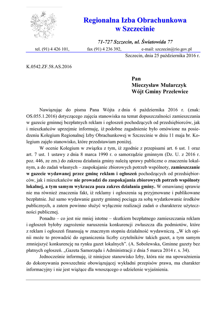 Regionalna Izba Obrachunkowa w Szczecinie 71-727 Szczecin, ul. Światowida 77 tel. (91) 4 426 101, fax (91) 4 236 392, e-mail: [email protected] Szczecin, dnia 25 października 2016 r. K.0542.ZF.58.AS.2016 Pan Mieczysław Mularczyk Wójt Gminy Przelewice Nawiązując do pisma Pana Wójta z dnia 6 października 2016 r. (znak: OS.055.1.2016) dotyczącego zajęcia stanowiska na temat dopuszczalności zamieszczania w gazecie gminnej bezpłatnych reklam i ogłoszeń pochodzących od przedsiębiorców, jak i mieszkańców uprzejmie informuję, iż podobne zagadnienie było omówione na posiedzeniu Kolegium Regionalnej Izby Obrachunkowej w Szczecinie w dniu 11 maja br. Kolegium zajęło stanowisko, które przedstawiam poniżej. W ocenie Kolegium w związku z tym, iż zgodnie z przepisami art. 6 ust. 1 oraz art. 7 ust. 1 ustawy z dnia 8 marca 1990 r. o samorządzie gminnym (Dz. U. z 2016 r. poz. 446, ze zm.) do zakresu działania gminy należą sprawy publiczne o znaczeniu lokalnym, a do zadań własnych – zaspokajanie zbiorowych potrzeb wspólnoty, zamieszczanie w gazecie wydawanej przez gminę reklam i ogłoszeń pochodzących od przedsiębiorców, jak i mieszkańców nie prowadzi do zaspokajania zbiorowych potrzeb wspólnoty lokalnej, a tym samym wykracza poza zakres działania gminy. W omawianej sprawie nie ma również znaczenia fakt, iż reklamy i ogłoszenia są przyjmowane i publikowane bezpłatnie. Już samo wydawanie gazety gminnej pociąga za sobą wydatkowanie środków publicznych, a zatem powinno służyć wyłącznie realizacji zadań o charakterze użyteczności publicznej. Ponadto – co jest nie mniej istotne – skutkiem bezpłatnego zamieszczania reklam i ogłoszeń byłoby zagrożenie naruszenia konkurencji zwłaszcza dla podmiotów, które z reklam i ogłoszeń finansują w znacznym stopniu działalność wydawniczą. „W ich opinii może to prowadzić do ograniczenia liczby czytelników takich gazet, a tym samym zmniejszyć konkurencję na rynku gazet lokalnych”. (A. Sobolewska, Gminne gazety bez płatnych ogłoszeń. „Gazeta Samorządu i Administracji z dnia 5 marca 2014 r. s. 34). Jednocześnie informuję, iż niniejsze stanowisko Izby, która nie ma upoważnienia do dokonywania powszechnie obowiązującej wykładni przepisów prawa, ma charakter informacyjny i nie jest wiążące dla wnoszącego o udzielenie wyjaśnienia.