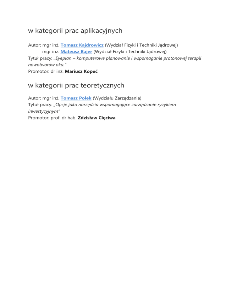 w kategorii prac aplikacyjnych Autor: mgr inż. Tomasz Kajdrowicz (Wydział Fizyki i Techniki Jądrowej) mgr inż. Mateusz Bajer (Wydział Fizyki i Techniki Jądrowej) Tytuł pracy: „Eyeplan – komputerowe planowanie i wspomaganie protonowej terapii nowotworów oka.” Promotor: dr inż. Mariusz Kopeć w kategorii prac teoretycznych Autor: mgr inż. Tomasz Polek (Wydziału Zarządzania) Tytuł pracy: „Opcje jako narzędzia wspomagające zarządzanie ryzykiem inwestycyjnym” Promotor: prof. dr hab. Zdzisław Cięciwa Mateusz Bajer Mgr inż. Mateusz Bajer, ur. w 1976 w Krakowie. W latach 1991-1995 był uczniem krakowskiego II Liceum Ogólnokształcącego im. Króla Jana III Sobieskiego w klasie o profilu matematyczno-fizycznym. Egzamin maturalny złożył z wyróżnieniem. Studia o kierunku Fizyka Techniczna i specjalności Fizyka Komputerowa rozpoczął na Wydziale Fizyki i Techniki Jądrowej Akademii Górniczo-Hutniczej. Ukończył je w roku 2000 z wyróżnieniem, jako jeden z najlepszych studentów swojego wydziału i Akademii. Praca magisterska pt. „Eyeplan. Komputerowe planowanie i wspomaganie protonowej terapii nowotworów oka”, której współautorem jest mgr inż. Tomasz Kajdrowicz, a opiekunem był dr Mariusz Kopeś, została oceniona celująco. Realizacja aplikacji stanowiącej integralną część wspomnianej pracy, trwała ponad dwa lata i odbywała się przy współpracy z Hahn-Meitner Institut w Berlinie i Instytutem Fizyki Jądrowej im. Henryka Niewodniczańskiego w Krakowie. Powstały program autorzy zaprezentowali we wrześniu 2000 roku na międzynarodowej XXXIII konferencji PTCOG (Proton Therapy Co-Operative Group) w Berlinie, gdzie przyjęto go z wielkim zainteresowaniem. Obecnie jest testowany w kilku ośrodkach naukowych w Europie, m.in. w Wielkiej Brytanii, w Niemczech, we Włoszech, a także w Rosji. Tomasz Kajdrowicz Mgr inż. Tomasz Kajdrowicz, ur. w 1976 w Sosnowcu. Od roku 1991 uczęszczał do Katolickiego Liceum Ogólnokształcącego im. św. Jana Bosko w Sosnowcu. Naukę w klasie o profilu matematyczno-fizycznym ukończył w roku 1995 egzaminem maturalnym. Następnie rozpoczął studia na Wydziale Fizyki i Techniki Jądrowej Akademii Górniczo-Hutniczej. Tytuł magistra Fizyki Technicznej uzyskał w roku 2000. Obecnie jest słuchaczem pierwszego roku studiów doktoranckich Fizyki Komputerowej na WFiTJ AGH. Wspólnie z mgr inż. Mateuszem Bajerem jest autorem pracy magisterskiej pt. „Eyeplan. Komputerowe planowanie i wspomaganie protonowej terapii nowotworów oka”. Pod opieką dr Mariusza Kopecia (WFiTJ) i dzięki pomocy dr Pawła Olko z Instytutu Fizyki Jądrowej im. Henryka Niewodniczańskiego w Krakowie oraz dr Joergena Heese z Hahn-Meitner Institut w Berlinie powstała aplikacja, która ma szanse zostać wykorzystana do planowania terapii protonowej guzów oka. Zainteresowanie programem wyraził już krakowski IFJ, w którym w najlbliższych latach rozpocznie się leczenie pierwszych pacjentów. We wrześniu 2000 roku autorzy zaprezentowali aplikację podczas XXXIII konferencji PTCOG (Proton Therapy Co-Operative Group) w Berlinie. Pozytywne reakcje międzynarodowego środowiska terapeutycznego zaowocowały odbywającymi się obecnie testami programu w kilku ośrodkach na świecie. Tomasz Polek Mgr inż. Tomasz Polek, ur. w 1976 w Krakowie. Po ukończeniu III Liceum Ogólnokształcącego im. Jana Kochanowskiego o profilu matematyczno – fizyczno -chemicznym w Krakowie rozpoczął studia o kierunku Zarządzanie Finansami na Wydziale Zarządzania Akademii Górniczo-Hutniczej. Studia ukończył z wyróżnieniem plasując się w 5% najlepszych studentów uczelni. Stypendysta programu Socrates/Erasmus na The Univerity of Teesside w Middlesbrough. Podczas pobytu w Anglii pogłębiał swoją wiedzę odbywając staż w firmie brokerskiej Greig Middleton Ltd na stanowisku asystenta maklera. Praca magisterska pt.: „Opcje jako narzędzia wspomagające zarządzanie ryzykiem inwestycyjnym” pod kierunkiem prof. dr hab. Zdzisława Cięciwy została oceniona celująco. Po ukończeniu studiów rozpoczął pracę jako analityk finansowy w centrum finansowym TESCO Polska Sp. z.o.o. Równocześnie zakwalifikował się na studia doktoranckie na Wydziale Górniczym, gdzie zamierza poszerzać swoje zainteresowania w dziedzinie zarządzania ryzykiem na giełdach towarowych, surowców i energii przy użyciu instrumentów pochodnych.