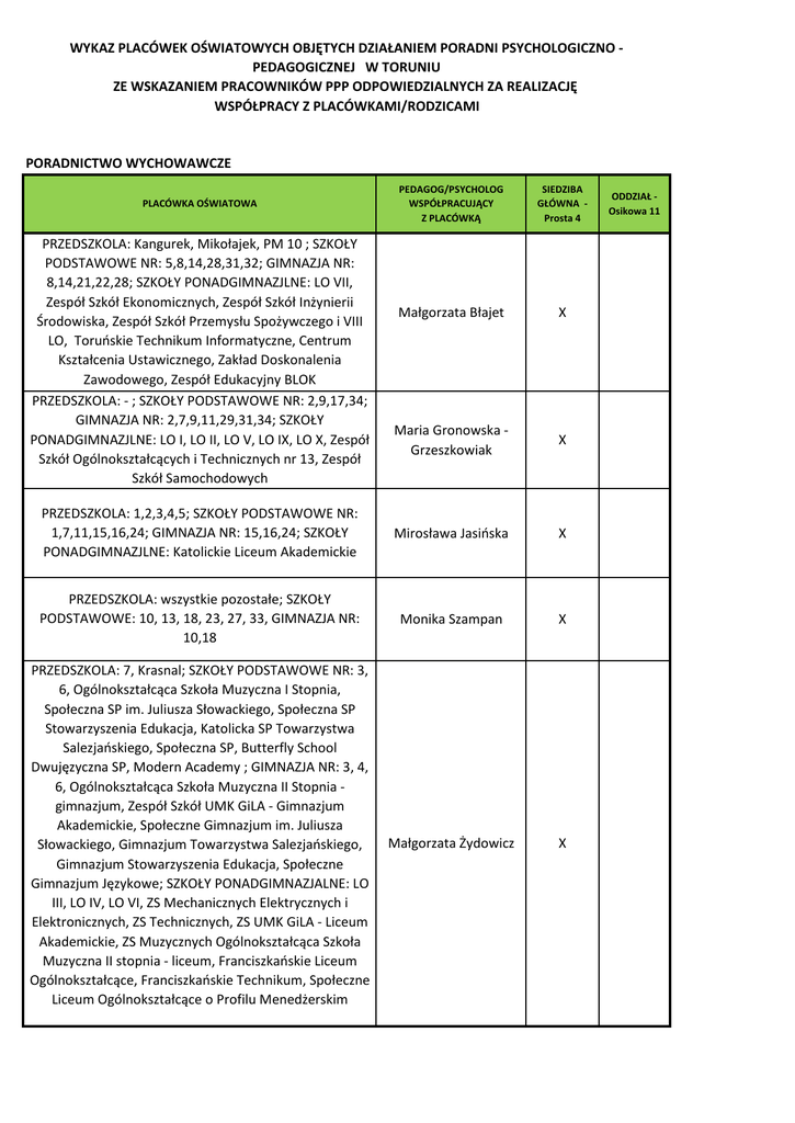 WYKAZ PLACÓWEK OŚWIATOWYCH OBJĘTYCH DZIAŁANIEM PORADNI PSYCHOLOGICZNO PEDAGOGICZNEJ W TORUNIU ZE WSKAZANIEM PRACOWNIKÓW PPP ODPOWIEDZIALNYCH ZA REALIZACJĘ WSPÓŁPRACY Z PLACÓWKAMI/RODZICAMI PORADNICTWO WYCHOWAWCZE PEDAGOG/PSYCHOLOG WSPÓŁPRACUJĄCY Z PLACÓWKĄ SIEDZIBA GŁÓWNA Prosta 4 Małgorzata Błajet X Maria Gronowska Grzeszkowiak X PRZEDSZKOLA: 1,2,3,4,5; SZKOŁY PODSTAWOWE NR: 1,7,11,15,16,24; GIMNAZJA NR: 15,16,24; SZKOŁY PONADGIMNAZJLNE: Katolickie Liceum Akademickie Mirosława Jasińska X PRZEDSZKOLA: wszystkie pozostałe; SZKOŁY PODSTAWOWE: 10, 13, 18, 23, 27, 33, GIMNAZJA NR: 10,18 Monika Szampan X Małgorzata Żydowicz X PLACÓWKA OŚWIATOWA PRZEDSZKOLA: Kangurek, Mikołajek, PM 10 ; SZKOŁY PODSTAWOWE NR: 5,8,14,28,31,32; GIMNAZJA NR: 8,14,21,22,28; SZKOŁY PONADGIMNAZJLNE: LO VII, Zespół Szkół Ekonomicznych, Zespół Szkół Inżynierii Środowiska, Zespół Szkół Przemysłu Spożywczego i VIII LO, Toruńskie Technikum Informatyczne, Centrum Kształcenia Ustawicznego, Zakład Doskonalenia Zawodowego, Zespół Edukacyjny BLOK PRZEDSZKOLA: - ; SZKOŁY PODSTAWOWE NR: 2,9,17,34; GIMNAZJA NR: 2,7,9,11,29,31,34; SZKOŁY PONADGIMNAZJLNE: LO I, LO II, LO V, LO IX, LO X, Zespół Szkół Ogólnokształcących i Technicznych nr 13, Zespół Szkół Samochodowych PRZEDSZKOLA: 7, Krasnal; SZKOŁY PODSTAWOWE NR: 3, 6, Ogólnokształcąca Szkoła Muzyczna I Stopnia, Społeczna SP im. Juliusza Słowackiego, Społeczna SP Stowarzyszenia Edukacja, Katolicka SP Towarzystwa Salezjańskiego, Społeczna SP, Butterfly School Dwujęzyczna SP, Modern Academy ; GIMNAZJA NR: 3, 4, 6, Ogólnokształcąca Szkoła Muzyczna II Stopnia gimnazjum, Zespół Szkół UMK GiLA - Gimnazjum Akademickie, Społeczne Gimnazjum im. Juliusza Słowackiego, Gimnazjum Towarzystwa Salezjańskiego, Gimnazjum Stowarzyszenia Edukacja, Społeczne Gimnazjum Językowe; SZKOŁY PONADGIMNAZJALNE: LO III, LO IV, LO VI, ZS Mechanicznych Elektrycznych i Elektronicznych, ZS Technicznych, ZS UMK GiLA - Liceum Akademickie, ZS Muzycznych Ogólnokształcąca Szkoła Muzyczna II stopnia - liceum, Franciszkańskie Liceum Ogólnokształcące, Franciszkańskie Technikum, Społeczne Liceum Ogólnokształcące o Profilu Menedżerskim ODDZIAŁ Osikowa 11