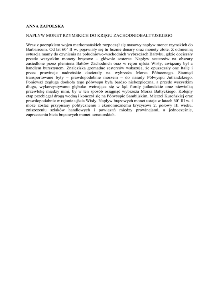 ANNA ZAPOLSKA NAPŁYW MONET RZYMSKICH DO KRĘGU ZACHODNIOBAŁTYJSKIEGO Wraz z początkiem wojen markomańskich rozpoczął się masowy napływ monet rzymskich do Barbaricum. Od lat 60’ II w. pojawiały się tu licznie denary oraz monety złote. Z odmienną sytuacją mamy do czynienia na południowo-wschodnich wybrzeżach Bałtyku, gdzie docierały przede wszystkim monety brązowe – głównie sesterce. Napływ sesterców na obszary zasiedlone przez plemiona Bałtów Zachodnich oraz w rejon ujścia Wisły, związany był z handlem bursztynem. Znaleziska gromadne sesterców wskazują, że opuszczały one Italię i przez prowincje nadreńskie docierały na wybrzeża Morza Północnego. Stamtąd transportowane były – prawdopodobnie morzem – do nasady Półwyspu Jutlandzkiego. Ponieważ żegluga dookoła tego półwyspu była bardzo niebezpieczna, a przede wszystkim długa, wykorzystywano głęboko wcinające się w ląd fiordy jutlandzkie oraz niewielką przewłokę między nimi, by w ten sposób osiągnąć wybrzeża Morza Bałtyckiego. Kolejny etap przebiegał drogą wodną i kończył się na Półwyspie Sambijskim, Mierzei Kurońskiej oraz prawdopodobnie w rejonie ujścia Wisły. Napływ brązowych monet ustaje w latach 60’ III w. i może zostać przypisany politycznemu i ekonomicznemu kryzysowi 2. połowy III wieku, zniszczeniu szlaków handlowych i powiązań między prowincjami, a jednocześnie, zaprzestaniu bicia brązowych monet senatorskich.
