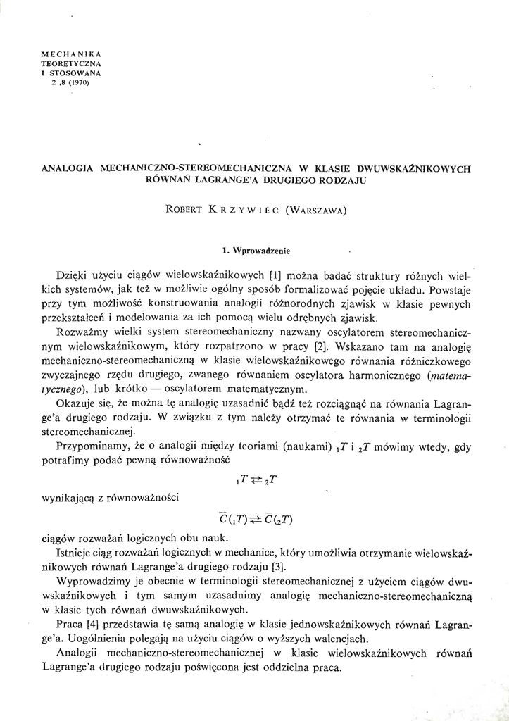 M E C H A N I K A T E O R E T Y C Z N A I S T O S O W A N A 2 ,8 (1970) A N A L O G I A M E C H A N I C Z N O S T E R E O M E C H A N I C Z N A W K L A S I E R Ó W N A Ń L A G R A N G E ' A D R U G I E G O D W U W S K A Ż N I K O W Y CH R O D Z A J U R O B E R T К R Z Y W I E С ( W A R S Z A W A ) 1. Wprowadzenie Dzię ki uż yciu cią gów wielowskaź nikowych [1] m o ż na badać struktury róż nych wiel