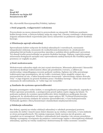 Do: Rząd RP Posłowie na Sejm RP Senatorowie RP My, obywatelki Rzeczypospolitej Polskiej, żądamy: 1 Dość pogardy, wulgarności i seksizmu Przyzwolenie na mowę nienawiści to przyzwolenie na nienawiść. Publiczne poniżanie kobiet kreuje świat, w którym kobiety mają się czego bać. Chcemy rzetelnego i skutecznego ścigania seksistowskich wypowiedzi jako mowy nienawiści na podstawie zapisów Kodeksu karnego. 2 Eliminacja agresji seksualnej Sprowadzanie kobiet wyłącznie do funkcji seksualnych i rozrodczych, naruszanie integralności cielesnej, zmuszanie do wysłuchiwania komentarzy nt. atrakcyjności seksualnej lub jej braku to powszechne zjawiska w polskiej sferze publicznej i prywatnej. Tej obsesji trzeba przeciwdziałać na gruncie Kodeksu karnego. Żądamy rygorystycznego stosowania dostępnych narzędzi oraz wprowadzenia sankcji karnych dla wszelkiej agresji i przemocy ze względu na płeć. 3 Dość molestowania Molestowanie seksualne nigdy nie jest czymś niewinnym. Mieszanie płciowości i hierarchii zawodowej skutkuje traktowaniem ofiary jak przedmiotu i towaru, a odbiera jej niezbywalną i niepodlegającą wycenie godność osobistą. Żądamy nie tylko poważnego traktowania tego przestępstwa, ale też walki z treściami, które mogłyby wiązać się z przyzwoleniem na nie, a także konsekwentne stosowanie “odwróconego ciężaru dowodu winy” w jego ściganiu na gruncie Kodeksu pracy i Kodeksu karnego - ofiara nie może być zmuszana do udowadniania, że “sobie tego nie wymyśliła”. 4 Zaufanie do systemu sprawiedliwości Ściganie przestępstw wobec kobiet, w szczególności przestępstw seksualnych, napotyka w Polsce ogromne przeszkody, a postępowania przed sądem często ciągną się latami. To podważa zaufanie do wymiaru sprawiedliwości, które dodatkowo podkopuje decyzja rządzących, by zdyskredytować najwyższy organ sądowy RP, Trybunał Konstytucyjny. Żądamy przywrócenia zaufania do systemu sprawiedliwości, w tym funkcjonowania Trybunału zgodnie z literą Konstytucji i standardami międzynarodowymi. 5 Edukacja seksualna Bez dobrej, opartej na wiedzy edukacji seksualnej w szkołach promującej postawę szacunku do siebie i innych nasze dzieci skazane są na wiedzę z internetu, w tym niekiedy ze stron pornograficznych. Nie umieją rozpoznać, kiedy narusza się ich granice, ani rozsądnie na to zareagować. Wiedza o seksualności jest niepełna i nie zawsze prawdziwa. Dlatego wymagamy wywiązania się państwa z ustawowego zapisu o obowiązkowej edukacji seksualnej, opartej na wiedzy naukowej i dostosowanej do wieku uczennic i uczniów. 6 Planowanie rodziny Dzietność w Polsce jest za niska, mimo że obowiązuje jedna z najbardziej restrykcyjnych ustaw ograniczających przerywanie ciąży. Czas zrewidować tę politykę! Żądamy pełnego dostępu do metod planowania rodziny, zgodnego z naszym sumieniem i życiowymi wyborami, a także wsparcia państwa bez względu na opcję światopoglądową! Nieodzowne jest uwzględnianie praw kobiet i specyfiki sytuacji kobiet przy kształtowaniu wszystkich rozwiązań polityki publicznej i ekonomicznej. 7 Krajowy program wsparcia in vitro Cicha likwidacja programów dofinansowania zapłodnienia in vitro to odebranie tysiącom rodzin naukowo ugruntowanej nadziei na dzieci w sytuacji demograficznej katastrofy! Żądamy krajowego programu wsparcia in vitro i innych metod wspomagania płodności. 8 Koniec gorzkiego macierzyństwa Przed porodem “życie poczęte” jest świętością, tymczasem dziecko już urodzone i jego matka pozostawiane są bez systemowego wsparcia - w najlepszym razie mogą liczyć na punktowe i niewysokie wsparcie pieniężne. Żądamy, by państwo podjęło aktywne działania wspierające rodziców w zadaniach opiekuńczych i promowało równościowy model rodzicielstwa (ojciec na równi odpowiedzialny za wychowanie z matką). Wsparcie dla matek i potencjalnych matek będzie odpowiedzią na drastyczny problem niskiej dzietności. Żądamy uwzględniania praw, uwarunkowań i specyfiki życia kobiet, zamiast realizowania na tym polu ideologicznej polityki myślenia życzeniowego, która tylko pogłębia problem. 9 Polityka społeczna dla kobiet Zadania opiekuńcze państwo w ostatnich latach coraz częściej ceduje na rodziny, czyli jak pokazuje doświadczenie - najczęściej na kobiety. Dotyczy to zarówno opieki nad dziećmi, jak i nad osobami starszymi czy niepełnosprawnymi. Żądamy odwrócenia tego trendu! Chcemy widzieć, że nasze podatki nie są marnowane i nikt w Polsce nie pozostaje bez systemowego wsparcia. Żądamy też uwzględniania praw kobiet i specyfiki sytuacji kobiet w każdym wieku przy kształtowaniu rozwiązań polityki publicznej i ekonomicznej. 10 Stop militaryzacji społeczeństwa W ostatnim czasie promuje się jednostronne rozumienie patriotyzmu jako działania z bronią w ręku w obronie ojczyzny. Jest to absurdalne w sytuacji pokoju, choć podsycanie takich postaw może prowadzić do zwiększania przyzwolenia na konflikt zbrojny i zmniejszanie zaangażowania państwa w działania na rzecz pokoju. Żądamy przejrzenia pod tym kątem programów edukacyjnych i społecznych i większego zaangażowania Polski w działania na rzecz pokoju w regionie i na świecie. 11 Świeckie państwo Politycy muszą przestać finansować naukę religii w szkołach, budowę Świątyni Opatrzności, czy szkoły o profilu wyznaniowym. Państwo musi realizować zasadę neutralności zapisaną w Konstytucji z 1997 roku - zarówno w polityce najwyższego szczebla, jak i w decyzjach samorządów i instytucji publicznych takich jak instytucje ochrony zdrowia, system opieki czy szkoły. Niedopuszczalne jest czekanie polityków na “upoważnienie” od Episkopatu.