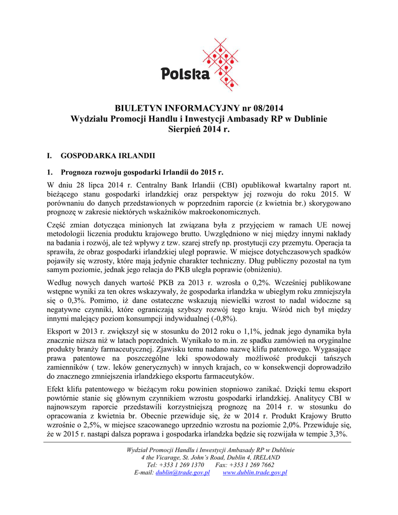 BIULETYN INFORMACYJNY nr 08/2014 Wydziału Promocji Handlu i Inwestycji Ambasady RP w Dublinie Sierpień 2014 r. I. GOSPODARKA IRLANDII 1. Prognoza rozwoju gospodarki Irlandii do 2015 r. W dniu 28 lipca 2014 r. Centralny Bank Irlandii (CBI) opublikował kwartalny raport nt. bieżącego stanu gospodarki irlandzkiej oraz perspektyw jej rozwoju do roku 2015. W porównaniu do danych przedstawionych w poprzednim raporcie (z kwietnia br.) skorygowano prognozę w zakresie niektórych wskaźników makroekonomicznych. Część zmian dotycząca minionych lat związana była z przyjęciem w ramach UE nowej metodologii liczenia produktu krajowego brutto. Uwzględniono w niej między innymi nakłady na badania i rozwój, ale też wpływy z tzw. szarej strefy np. prostytucji czy przemytu. Operacja ta sprawiła, że obraz gospodarki irlandzkiej uległ poprawie. W miejsce dotychczasowych spadków pojawiły się wzrosty, które mają jedynie charakter techniczny. Dług publiczny pozostał na tym samym poziomie, jednak jego relacja do PKB uległa poprawie (obniżeniu). Według nowych danych wartość PKB za 2013 r. wzrosła o 0,2%. Wcześniej publikowane wstępne wyniki za ten okres wskazywały, że gospodarka irlandzka w ubiegłym roku zmniejszyła się o 0,3%. Pomimo, iż dane ostateczne wskazują niewielki wzrost to nadal widoczne są negatywne czynniki, które ograniczają szybszy rozwój tego kraju. Wśród nich był między innymi malejący poziom konsumpcji indywidualnej (-0,8%). Eksport w 2013 r. zwiększył się w stosunku do 2012 roku o 1,1%, jednak jego dynamika była znacznie niższa niż w latach poprzednich. Wynikało to m.in. ze spadku zamówień na oryginalne produkty branży farmaceutycznej. Zjawisku temu nadano nazwę klifu patentowego. Wygasające prawa patentowe na poszczególne leki spowodowały możliwość produkcji tańszych zamienników ( tzw. leków generycznych) w innych krajach, co w konsekwencji doprowadziło do znacznego zmniejszenia irlandzkiego eksportu farmaceutyków. Efekt klifu patentowego w bieżącym roku powinien stopniowo zanikać. Dzięki temu eksport powtórnie stanie się głównym czynnikiem wzrostu gospodarki irlandzkiej. Analitycy CBI w najnowszym raporcie przedstawili korzystniejszą prognozę na 2014 r. w stosunku do opracowania z kwietnia br. Obecnie przewiduje się, że w 2014 r. Produkt Krajowy Brutto wzrośnie o 2,5%, w miejsce szacowanego uprzednio wzrostu na poziomie 2,0%. Przewiduje się, że w 2015 r. nastąpi dalsza poprawa i gospodarka irlandzka będzie się rozwijała w tempie 3,3%. Wydział Promocji Handlu i Inwestycji Ambasady RP w Dublinie 4 the Vicarage, St. John’s Road, Dublin 4, IRELAND Tel: +353 1 269 1370 Fax: +353 1 269 7662 E-mail: [email protected] www.dublin.trade.gov.pl Wydział Promocji Handlu i Inwestycji Ambasady RP w Dublinie Wśród pozytywnych zjawisk wymienia się dalszą poprawę poziomu zatrudnienia (o 2,3% w 2014 r. i 2,2% w 2015 r.) i związany z tym malejący poziom bezrobocia (11,4% w br.). Oczekuje się, że proces ten będzie kontynuowany do końca 2015 r., a stopa bezrobocia powinna zmniejszyć się do 10,5% (w I kwartale 2014 r. wyniosła 11,6%). W najbliższych dwóch latach szybszy wzrost irlandzkiego dochodu narodowego będzie następstwem rosnących nakładów inwestycyjnych i eksportu oraz przełamania trendu w zakresie konsumpcji indywidualnej. Po długim okresie spadków w 2014 r. konsumpcja ma wzrosnąć o 1%, a w kolejnym roku o 1,3%. W prognozowanym okresie wydatki sektora publicznego będą nadal ulegały obniżeniu (odpowiednio o -1,6% i -1,1%). Inflacja (CPI), jak i zharmonizowany wskaźnik cen detalicznych (HICP) na koniec 2015 r. mogą osiągnąć poziom 1%. Z punktu widzenia interesów zagranicznych, w tym polskich eksporterów sprzedających swoje towary do Irlandii, istotny jest prognozowany poziom irlandzkiego importu. W najnowszym raporcie CBI przewiduje, iż w 2014 r. import wzrośnie o 3,7% i tempo to ma zwiększyć się w roku 2015 do 4,6%. Najważniejsze wskaźniki prognozy rozwoju gospodarki Irlandii opracowane przez Centralny Bank Irlandii przedstawiają się następująco: Wskaźniki 2011 2012 2013 2014 2015 (szacunek) (prognoza) Produkt Krajowy Brutto (zmiana w %) 2,8 -0,3 0,2 2,5 3,3 Konsumpcja indywidualna (zmiana w %) -1,2 -1,2 -0,8 1,0 1,3 Wydatki sektora publicznego (zmiana w %) -2,1 -2,1 1,4 -1,6 -1,1 Eksport towarów i usług (dynamika w %) 5,5 4,7 1,1 4,0 5,0 Import towarów i usług (dynamika w %) -0,6 6,9 0,6 3,7 4,6 Wskaźnik cen detalicznych (CPI) (zmiana w %) 2,6 1,7 0,5 0,4 1,0 Wskaźnik cen detalicznych (HICP) (zmiana w %) 1,2 1,9 0,5 0,5 1,0 Liczba zatrudnionych (zmiana w %) -1,8 -0,6 2,3 2,3 2,2 Stopa bezrobocia (w %) 14,6 14,6 13,0 11,4 10,5 Źródło: Central Bank of Ireland Quarterly Bulletin 3, 28 July 2014 2. Deficyt budżetowy i dług publiczny w Irlandii po I kwartale 2014 r. Według wstępnych danych Centralnego Urzędu Statystycznego Irlandii (Central Statistics Office - CSO) deficyt budżetowy w I kwartale 2014 r. wyniósł 2.432 mln EUR stanowiąc tym samym 5,6% Produktu Krajowego Brutto Irlandii. W ubiegłym roku w analogicznym okresie deficyt osiągnął 3.326 mln EUR i odpowiednio 7,9% PKB. Dochody skarbu państwa w I kw. br. wyniosły 14,6 mld EUR i były wyższe o 736 mln EUR (+5,3%) w stosunku do analogicznego okresu roku ubiegłego. Wzrost odnotowano między innymi dzięki większym wpływom z tytułu podatków i składek na cele socjalne. Z kolei wydatki 2 Wydział Promocji Handlu i Inwestycji Ambasady RP w Dublinie państwa zmniejszyły się o 158 mln EUR (-0,9%) w porównaniu z I kwartałem ubiegłego roku. Obniżenie wydatków było widoczne w większości kategorii kosztów. Według tego samego źródła irlandzki dług publiczny brutto po I kwartale wyniósł 215 mld EUR stanowiąc tym samym 122,2% PKB tego kraju. W ubiegłym roku w analogicznym okresie dług brutto stanowił 215,5 mld EUR i odpowiednio 123,3% PKB. Z kolei irlandzki dług publiczny 
