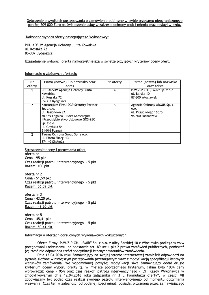 Ogłoszenie o wynikach postępowania o zamówienie publiczne w trybie przetargu nieograniczonego poniżej 209 000 Euro na świadczenie usług w zakresie ochrony osób i mienia oraz obsługi wjazdu. Dokonano wyboru oferty następującego Wykonawcy: PHU ADSUM Agencja Ochrony Julita Kowalska ul. Kossaka 72 85-307 Bydgoszcz Uzasadnienie wyboru: oferta najkorzystniejsza w świetle przyjętych kryteriów oceny ofert. Informacje o złożonych ofertach: Nr oferty 1 2 3 Firma (nazwa) lub nazwisko oraz adres Nr oferty Firma (nazwa) lub nazwisko oraz adres PHU ADSUM Agencja Ochrony Julita Kowalska ul. Kossaka 72 85-307 Bydgoszcz Konsorcjum Firm: DGP Security Partner Sp. z o.o. ul. Jesionowa 9A 40-159 Legnica – Lider Konsorcjum i Przedsiębiorstwo Usługowe GOS-ZEC Sp. z o.o. ul. Gdyńska 54 61-016 Poznań Taurus Ochrona Group Sp. z o.o. ul. Piotra Skargi 13 87-140 Chełmża 4 P.W.Z.P.CH. „EMIR” Sp. z o.o. ul. Barska 10 87-800 Włocławek 5 Agencja Ochrony ARGUS Sp. z o.o. ul. Piłsudskiego 16b/5 96-500 Sochaczew Streszczenie oceny i porównania ofert oferta nr 1 Cena – 95 pkt Czas reakcji patrolu interwencyjnego – 5 pkt Razem: 100 pkt oferta nr 2 Cena – 51,59 pkt Czas reakcji patrolu interwencyjnego – 5 pkt Razem: 56,59 pkt oferta nr 3 Cena – 43,20 pkt Czas reakcji patrolu interwencyjnego – 5 pkt Razem: 48,20 pkt oferta nr 5 Cena – 45,41 pkt Czas reakcji patrolu interwencyjnego – 5 pkt Razem: 50,41 pkt Informacja o ofertach odrzuconych/wykonawcach wykluczonych: Oferta Firmy P.W.Z.P.CH. „EMIR” Sp. z o.o. z ulicy Barskiej 10 z Włocławka podlega w w/w postępowaniu odrzuceniu na podstawie art. 89 ust 1 pkt 2 prawo zamówień publicznych, ponieważ jej treść nie odpowiada treści specyfikacji istotnych warunków zamówienia. Dnia 12.04.2016 roku Zamawiający na swojej stronie internetowej zamieścił odpowiedzi na pytania złożone w niniejszym postępowania przetargowym wraz z modyfikacją specyfikacji istotnych warunków zamówienia. We wspomnianej powyżej modyfikacji siwz Zamawiający dodał drugie kryterium oceny wyboru oferty tj, w miejsce poprzedniego kryterium, jakim było 100% ceny wprowadził: cenę – 95% oraz czas reakcji patrolu interwencyjnego – 5%. Każdy Wykonawca w zmodyfikowanym dnia 12.04.2016 roku załączniku nr 3 „ Formularzu oferty”, w części VII zobowiązany był podać czas reakcji swojego patrolu interwencyjnego od momentu otrzymania wezwania. Czas ten w zależności od podanej ilości minut, posiadał przyznaną przez Zamawiającego ilość punktów, a ta z kolei wraz z liczbą punków przyznaną za cenę stanowiła ogólna liczbę punków przyznanych ofercie. W ofercie złożonej przez Wykonawcę nie została uwzględniona modyfikacja specyfikacji istotnych warunków zamówienia i nie ma podanego czasu reakcji jego patrolu interwencyjnego od otrzymania wezwania. Dnia 22.04.2016 r. zamieszczono na stronie www. med. torun. pl i na tablicy ogłoszeń Zamawiającego