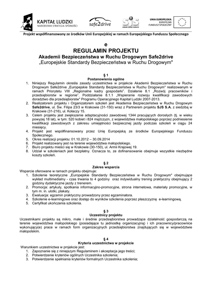 Projekt współfinansowany ze środków Unii Europejskiej w ramach Europejskiego Funduszu Społecznego e REGULAMIN PROJEKTU Akademii Bezpieczeństwa w Ruchu Drogowym Safe2drive „Europejskie Standardy Bezpieczeństwa w Ruchu Drogowym" 1. 2. 3. 4. 5. 6. 7. 8. §1 Postanowienia ogólne Niniejszy Regulamin określa zasady uczestnictwa w projekcie Akademii Bezpieczeństwa w Ruchu Drogowym Safe2drive „Europejskie Standardy Bezpieczeństwa w Ruchu Drogowym" realizowanym w ramach Priorytetu VIII „Regionalne kadry gospodarki”. Działanie 8.1 „Rozwój pracowników i przedsiębiorstw w regionie”. Poddziałanie 8.1.1 „Wspieranie rozwoju kwalifikacji zawodowych doradztwo dla przedsiębiorstw" Programu Operacyjnego Kapitał Ludzki 2007-2013. Realizatorem projektu i Organizatorem szkoleń jest Akademia Bezpieczeństwa w Ruchu Drogowym Safe2drive, ul. Św. Filipa 23/3 w Krakowie (31-150) wraz z Partnerem projektu SJS S.A. z siedzibą w Krakowie (31-216), ul. Kołaczy 15. Celem projektu jest zwiększenie adaptacyjności zawodowej 1344 pracujących dorosłych (tj. w wieku powyzej 18 lat), w tym: 520 kobiet i 824 mężczyzn, z województwa małopolskiego poprzez podniesienie kwalifikacji zawodowych z zakresu umiejętności bezpiecznej jazdy podczas szkoleń w ciągu 24 miesięcy. Projekt jest współfinansowany przez Unię Europejską ze środków Europejskiego Funduszu Społecznego. Okres realizacji projektu: 01.10.2012 – 30.09.2014 Projekt realizowany jest na terenie województwa małopolskiego. Biuro projektu mieści się w Krakowie (30-150), ul. Armii Krajowej 19. Udział w szkoleniach jest bezpłatny. Oznacza to, ze dofinansowanie obejmuje wszystkie niezbędne koszty szkoleń. §2 Zakres wsparcia Wsparcie oferowane w ramach projektu obejmuje: 1. Szkolenie teoretyczne „Europejskie Standardy Bezpieczeństwa w Ruchu Drogowym" obejmujące wykład multimedialny - czas trwania to 4 godziny oraz indywidualny trening praktyczny obejmujący 2 godziny dydaktyczne jazdy z trenerem. 2. Promocja: artykuły, spotkania informacyjno-promocyjne, strona internetowa, materiały promocyjne, w tym m. in. ulotki, plakaty. 3. Ewaluacja: egzamin praktyczny prowadzony przez egzaminatora. 4. Szkolenie e-learningowe oraz dostęp do wyników szkolenia poprzez płaszczyznę e-learningową. 5. Certyfikat ukończenia szkolenia. §3 Uczestnicy projektu Uczestnikami projektu są mikro, małe i średnie przedsiębiorstwa prowadzące działalność gospodarczą na terenie województwa małopolskiego (posiadające tu jednostkę organizacyjną) i ich pracownicy/pracownice wykonujący(e) prace w ramach form organizacyjnych przedsiębiorstwa znajdujących się w województwie małopolskim. §4 Kryteria uczestnictwa w projekcie Warunkiem uczestnictwa w projekcie jest: 1. Zapoznanie się z niniejszym Regulaminem i akceptacja jego treści; 2. Potwierdzenie kryteriów ogólnych Uczestnika szkolenia; 3. Potwierdzenie spełniania kryteriów formalnych Uczestnika szkolenia; Projekt współfinansowany ze środków Unii Europejskiej w ramach Europejskiego Funduszu Społecznego 4. Wypełnienie dokumentów rekrutacyjnych - dostępnych na głównej stronie internetowej Organizatora szkoleń: www.safe2drive.pl oraz Partnera: www.sjs.pl w banerze informującym o szkoleniach finansowanych w ramach EFS oraz w siedzibie biura projektu; 5. Przejście etapu rekrutacji; 6. Podpisanie umowy uczestnictwa. §5 Zasady rekrutacji Uczestników Rekrutacja Uczestników dokonywana jest przez Specjalistę ds. Rekrutacji zgodnie z zasadami rekrutacji określonymi w Regulaminie Rekrutacji. 1. 2. 3. 4. 5. §7 Zasady monitoringu Beneficjentów Uczestnicy zobowiązani są do potwierdzenia swojej obecności na zajęciach. Potwierdzenie obecności następuje poprzez złożenie podpisu na liście obecności. Uczestnicy są zobowiązani do wzięcia udziału w egzaminie końcowym. Uczestnicy zobowiązani są do wypełniania ankiet ewaluacyjnych w trakcie uczestnictwa w projekcie, w tym: ankieta badająca satysfakcję po szkoleniu, ankieta dotycząca respektowania równości szans, testy merytoryczne podczas szkolenia teoretycznego. Uczestnicy są zobowiązani do pisemnego potwierdzenia odbioru otrzymanych Certyfikatów na liście,wskazanej przez Organizatora szkoleń. Informacje, o których mowa w punktach 1-4 będą wykorzystywane do wywiązania się Organizatora szkoleń z obowiązków sprawozdawczych z realizacji projektu wobec Instytucji Pośredniczącej II Stopnia, jaką jest Wojewódzki Urząd Pracy w Krakowie. §8 Obowiązki Uczestników 1. Uczestnicy zobowiązują się do: a) Przestrzegania niniejszego Regulaminu b) Punktualnego stawiania się na zajęcia c) Aktywnego uczestniczenia w zajęciach d) Obecności na co najmniej 80 % zajęć e) Poddawanie się monitoringowi i ewaluacji zgodnie z zasadami, o których mowa w § 7. 2. Uczestnik oświadcza, że nie będzie uczestniczył w zajęciach pod wpływem alkoholu lub innych środków odurzających. §9 Zasady rezygnacji z uczestnictwa w projekcie 1. Rezygnacja z udziału w projekcie możliwa jest tylko w uzasadnionych przypadkach i następuje poprzez złożenie pisemnego oświadczenia na formularzu dostarczonym przez Organizatora szkoleń. 2. W przypadku braku odpowiednio udokumentowanej przyczyny rezygnacji z udziału w szkoleniu Uczestnik zobowiązany jest do zwrotu kosztów poniesionych przez Organizatora. Koszt szkolenia jednego Uczestnika wylicza się dzieląc kwotę dofinansowania projektu poprzez liczbę uczestników objętych projektem. § 10 Postanowienia końcowe 1. Sprawy nieuregulowane niniejszym Regulaminem rozstrzygane są przez Realizatora projektu. 2. Ostateczna interpretacja „Regulaminu projektu" należy do Organizatora projektu w oparciu o akty prawne, wytyczne i zasady przyjęte i obowiązujące dla Programu Operacyjnego Kapitał Ludzki 20072013. 3. Regulamin wchodzi w życie z dniem 01.10.2012r. _________________________ miejscowość i data ________________________________ czytelny