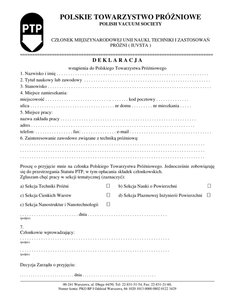 Deklaracja czlonkowska - Polskie Towarzystwo Próżniowe