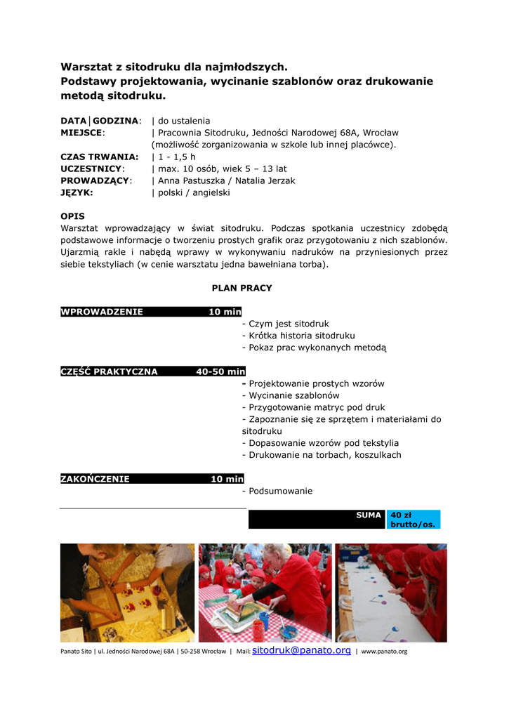 Warsztat z sitodruku dla najmłodszych. Podstawy projektowania, wycinanie szablonów oraz drukowanie metodą sitodruku. DATA│GODZINA: MIEJSCE: CZAS TRWANIA: UCZESTNICY: PROWADZĄCY: JĘZYK: | do ustalenia | Pracownia Sitodruku, Jedności Narodowej 68A, Wrocław (możliwość zorganizowania w szkole lub innej placówce). | 1 - 1,5 h | max. 10 osób, wiek 5 – 13 lat | Anna Pastuszka / Natalia Jerzak | polski / angielski OPIS Warsztat wprowadzający w świat sitodruku. Podczas spotkania uczestnicy zdobędą podstawowe informacje o tworzeniu prostych grafik oraz przygotowaniu z nich szablonów. Ujarzmią rakle i nabędą wprawy w wykonywaniu nadruków na przyniesionych przez siebie tekstyliach (w cenie warsztatu jedna bawełniana torba). PLAN PRACY WPROWADZENIE 10 min - Czym jest sitodruk - Krótka historia sitodruku - Pokaz prac wykonanych metodą CZĘŚĆ PRAKTYCZNA ZAKOŃCZENIE 40-50 min - Projektowanie prostych wzorów - Wycinanie szablonów - Przygotowanie matryc pod druk - Zapoznanie się ze sprzętem i materiałami do sitodruku - Dopasowanie wzorów pod tekstylia - Drukowanie na torbach, koszulkach 10 min - Podsumowanie SUMA 40 zł brutto/os. Panato Sito | ul. Jedności Narodowej 68A | 50-258 Wrocław | Mail: [email protected] | www.panato.org
