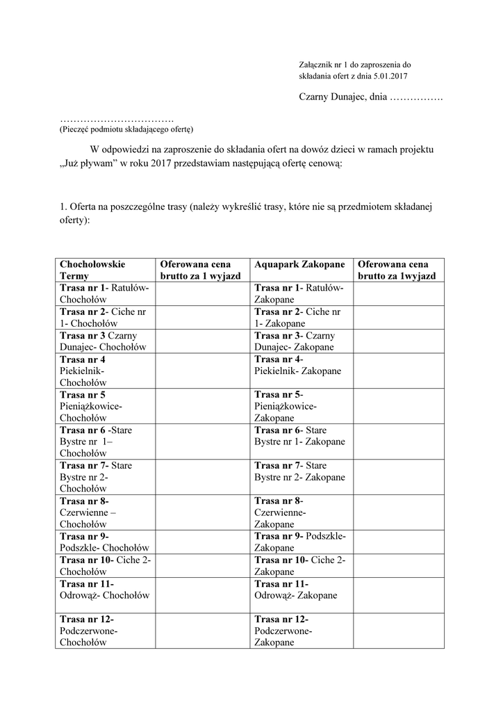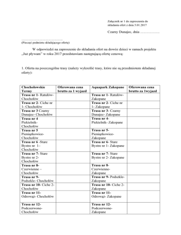 Załącznik nr 1 do zaproszenia do składania ofert z dnia 5.01.2017 Czarny Dunajec, dnia ……………. ……………………………. (Pieczęć podmiotu składającego ofertę) W odpowiedzi na zaproszenie do składania ofert na dowóz dzieci w ramach projektu „Już pływam” w roku 2017 przedstawiam następującą ofertę cenową: 1. Oferta na poszczególne trasy (należy wykreślić trasy, które nie są przedmiotem składanej oferty): Chochołowskie Oferowana cena Termy brutto za 1 wyjazd Trasa nr 1- RatułówChochołów Trasa nr 2- Ciche nr 1- Chochołów Trasa nr 3 Czarny Dunajec- Chochołów Trasa nr 4 PiekielnikChochołów Trasa nr 5 PieniążkowiceChochołów Trasa nr 6 -Stare Bystre nr 1– Chochołów Trasa nr 7- Stare Bystre nr 2Chochołów Trasa nr 8Czerwienne – Chochołów Trasa nr 9Podszkle- Chochołów Trasa nr 10- Ciche 2Chochołów Trasa nr 11Odrowąż- Chochołów Aquapark Zakopane Trasa nr 8CzerwienneZakopane Trasa nr 9- PodszkleZakopane Trasa nr 10- Ciche 2Zakopane Trasa nr 11Odrowąż- Zakopane Trasa nr 12PodczerwoneChochołów Trasa nr 12PodczerwoneZakopane Trasa nr 1- RatułówZakopane Trasa nr 2- Ciche nr 1- Zakopane Trasa nr 3- Czarny Dunajec- Zakopane Trasa nr 4Piekielnik- Zakopane Trasa nr 5PieniążkowiceZakopane Trasa nr 6- Stare Bystre nr 1- Zakopane Trasa nr 7- Stare Bystre nr 2- Zakopane Oferowana cena brutto za 1wyjazd Trasa nr 13Chochołów szkołaChochołów Trasa nr 14Czerwienne nr 1Chochołów Trasa nr 13Chochołów szkołaZakopane Trasa nr 14Czerwienne nr 1Zakopane II. Trasy łączone: Chochołowskie Termy Trasa nr 1A- ZS nr 1 Ciche i ZS nr 2 Ciche- Chochołów Trasa nr 2A- ZS Piekielnik i SP Podszkle- Chochołów Trasa nr 3A -SP Pieniążkowice i SP Odrowąż- Chochołów Trasa nr 4A -SPSK Czerwienne i SP nr 1 CzerwienneChochołów Oferowana cena brutto za 1 wyjazd Aquapark Zakopane Oferowana cena brutto za 1wyjazd Trasa nr 1A- ZS nr 1 Ciche i ZS nr 2 CicheZakopane Trasa nr 2A- ZS Piekielnik i SP Podszkle- Zakopane Trasa nr 3A- SP Pieniążkowice i SP Odrowąż- Zakopane Trasa nr 4A- SPSK Czerwienne i SP nr 1 CzerwienneZakopane ………………………… (podpis)