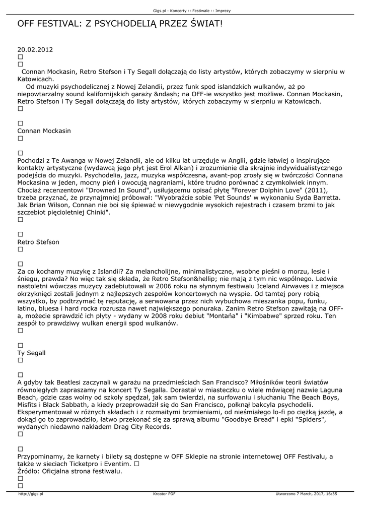 Gigs.pl - Koncerty :: Festiwale :: Imprezy OFF FESTIVAL: Z PSYCHODELIĄ PRZEZ ŚWIAT! 20.02.2012 Connan Mockasin, Retro Stefson i Ty Segall dołączają do listy artystów, których zobaczymy w sierpniu w Katowicach. Od muzyki psychodelicznej z Nowej Zelandii, przez funk spod islandzkich wulkanów, aż po niepowtarzalny sound kalifornijskich garaży – na OFF-ie wszystko jest możliwe. Connan Mockasin, Retro Stefson i Ty Segall dołączają do listy artystów, których zobaczymy w sierpniu w Katowicach. Connan Mockasin Pochodzi z Te Awanga w Nowej Zelandii, ale od kilku lat urzęduje w Anglii, gdzie łatwiej o inspirujące kontakty artystyczne (wydawcą jego płyt jest Erol Alkan) i zrozumienie dla skrajnie indywidualistycznego podejścia do muzyki. Psychodelia, jazz, muzyka współczesna, avant-pop zrosły się w twórczości Connana Mockasina w jeden, mocny pień i owocują nagraniami, które trudno porównać z czymkolwiek innym. Chociaż recenzentowi "Drowned In Sound", usiłującemu opisać płytę "Forever Dolphin Love" (2011), trzeba przyznać, że przynajmniej próbował: "Wyobraźcie sobie 'Pet Sounds' w wykonaniu Syda Barretta. Jak Brian Wilson, Connan nie boi się śpiewać w niewygodnie wysokich rejestrach i czasem brzmi to jak szczebiot pięcioletniej Chinki". Retro Stefson Za co kochamy muzykę z Islandii? Za melancholijne, minimalistyczne, wsobne pieśni o morzu, lesie i śniegu, prawda? No więc tak się składa, że Retro Stefson… nie mają z tym nic wspólnego. Ledwie nastoletni wówczas muzycy zadebiutowali w 2006 roku na słynnym festiwalu Iceland Airwaves i z miejsca okrzyknięci zostali jednym z najlepszych zespołów koncertowych na wyspie. Od tamtej pory robią wszystko, by podtrzymać tę reputację, a serwowana przez nich wybuchowa mieszanka popu, funku, latino, bluesa i hard rocka rozrusza nawet największego ponuraka. Zanim Retro Stefson zawitają na OFFa, możecie sprawdzić ich płyty - wydany w 2008 roku debiut "Montańa" i "Kimbabwe" sprzed roku. Ten zespół to prawdziwy wulkan energii spod wulkanów. Ty Segall A gdyby tak Beatlesi zaczynali w garażu na przedmieściach San Francisco? Miłośników teorii światów równoległych zapraszamy na koncert Ty Segalla. Dorastał w miasteczku o wiele mówiącej nazwie Laguna Beach, gdzie czas wolny od szkoły spędzał, jak sam twierdzi, na surfowaniu i słuchaniu The Beach Boys, Misfits i Black Sabbath, a kiedy przeprowadził się do San Francisco, połknął bakcyla psychodelii. Eksperymentował w różnych składach i z rozmaitymi brzmieniami, od nieśmiałego lo-fi po ciężką jazdę, a dokąd go to zaprowadziło, łatwo przekonać się za sprawą albumu "Goodbye Bread" i epki "Spiders", wydanych niedawno nakładem Drag City Records. Przypominamy, że karnety i bilety są dostępne w OFF Sklepie na stronie internetowej OFF Festivalu, a także w sieciach Ticketpro i Eventim. Źródło: Oficjalna strona festiwalu. http://gigs.pl Kreator PDF Utworzono 7 March, 2017, 16:35 Gigs.pl - Koncerty :: Festiwale :: Imprezy http://gigs.pl Kreator PDF Utworzono 7 March, 2017, 16:35