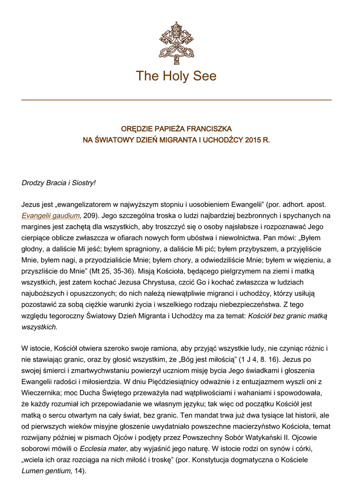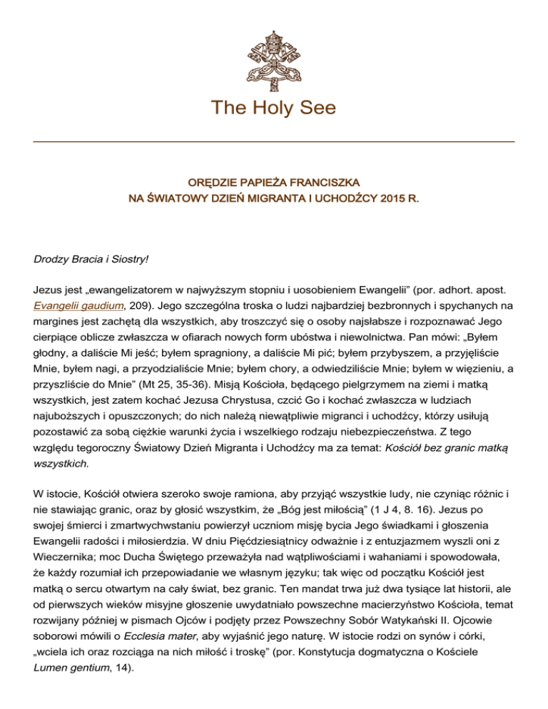 The Holy See ORĘDZIE PAPIEŻA FRANCISZKA NA ŚWIATOWY DZIEŃ MIGRANTA I UCHODŹCY 2015 R. Drodzy Bracia i Siostry! Jezus jest „ewangelizatorem w najwyższym stopniu i uosobieniem Ewangelii” (por. adhort. apost. Evangelii gaudium, 209). Jego szczególna troska o ludzi najbardziej bezbronnych i spychanych na margines jest zachętą dla wszystkich, aby troszczyć się o osoby najsłabsze i rozpoznawać Jego cierpiące oblicze zwłaszcza w ofiarach nowych form ubóstwa i niewolnictwa. Pan mówi: „Byłem głodny, a daliście Mi jeść; byłem spragniony, a daliście Mi pić; byłem przybyszem, a przyjęliście Mnie, byłem nagi, a przyodzialiście Mnie; byłem chory, a odwiedziliście Mnie; byłem w więzieniu, a przyszliście do Mnie” (Mt 25, 35-36). Misją Kościoła, będącego pielgrzymem na ziemi i matką wszystkich, jest zatem kochać Jezusa Chrystusa, czcić Go i kochać zwłaszcza w ludziach najuboższych i opuszczonych; do nich należą niewątpliwie migranci i uchodźcy, którzy usiłują pozostawić za sobą ciężkie warunki życia i wszelkiego rodzaju niebezpieczeństwa. Z tego względu tegoroczny Światowy Dzień Migranta i Uchodźcy ma za temat: Kościół bez granic matką wszystkich. W istocie, Kościół otwiera szeroko swoje ramiona, aby przyjąć wszystkie ludy, nie czyniąc różnic i nie stawiając granic, oraz by głosić wszystkim, że „Bóg jest miłością” (1 J 4, 8. 16). Jezus po swojej śmierci i zmartwychwstaniu powierzył uczniom misję bycia Jego świadkami i głoszenia Ewangelii radości i miłosierdzia. W dniu Pięćdziesiątnicy odważnie i z entuzjazmem wyszli oni z Wieczernika; moc Ducha Świętego przeważyła nad wątpliwościami i wahaniami i spowodowała, że każdy rozumiał ich przepowiadanie we własnym języku; tak więc od początku Kościół jest matką o sercu otwartym na cały świat, bez granic. Ten mandat trwa już dwa tysiące lat historii, ale od pierwszych wieków misyjne głoszenie uwydatniało powszechne macierzyństwo Kościoła, temat rozwijany później w pismach Ojców i podjęty przez Powszechny Sobór Watykański II. Ojcowie soborowi mówili o Ecclesia mater, aby wyjaśnić jego naturę. W istocie rodzi on synów i córki, „wciela ich oraz rozciąga na nich miłość i troskę” (por. Konstytucja dogmatyczna o Kościele Lumen gentium, 14). Kościół bez granic, matka wszystkich, szerzy w świecie kulturę przyjmowania i solidarności, zgodnie z którą nikogo nie wolno uważać za niepotrzebnego, będącego nie na swoim miejscu czy do odrzucenia. Jeżeli wspólnota chrześcijańska rzeczywiście żyje swoim macierzyństwem, to umacnia, ukierunkowuje i wskazuje drogę, cierpliwie towarzyszy, staje się bliska przez modlitwę i przez dzieła miłosierdzia. Dziś to wszystko nabiera szczególnego znaczenia. Bowiem w epoce tak rozległych migracji wielka liczba osób opuszcza swoje rodzime miejsca i podejmuje niebezpieczną podróż nadziei, z bagażem pełnym pragnień i lęków, w poszukiwaniu bardziej ludzkich warunków życia. Nierzadko jednak te ruchy migracyjne wzbudzają nieufność i wrogość, nawet we wspólnotach kościelnych, zanim jeszcze pozna się historie życia, prześladowań czy nędzy osób, których to dotyczy. W takim wypadku podejrzenia i uprzedzenia stają w sprzeczności z biblijnym przykazaniem, by przyjmować z szacunkiem i solidarnością przybysza będącego w potrzebie. Z jednej strony, w sanktuarium sumienia odczuwa się wezwanie do tego, by dotykać nędzy ludzkiej i konkretnie wypełniać przykazanie miłości, które pozostawił nam Jezus, kiedy utożsamiał się z obcym przybyszem, z człowiekiem cierpiącym, ze wszystkimi niewinnymi ofiarami przemocy i wyzysku. Z drugiej jednak, z powodu słabości naszej natury, „doświadczamy pokusy bycia chrześcijanami, zachowując roztropny dystans w stosunku do ran Pana” (adhort. apost. Evangelii gaudium, 270). Odwaga wiary, nadziei i miłości pozwala zmniejszyć dystans, dzielący od ludzkich dramatów. Jezus Chrystus wciąż oczekuje, aby Go rozpoznawać w migrantach i w uchodźcach, w uciekinierach i przesiedleńcach, i także w ten sposób wzywa nas, abyśmy dzielili się zasobami, niekiedy rezygnując z części naszego nabytego dobrobytu. Przypominał o tym Paweł VI, stwierdzając, że najbardziej uprzywilejowani powinni wyrzec się niektórych swoich praw, aby z większą swobodą oddać swoje dobra na służbę innych” (list apost. Octogesima adveniens, 14 maja 1971 r., 23). Skądinąd, wielokulturowy charakter współczesnych społeczeństw skłania Kościół do podejmowania nowych działań w zakresie solidarności, jedności i ewangelizacji. Ruchy migracyjne w istocie pobudzają do zgłębiania i umacniania wartości koniecznych do tego, aby zapewnić harmonijne współistnienie osób i kultur. Aby to osiągnąć, nie wystarcza sama tolerancja, która otwiera drogę do poszanowania różnorodności i zapoczątkowuje drogi dzielenia się wśród osób różnego pochodzenia i różnych kultur. W to włącza się powołanie Kościoła do pokonywania granic i umożliwiania „przejścia od postawy obronnej, nacechowanej strachem, brakiem zainteresowania i tendencją do marginalizacji (…) do postawy opartej na 'kulturze spotkania', jedynej, która potrafi budować świat bardziej sprawiedliwy i braterski” (por. Orędzie na Światowy Dzień Migranta i Uchodźcy 2014 r.). Ruchy migracyjne nabrały wszak tak wielkich rozmiarów, że tylko systematyczna i konkretna współpraca, w którą włączyłyby się państwa i organizacje międzynarodowe, może być w stanie skutecznie je uregulować i nimi pokierować. W istocie, migracje domagają się reakcji wszystkich, nie tylko ze względu na zasięg tego zjawiska, ale także „z powodu problemów społecznych, ekonomicznych, politycznych, kulturowych i religijnych, jakie niesie, ze względu na dramatyczne wyzwania, jakie stawia przed społecznościami poszczególnych krajów i pr
