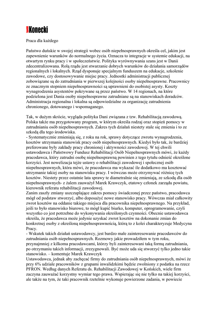 Praca dla każdego Państwo duńskie w swojej strategii wobec osób niepełnosprawnych określa cel, jakim jest zapewnienie warunków do normalnego życia. Oznacza to integracje w systemie edukacji, na otwartym rynku pracy i w społeczeństwie. Polityka wyrównywania szans jest w Danii zdecentralizowana. Rolą rządu jest stwarzanie dobrych warunków do działania samorządów regionalnych i lokalnych. Rząd dysponuje specjalnym funduszem na edukacje, szkolenie zawodowe, czy dostosowywanie miejsc pracy. Jednostki administracji publicznej zobowiązane są do zatrudniania w pierwszej kolejności osoby niepełnosprawne. Pracownicy ze znacznym stopniem niepełnosprawności są uprawnieni do osobistej asysty. Koszty wynagrodzenia asystentów pokrywane są przez państwo. W 14 regionach, na które podzielona jest Dania osoby niepełnosprawne zatrudniane są na stanowiskach doradców. Administracja regionalna i lokalna są odpowiedzialne za organizację zatrudnienia chronionego, dotowanego i wspomaganego. Tak, w dużym skrócie, wygląda polityka Dani związana z tzw. Rehabilitacją zawodową. Polska także ma przygotowany program, w którym określa rodzaj oraz stopień pomocy w zatrudnianiu osób niepełnosprawnych. Zakres tych działań niestety stale się zmienia i to ze szkodą dla tego środowiska. - Systematycznie zmieniają się, z roku na rok, sprawy dotyczące zwrotu wynagrodzenia, kosztów utrzymania stanowisk pracy osób niepełnosprawnych. Kiedyś było tak, że bardziej preferowane były zakłady pracy chronionej i aktywności zawodowej. W tej chwili ustawodawca i Państwowy Fundusz Rehabilitacji Osób Niepełnosprawnych mówi, że każdy pracodawca, który zatrudni osobę niepełnosprawną powinien z tego tytułu odnieść określone korzyści. Jest nowelizacja tejże ustawy o rehabilitacji zawodowej i społecznej osób niepełnosprawnych, która mówi, że pracodawca ma wykazać ile dodatkowo ma kosztować utrzymanie takiej osoby na stanowisku pracy. I wówczas może otrzymywać różnicę tych kosztów. Niestety przez ostatnie lata sprawy te diametralnie się zmieniają, ze szkodą dla osób niepełnosprawnych- z żalem zauważył Marek Krawczyk, etatowy członek zarządu powiatu, kierownik referatu rehabilitacji zawodowej. Zanim zaszły zmiany uszczuplające zakres pomocy świadczonej przez państwo, pracodawca mógł od podstaw stworzyć, albo doposażyć nowe stanowisko pracy. Wówczas miał całkowity zwrot kosztów na oddanie takiego miejsca dla pracownika niepełnosprawnego. Na przykład, jeśli to było stanowisko biurowe, to mógł kupić biurko, komputer, oprogramowanie, czyli wszystko co jest potrzebne do wykonywania określonych czynności. Obecnie ustawodawca określa, że pracodawca może jedynie uzyskać zwrot kosztów na dokonanie zmian do konkretnej osoby z określoną niepełnosprawnością, którą to z kolei charakteryzuje Medycyna Pracy. - Wskutek takich działań ustawodawcy, jest bardzo małe zainteresowanie pracodawców do zatrudniania osób niepełnosprawnych. Rozmowy jakie prowadziłem w tym roku, przynajmniej z kilkoma pracodawcami, którzy byli zainteresowani taką formą zatrudniania, po otrzymaniu takich informacji, zrezygnowali. Być może uda się stworzyć tylko jedno takie stanowisko. – komentuje Marek Krawczyk Ustawodawca, jednak aby zachęcać firmy do zatrudniania osób niepełnosprawnych, mówi że przy 6% udziale pracowników z grupami inwalidzkimi będzie zwolniony z podatku na rzecz PFRON. Według danych Referatu ds. Rehabilitacji Zawodowej w Końskich, wiele firm zaczyna zauważać korzystny wymiar tego prawa. Wspierając się nie tylko na takiej korzyści, ale także na tym, że taki pracownik rzetelnie wykonuje powierzone zadania, w powiecie koneckim znalazło się kilkanaście firm, które zatrudniły osoby niepełnosprawne. Można wymienić przedsiębiorstwa takie jak: ZOZ Końskie, Asyps Sport, Smakosz, Zakład Pracy Chronionej tartak w Smykowie, Koneckie Towarzystwo Budownictwa Społecznego, SP ZOZ, Artus, Avis, I Liceum Ogólnokształcące w Końskich, Azbi, Kim., w których uzyskało pracę 26 osób. - Powoli przełamuje się w naszym społeczeństwie przekonanie, że osoba niepełnosprawna musi być „zamknięta w domu”. Niekiedy dla rodziny była to sprawa wstydliwa - podzielił się z nami Marek Krawczyk. Tomasz Wojakowski