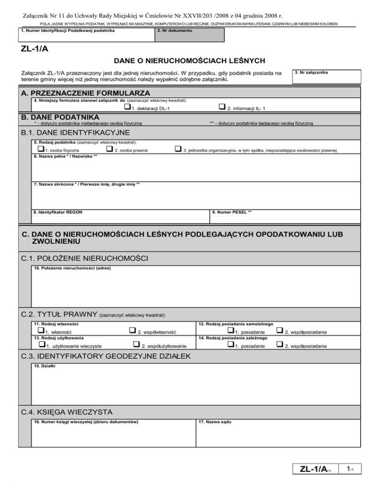 Załącznik Nr 11 do Uchwały Rady Miejskiej w Ćmielowie Nr XXVII/203 /2008 z 04 grudnia 2008 r. POLA JASNE WYPEŁNIA PODATNIK. WYPEŁNIAĆ NA MASZYNIE, KOMPUTEROWO LUB RĘCZNIE, DUŻYMI DRUKOWANYMI LITERAMI, CZARNYM LUB NIEBIESKIM KOLOREM. 1. Numer Identyfikacji Podatkowej podatnika 2. Nr dokumentu ZL-1/A DANE O NIERUCHOMOŚCIACH LEŚNYCH Załącznik ZL-1/A przeznaczony jest dla jednej nieruchomości. W przypadku, gdy podatnik posiada na terenie gminy więcej niż jedną nieruchomość należy wypełnić odrębne załączniki. 3. Nr załącznika A. PRZEZNACZENIE FORMULARZA 4. Niniejszy formularz stanowi załącznik do (zaznaczyć właściwy kwadrat): q1. deklaracji DL-1 q 2. informacji IL- 1 B. DANE PODATNIKA * - dotyczy podatnika niebędącego osobą fizyczną ** - dotyczy podatnika będącego osobą fizyczną B.1. DANE IDENTYFIKACYJNE 5. Rodzaj podatnika (zaznaczyć właściwy kwadrat): q 1. osoba fizyczna 6. Nazwa pełna * / Nazwisko ** q 2. osoba prawna q 3. jednostka organizacyjna, w tym spółka, nieposiadająca osobowości prawnej 7. Nazwa skrócona * / Pierwsze imię, drugie imię ** 8. Identyfikator REGON 9. Numer PESEL ** C. DANE O NIERUCHOMOŚCIACH LEŚNYCH PODLEGAJĄCYCH OPODATKOWANIU LUB ZWOLNIENIU C.1. POŁOŻENIE NIERUCHOMOŚCI 10. Położenie nieruchomości (adres) C.2. TYTUŁ PRAWNY (zaznaczyć właściwy kwadrat): 11. Rodzaj własności q1. własność 13. Rodzaj użytkowania q1. użytkowanie wieczyste q 2. współwłasność q 2. współużytkowanie 12. Rodzaj posiadania samoistnego q1. posiadanie 14. Rodzaj posiadania zależnego q1. posiadanie q 2. współposiadanie q 2. współposiadanie C.3. IDENTYFIKATORY GEODEZYJNE DZIAŁEK 15. Działki C.4. KSIĘGA WIECZYSTA 16. Numer księgi wieczystej (zbioru dokumentów) 17. Nazwa sądu ZL-1/A (1) 1/1