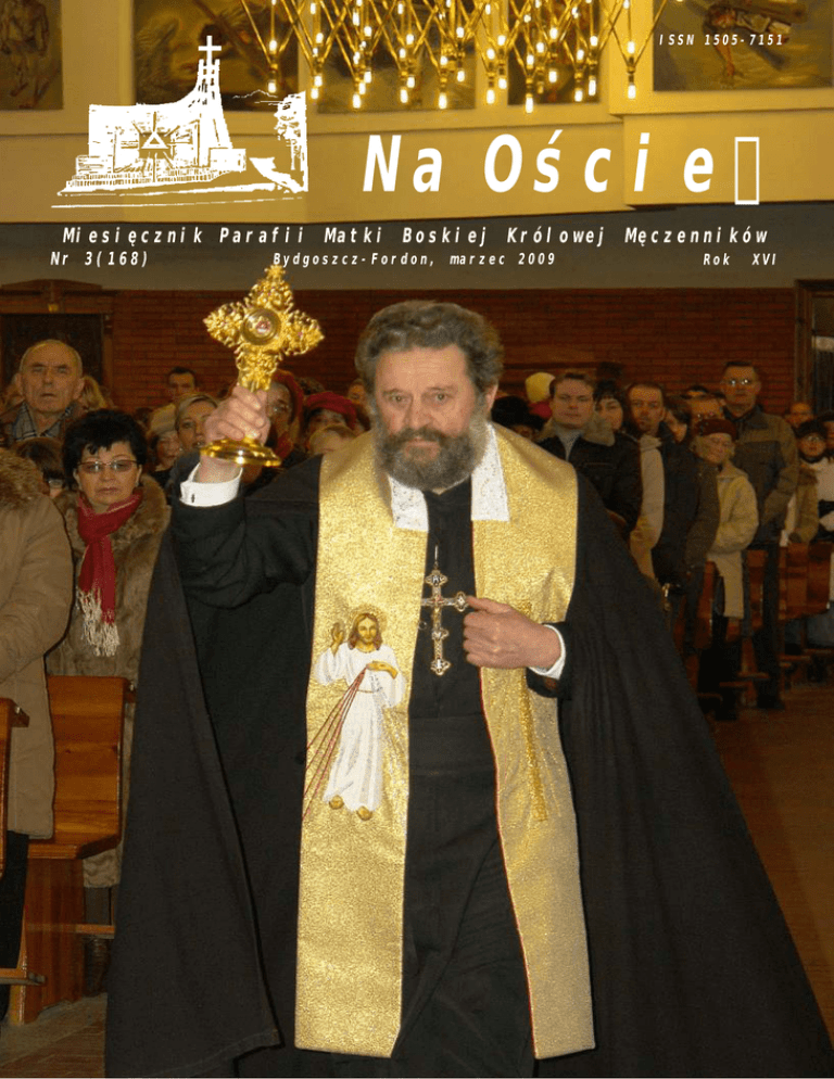 ISSN 1505-7151 Na Oścież Miesięcznik Parafii Matki Boskiej Królowej Męczenników Nr 3(168) Bydgoszcz-Fordon, marzec 2009 Rok XVI M n ożna ie czytać ... Niniejszemu wydaniu przewodzi hasło „Otoczmy troską życie - parafialne”. Jednym z wyrazów tej troski jest kolejny dar dla Parafii – relikwie bł. ks. Michała Sopoćki. Na okładce dobrze widać ten moment. Tuż obok można przeczytać o propozycjach, jakie w „Zamyśleniach” kieruje do PT Parafian i Czytelników ks. proboszcz Jan. Opisuje różne formy działania i organizowania się wiernych świeckich. Jedne formy w parafii już istnieją, jak np. Apostolstwo Caritas, zaś inne, np. Apostolstwo kierowców (lepiej uczestników ruchu drogowego) - czekają na realizację. Rozmowa miesiąca toczy się z ks. Zdzisławem Pałubickim – jak siebie nazywa – misjonarzem internetowym. Jestem przekonany, że po jej przeczytaniu każdy będzie bogatszy o nowe wiadomości z życia ks. Sopoćki – duchowego kierownika św. Faustyny, jak też i samego Rozmówcy. W tym wydaniu jest jeszcze jedna rozmowa – jakże znamienna. Jej rozmówca – poeta - Kazimierz Hoffman już dziś nie żyje. Warto ją przeczytać choćby dlatego, by poznać słowa, które wypowiada osoba mająca świadomość, że jej życie szybko dobiega końca. Na różnych stronach niniejszego wydania znajdują się informacje o odbytych i planowanych ćwiczeniach wielkopostnych. Była na przykład Droga Krzyżowa dla młodzieży z udziałem zespołu muzycznego w rytmie HIP-HOP. Jest też krótka informacja o tym, że zakończyła się część robocza I Synodu Parafialnego. Przyszedł czas na zbieranie owoców i redagowanie statutów. Otoczmy troską modlitewną to parafialne Dzieło. Jest też informacja o fakcie rejestracji Stowarzyszenia „Wyzwanie”, które zostało wpisane do Krajowego Rejestru Sądowego otrzymując unikalny numer. W tym roku nie można na jego konto przekazywać 1% podatku (bowiem w 2008 roku Stowarzyszenie nie istniało). Znalazły się osoby, które możliwie dokładnie przeczytały dwa Orędzia na Wielki Post, tj. papieża Benedykta XVI, jak i biskupa ordynariusza Jana Tyrawy. Zobaczmy jak udało się im odczytanie tych dokumentów. Następne wydanie będzie już świąteczne - na Wielkanoc i ukaże się w Niedzielę Palmową. Życzę wiele czasu, by nie zmarnować dni i godzin Przygotowania Paschalnego do Wielkanocy Fred w numerze m.in.: Na granicy cudu Pasterskie przypomnienia IX Misterium Kościół bramą Ks. Melchisedec odpowiada (s. 6) (s. 8) (s. 11) (s. 12) (s. 19) w następnych numerach: O bydgoskich męczennikach Rozmowa z ks. Andrzejem Panasiukiem Refleksje rekolekcyjne Str. 1 okładki - fotografia przedstawia ks. Zdzisława Pałubickiego (SJ) niosącego relikwie bł. ks. Michała Sopoćki. Autorem zdjęcia jest Wiesław Kajdasz. 2 3/2009 Proboszczowskie zamyslenia Czas Wielkiego Postu, czas pokuty i nawrócenia, czas wytężonej modlitwy i uczynków miłosierdzia przypomina każdemu z nas o potrzebie chrześcijańskiej aktywności. Kościół w Polsce stawia nam jasne zadanie. Konieczna jest troska o życie, zwłaszcza ludzkie, które tak często jest zagrożone. Mamy prawo postawić pytanie: w jaki sposób to uczynić? Jakie podjąć działania? Co zrobić, by one miały sens i ożywiły liczne wspólnoty apostolskie działające w parafii do aktywności. Oto kilka propozycji: Apostolstwo Chorych Wielu ludzi ciężko chorych przebywa w szpitalach, hospicjach, w naszych domach. Potrzebują lekarstw i fachowej opieki. To jest ważne i zazwyczaj mają to zapewnione. Jednak, jak pokazuje życie, potrzebują również opieki duchowej. Pragną obecności drugiego człowieka, który z nimi porozmawia, posiedzi przy łóżku, przyniesie pocieszenie. Apostolstwo Duchowej Adopcji Dziecka Poczętego Szacunkowa liczba mordowanych dzieci nienarodzonych w świecie jest ogromna. Czy możemy pozostać obojętni na taką sytuację? Mamy bronić życia ludzkiego od poczęcia do naturalnej śmierci. Weźmy do ręki różańce i módlmy się. Przystąpmy do Duchowej Adopcji Dziecka Poczętego, co wiąże się z codziennym odmawianiem jednej dziesiątki różańca i specjalnej modlitwy. Apostolstwo Honorowego Krwiodawstwa Wielu ludzi umiera, bo nie ma dla nich krwi. To sytuacja, która nie może nam być obojętna. Dlatego może i w naszej parafii przyszedł czas by powstawała Parafialna grupa Honorowego Krwiodawstwa. W Adwencie w naszej parafii około 50 osób oddało krew ratując wiele istnień ludzkich. Apostolstwo Kierowców Nierzadko przerażają nas relacje medialne, w których mówi się o liczbie zabitych na drogach. Najczęściej ludzie giną przez nieostrożność kierowców, nieprzestrzeganie przepisów i alkohol. Co zrobić w takiej sytuacji? Czy tak musi być? Trzeba przypomnieć o dniu szczególnej modlitwy za kierowców i wszystkich poruszających się po drogach. Przyszedł także czas by promować deklaracje przekazania swoich organów w razie nieszczęśliwego wypadku. Takim sposobem możemy również uratować wiele osób. Apostolstwo Czystych Serc Współcześnie zagrożone jest życie w czystości wielu młodych ludzi. Łatwy dostęp do pornografii i zbyt szybka inicjacja seksualna powodują, że czystość, dziewictwo stają się wspomnieniem z przeszłości, czymś, co wzbudza ironiczny uśmiech. Sytuacja taka powoduje niepokojące bicie na alarm. Dlatego też chcemy upowszechnić w naszym Sanktuarium Ruch Czystych Serc. Młodzi ludzie zaproszeni są, by złożyli przed Chrystusem przysięgę życia w czystości do zawarcia małżeństwa. Jest to możliwe pod warunkiem ścisłej zażyłości z Bogiem. Taka inicjatywa może zostać podjęta z dużym powodzeniem podczas rekolekcji parafialnych dla młodzieży. Apostolstwo Caritas Coraz więcej ludzi na świecie nie ma co jeść, brakuje im chleba. Przez to wymagają oni naszej troski. Nie wolno obojętnie nam przejść obok człowieka głodnego. Stąd propozycja kó