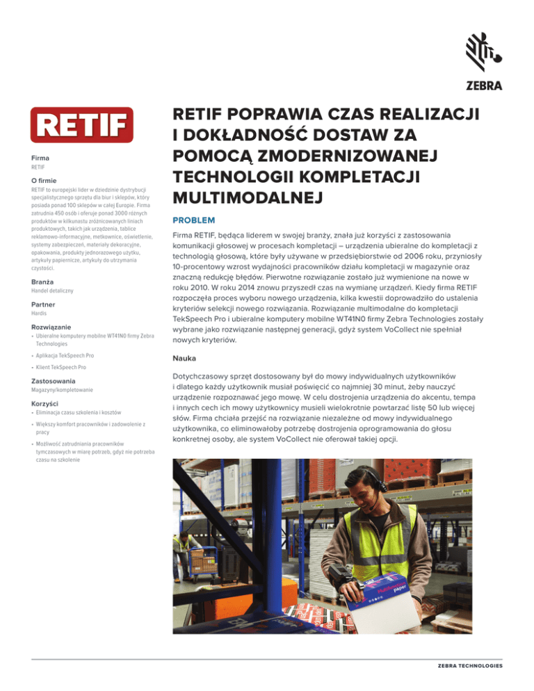 Firma RETIF O firmie RETIF to europejski lider w dziedzinie dystrybucji specjalistycznego sprzętu dla biur i sklepów, który posiada ponad 100 sklepów w całej Europie. Firma zatrudnia 450 osób i oferuje ponad 3000 różnych produktów w kilkunastu zróżnicowanych liniach produktowych, takich jak urządzenia, tablice reklamowo-informacyjne, metkownice, oświetlenie, systemy zabezpieczeń, materiały dekoracyjne, opakowania, produkty jednorazowego użytku, artykuły papiernicze, artykuły do utrzymania czystości. Branża Handel detaliczny Partner Hardis Rozwiązanie • U bieralne komputery mobilne WT41N0 firmy Zebra Technologies • A plikacja TekSpeech Pro RETIF POPRAWIA CZAS REALIZACJI I DOKŁADNOŚĆ DOSTAW ZA POMOCĄ ZMODERNIZOWANEJ TECHNOLOGII KOMPLETACJI MULTIMODALNEJ PROBLEM Firma RETIF, będąca liderem w swojej branży, znała już korzyści z zastosowania komunikacji głosowej w procesach kompletacji – urządzenia ubieralne do kompletacji z technologią głosową, które były używane w przedsiębiorstwie od 2006 roku, przyniosły 10-procentowy wzrost wydajności pracowników działu kompletacji w magazynie oraz znaczną redukcję błędów. Pierwotne rozwiązanie zostało już wymienione na nowe w roku 2010. W roku 2014 znowu przyszedł czas na wymianę urządzeń. Kiedy firma RETIF rozpoczęła proces wyboru nowego urządzenia, kilka kwestii doprowadziło do ustalenia kryteriów selekcji nowego rozwiązania. Rozwiązanie multimodalne do kompletacji TekSpeech Pro i ubieralne komputery mobilne WT41N0 firmy Zebra Technologies zostały wybrane jako rozwiązanie następnej generacji, gdyż system VoCollect nie spełniał nowych kryteriów. Nauka • K lient TekSpeech Pro Zastosowania Magazyny/kompletowanie Korzyści • Eliminacja czasu szkolenia i kosztów • W iększy komfort pracowników i zadowolenie z pracy • M ożliwość zatrudniania pracowników tymczasowych w miarę potrzeb, gdyż nie potrzeba czasu na szkolenie Dotychczasowy sprzęt dostosowany był do mowy indywidualnych użytkowników i dlatego każdy użytkownik musiał poświęcić co najmniej 30 minut, żeby nauczyć urządzenie rozpoznawać jego mowę. W celu dostrojenia urządzenia do akcentu, tempa i innych cech ich mowy użytkownicy musieli wielokrotnie powtarzać listę 50 lub więcej słów. Firma chciała przejść na rozwiązanie niezależne od mowy indywidualnego użytkownika, co eliminowałoby potrzebę dostrojenia oprogramowania do głosu konkretnej osoby, ale system VoCollect nie oferował takiej opcji. ZEBRA TECHNOLOGIES STUDIUM PRZYPADKU RETIF Brak multimodalnego wprowadzania danych Wprowadzanie danych oparte tylko na komunikacji głosowej działało dobrze, jednak firma zdała sobie sprawę, że dodanie wyświetlacza z wielu powodów usprawniłoby jeszcze bardziej proces kompletacji. • Niektórym użytkownikom nie odpowiadała praca tylko z funkcjami głosowymi. Możliwość odczytywania informacji na ekranie nie tylko pozwoliłaby na wybór sposobu pracy odpowiednio do potrzeb i preferencji wszystkich pracowników działu kompletacji, ale także pomogłaby użytkownikom szybciej przywyknąć do poleceń głosowych, redukując błędy oraz skracając okres nauki. • Procedury obsługi wyjątków były trudne. Użytkownicy musieli pamiętać, jaki ciąg słów był potrzebny w celu usunięcia lub zmiany danego elementu. Ekran dotykowy dałby użytkownikom elastyczną możliwość wprowadzania wyjątków za pomocą kilku dotknięć ekranu lub przycisków na wyświetlonej klawiaturze. Ponadto, chociaż istniejące urządzenia obsługiwane tylko głosem doskonale spełniały swoje zadanie, można je było wykorzystać wyłącznie w jeden sposób – do kompletacji opartej na komunikacji głosowej. Firmę interesowało urządzenie wielofunkcyjne, które usprawniłoby inne procesy w magazynie. Na przykład skanowanie kodów kreskowych pozwoliłoby użytkownikom obsługiwać towary przychodzące i wychodzące szybciej i dokładniej. Oprócz tego dodatkowe funkcje poprawiłyby stopień wykorzystania urządzeń – i zapewniły szybszy zwrot z inwestycji. Jednak urządzenia przenośne dostępne od aktualnego dostawcy nie oferowały takiej elastyczności. ROZWIĄZANIE System VoCollect do kompletacji głosowej zaspokajał potrzeby RETIF przez ostatnie osiem lat, ale rozwiązanie to nie było w stanie spełnić uaktualnionych kryteriów – potrzebna była większa elastyczność. Firma znalazła ją w systemie TekSpeech Pro firmy Zebra Technologies. TekSpeech Pro oferował prostotę jednej platformy, jednego rozwiązania od jednego dostawcy – które jednak zapewniało wszystkie opcje i elastyczność, na jakich zależało firmie RETIF. Firma RETIF stwierdziła, że rozwiązanie TekSpeech Pro spełnia wszystkie bez wyjątku nowe wymagania stawiane w odniesieniu do kompletacji głosowej: • Najlepszy w tej klasie, elastyczny system rozpoznawania mowy niezależny od mówcy. System TekSpeech Pro zaoferował użytkownikom 2 RETIF prawdziwą niezależność od osoby mówiącej, eliminując potrzebę uczenia urządzeń mowy indywidualnych użytkowników. Ponadto użytkownicy mogą mówić naturalnie, a TekSpeech potrafi rozpoznać i przetworzyć każde słowo niezależnie od akcentu lub tempa mówienia. Co więcej, gdyby dane zastosowanie w przyszłości wymagało określonych słów, których indywidualny użytkownik mógłby nauczyć system lepiej, funkcja zaawansowanej adaptacji daje użytkownikom elastyczną możliwość nauczenia systemu tych słów lub fraz w ułamku czasu wymaganego przez systemy konkurencyjne. W rezultacie użytkownik otrzymuje to, co najlepsze z obu systemów – najwyższej klasy niezależność od osoby mówiącej bez poświęcania elastyczności związanej z trybem dostrojenia do osoby mówiącej. • Prawdziwa swoboda wyboru urządzenia. Przejście na TekSpeech Pro Zebra Technologies pozwoliło firmie RETIF wybierać z dużej oferty urządzeń wielofunkcyjnych. WT41N0 Zeb