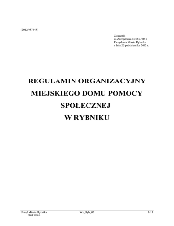 (2012/057448) Załącznik do Zarządzenia Nr586./2012 Prezydenta Miasta Rybnika z dnia 25 października 2012 r. REGULAMIN ORGANIZACYJNY MIEJSKIEGO DOMU POMOCY SPOŁECZNEJ W RYBNIKU Urząd Miasta Rybnika DDM 9000® Wz_Ryb_02 1/11 ROZDZIAŁ I POSTANOWIENIA OGÓLNE §1 Miejski Dom Pomocy Społecznej w Rybniku, zwany dalej „Domem” działa na podstawie Statutu nadanego Uchwałą Nr 252/XVIII/2004 Rady Miasta Rybnika z dnia 25 lutego 2004 r. ze zm. §2 1. Siedzibą Domu jest Miasto Rybnik. 2. Dom jest jednostką stałego pobytu przeznaczoną dla osób przewlekle somatycznie chorych i w podeszłym wieku. 3. Dom świadczy usługi o charakterze stacjonarnym i realizuje zadania Miasta Rybnika w zakresie potrzeb bytowych i zdrowotnych osób obojga płci. 4. Dom zapewnia mieszkańcom: 1) całodobową opiekę polegającą, m.in. na: udzielaniu pomocy w podstawowych czynnościach życiowych, pielęgnacji, pomocy w załatwianiu spraw osobistych, 2) miejsce zamieszkania, tzn. pokoje wyposażone w niezbędny sprzęt (łóżka, tapczany, szafy, półki nocne, stół, krzesła, wieszaki), 3) czystą pościel oraz środki do utrzymania higieny osobistej, 4) wyżywienie, 5) terapię usprawniającą ruch (kinezyterapię i fizykoterapię), 6) zajęcia terapeutyczne m.in. psychoterapię (indywidualną i grupową), socjoterapię, muzykoterapię, biblioterapię oraz terapię zajęciową, 7) spokój i bezpieczeństwo na terenie Domu oraz opiekę w czasie zajęć zorganizowanych poza Domem, 8) realizację potrzeb wyznaniowych (religijne), 9) kontakt osobisty lub listowny z rodziną, 10) bezpieczne przechowywanie powierzonych środków finansowych, 11) odzież i obuwie. ZASADY FUNKCJONOWANIA DOMU §3 1. W Domu przebywają osoby na podstawie skierowania Dyrektora Ośrodka Pomocy Społecznej w Rybniku. 2. Pobyt w Domu jest odpłatny zgodnie z przepisami ustawy o pomocy społecznej. 3. Mieszkańcy korzystają z własnej odzieży, pokoje mogą wyposażyć we własny sprzęt. 4. Posiłki spożywane są w jadalni – każdy mieszkaniec ma zapewnione miejsce przy stole. 5. Osoby chore – leżące spożywają posiłki w pokojach, gdy zachodzi konieczność są karmione. Urząd Miasta Rybnika DDM 9000® Wz_Ryb_02 2/11 6. W Domu organizuje się zajęcia propagujące aktywny tryb życia, w taki sposób, by każdy mieszkaniec mógł w nich uczestniczyć w miarę swoich możliwości, upodobań i stanu zdrowia. 7. Stwarza się optymalne warunki do przebywania mieszkańców na świeżym powietrzu. 8. W miarę możliwości Dom organizuje wycieczki dla swoich mieszkańców. 9. Mieszkańcy Domu traktowani są ze zrozumieniem i powagą. §4 Ustala się następujące zasady przebywania osób odwiedzających na terenie Domu: 1) odwiedziny mogą odbywać się codziennie w godzinach od 10.00 do 12.00 oraz od 14.00 do 18.00, 2) osoba odwiedzająca zgłasza swój pobyt na portierni, 3) osoba odwiedzająca podaje kogo z mieszkańców odwiedza, 4) odwiedziny mogą odbywać się w pokoju mieszkańca pod warunkiem, że zgodę na to wyrazi współlokator, 5) w sytuacji braku takiej zgody odwiedziny odbędą się w świetlicy lub innym pomieszczeniu ogólnodostępnym, 6) pracownicy Domu są uprawnieni do egzekwowania obowiązującego regulaminu Domu od osób odwiedzających mieszkańców, 7) zabrania się wnoszenia na teren Domu alkoholu i przebywania na terenie Domu osób pod wpływem alkoholu lub zachowujących się nieodpowiednio. PRAWA I OBOWIĄZKI MIESZKAŃCA DOMU §5 1. Mieszkaniec Domu ma prawo do: 1) podejmowania samodzielnych decyzji dotyczących jego osoby, 2) uzyskania pełnej informacji o przysługujących świadczeniach, 3) zachowania własnego poglądu do religii, praktykowania swojej religii, 4) uczestnictwa w obrzędach religijnych w środowisku, 5) przyjmowania krewnych i znajomych, 6) składania wniosków i skarg na niewłaściwe wykonywanie usług lub postępowanie osób należących do personelu Domu do Dyrektora Domu, 7) składania skarg na działalność Domu do organu prowadzącego Dom. 2. Mieszkaniec Domu ma obowiązek: 1) przestrzegania zasad współżycia z innymi mieszkańcami Domu, 2) dbania o higienę osobistą, wygląd zewnętrzny oraz porządek wokół siebie, 3) współdziałania z personelem Domu w celu zaspokojenia swoich potrzeb, 4) dbania o mienie Domu, 5) przestrzegania zaleceń wydawanych przez pracowników Domu, 6) przestrzegania przepisów porządkowych określonych w regulaminie. §6 1. Mieszkańcy mogą tworzyć Radę Mieszkańców. Urząd Miasta Rybnika DDM 9000® Wz_Ryb_02 3/11 2. Do kompetencji Rady Mieszkańców należy rozpatrywanie uwag i wniosków mieszkańców oraz reprezentacja ich interesów wobec kierownictwa Domu. 3. Członków Rady Mieszkańców powołuje się w drodze jawnego głosowania. 4. Rada Mieszkańców liczy od trzech do dziewięciu członków, przy czym zasadą jest wybór co najmniej jednego członka jako przedstawiciela każdego piętra Domu. 5. Rada Mieszkańców zbiera się co najmniej raz w miesiącu. ROZDZIAŁ II STRUKTURA ORGANIZACYJNA DOMU §7 1. Dom działa w strukturach organizacyjnych Miasta Rybnika. 2. Domem kieruje Dyrektor odpowiedzialny za właściwe jego funkcjonowanie oraz pracę wszystkich zatrudnionych pracowników, wobec których pełni rolę bezpośredniego przełożonego. 3. W skład struktury organizacyjnej Domu wchodzą następujące działy, dla których ustalono symbole literowe: 1) Dyrektor Domu……………………………………………………………..D 2) Główny księgowy………………………………………………………......GK 3) Dział pielęgnacyjno - opiekuńczo - rehabilitacyjny………………………...POR 4) Dział terapeutyczno - socjalny………..…………………………………….TS 5) Dział finansowo - księgowy…………………………………………………FK 6) Dział gospodarczo - techniczny……………………………………………..GT 7) Dział żywienia………………