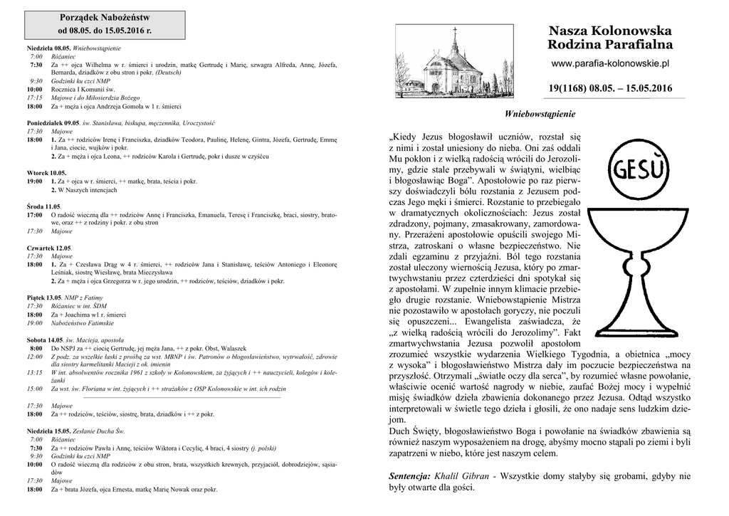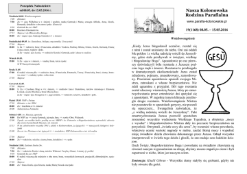 Porządek Nabożeństw od 08.05. do 15.05.2016 r. Niedziela 08.05. Wniebowstąpienie 7:00 Różaniec 7:30 Za ++ ojca Wilhelma w r. śmierci i urodzin, matkę Gertrudę i Marię, szwagra Alfreda, Annę, Józefa, Bernarda, dziadków z obu stron i pokr. (Deutsch) 9:30 Godzinki ku czci NMP 10:00 Rocznica I Komunii św. 17:15 Majowe i do Miłosierdzia Bożego 18:00 Za + męża i ojca Andrzeja Gomoła w 1 r. śmierci Poniedziałek 09.05. św. Stanisława, biskupa, męczennika, Uroczystość 17:30 Majowe 18:00 1. Za ++ rodziców Irenę i Franciszka, dziadków Teodora, Paulinę, Helenę, Gintra, Józefa, Gertrudę, Emmę i Jana, ciocie, wujków i pokr. 2. Za + męża i ojca Leona, ++ rodziców Karola i Gertrudę, pokr i dusze w czyśćcu Wtorek 10.05. 19:00 1. Za + ojca w r. śmierci, ++ matkę, brata, teścia i pokr. 2. W Naszych intencjach Środa 11.05. 17:00 O radość wieczną dla ++ rodziców Annę i Franciszka, Emanuela, Teresę i Franciszkę, braci, siostry, bratowe, oraz ++ z rodziny i pokr. z obu stron 17:30 Majowe Czwartek 12.05. 17:30 Majowe 18:00 1. Za + Czesława Drąg w 4 r. śmierci, ++ rodziców Jana i Stanisławę, teściów Antoniego i Eleonorę Leśniak, siostrę Wiesławę, brata Mieczysława 2. Za + męża i ojca Grzegorza w r. jego urodzin, ++ rodziców, teściów, dziadków i pokr. Piątek 13.05. NMP z Fatimy 17:30 Różaniec w int. ŚDM 18:00 Za + Joachima w1 r. śmierci 19:00 Nabożeństwo Fatimskie Sobota 14.05. św. Macieja, apostoła 8:00 Do NSPJ za ++ ciocię Gertrudę, jej męża Jana, ++ z pokr. Obst, Walaszek 12:00 Z podz. za wszelkie łaski z prośbą za wst. MBNP i św. Patronów o błogosławieństwo, wytrwałość, zdrowie dla siostry karmelitanki Macieji z ok. imienin 13:15 W int. absolwentów rocznika 1961 z szkoły w Kolonowskiem, za żyjących i ++ nauczycieli, kolegów i koleżanki 15:00 Za wst. św. Floriana w int. żyjących i ++ strażaków z OSP Kolonowskie w int. ich rodzin ——–—–——–—–—————————–—————–——————— 17:30 Majowe 18:00 Za ++ rodziców, teściów, siostrę, brata, dziadków i ++ z pokr. Niedziela 15.05. Zesłanie Ducha Św. 7:00 Różaniec 7:30 Za ++ rodziców Pawła i Annę, teściów Wiktora i Cecylię, 4 braci, 4 siostry (j. polski) 9:30 Godzinki ku czci NMP 10:00 O radość wieczną dla rodziców z obu stron, brata, wszystkich krewnych, przyjaciół, dobrodziejów, sąsiadów 17:30 Majowe 18:00 Za + brata Józefa, ojca Ernesta, matkę Marię Nowak oraz pokr. Nasza Kolonowska Rodzina Parafialna www.parafia-kolonowskie.pl 19(1168) 08.05. – 15.05.2016 Wniebowstąpienie „Kiedy Jezus błogosławił uczniów, rozstał się z nimi i został uniesiony do nieba. Oni zaś oddali Mu pokłon i z wielką radością wrócili do Jerozolimy, gdzie stale przebywali w świątyni, wielbiąc i błogosławiąc Boga”. Apostołowie po raz pierwszy doświadczyli bólu rozstania z Jezusem podczas Jego męki i śmierci. Rozstanie to przebiegało w dramatycznych okolicznościach: Jezus został zdradzony, pojmany, zmasakrowany, zamordowany. Przerażeni apostołowie opuścili swojego Mistrza, zatroskani o własne bezpieczeństwo. Nie zdali egzaminu z przyjaźni. Ból tego rozstania został uleczony wiernością Jezusa, który po zmartwychwstaniu przez czterdzieści dni spotykał się z apostołami. W zupełnie innym klimacie przebiegło drugie rozstanie. Wniebowstąpienie Mistrza nie pozostawiło w apostołach goryczy, nie poczuli się opuszczeni... Ewangelista zaświadcza, że „z wielką radością wrócili do Jerozolimy”. Fakt zmartwychwstania Jezusa pozwolił apostołom zrozumieć wszystkie wydarzenia Wielkiego Tygodnia, a obietnica „mocy z wysoka” i błogosławieństwo Mistrza dały im poczucie bezpieczeństwa na przyszłość. Otrzymali „światłe oczy dla serca”, by rozumieć własne powołanie, właściwie ocenić wartość nagrody w niebie, zaufać Bożej mocy i wypełnić misję świadków dzieła zbawienia dokonanego przez Jezusa. Odtąd wszystko interpretowali w świetle tego dzieła i głosili, że ono nadaje sens ludzkim dziejom. Duch Święty, błogosławieństwo Boga i powołanie na świadków zbawienia są również naszym wyposażeniem na drogę, abyśmy mocno stąpali po ziemi i byli zapatrzeni w niebo, które jest naszym celem. Sentencja: Khalil Gibran - Wszystkie domy stałyby się grobami, gdyby nie były otwarte dla gości. 19/2016 PAPIESKA INTENCJA OGÓLNA Aby wszyscy i wszędzie traktowano drugiego człowieka z czcią i szacunkiem. PAPIESKA INTENCJA MISYJNA Aby rozpowszechniała się w rodzinach, wspólnotach i grupach modlitwa w intencji ewangelizacji i pokoju. ——–—–—–—-—–—–—————————–————–——————— Opowiadanie Podróżował po pustyni pewien potężny monarcha, a w ślad za nim postępowała długa karawana przewożąca należące do niego niezliczone skrzynie pełne złota i drogocennych kamieni. W połowie drogi jeden z wielbłądów, oślepiony rozżarzonym piaskiem, runął z westchnieniem na kolana i więcej się już nie podniósł. Skrzynie, które dźwigał, zsunęły się z jego boków na ziemię, roztrzaskując się, a perły i drogocenne kamienie zmieszały się z piaskiem. Król nie zatrzymał pochodu, bowiem nie miał już więcej skrzyń, a wszystkie wielbłądy były i tak przeciążone. Z gestem wyrażającym tyleż żalu, co i wielkoduszności, zezwolił swym paziom i giermkom pozbierać te cenne kamienie, które zdołają odszukać. Podczas gdy oni poszukiwali chciwie łupu i przetrząsali mozolnie piach, król kontynuował swą podróż po pustyni. Spostrzegł jednak, że ktoś postępuje nieustannie jego śladem. Odwrócił się i zobaczył, że biegnie za nim spocony i zdyszany jeden z jego paziów. A ty – zapytał go monarcha – nie zatrzymałeś się, by pozbierać bogactwa? Młodzieniec odpowiedział mu z radością i dumą: - Ja idę za moim królem. ——–—–—