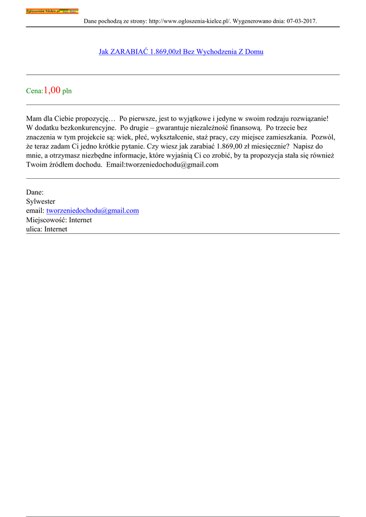 Dane pochodzą ze strony: http://www.ogloszenia-kielce.pl/. Wygenerowano dnia: 07-03-2017. Jak ZARABIAĆ 1.869,00zł Bez Wychodzenia Z Domu Cena:1,00 pln Mam dla Ciebie propozycję… Po pierwsze, jest to wyjątkowe i jedyne w swoim rodzaju rozwiązanie! W dodatku bezkonkurencyjne. Po drugie – gwarantuje niezależność finansową. Po trzecie bez znaczenia w tym projekcie są: wiek, płeć, wykształcenie, staż pracy, czy miejsce zamieszkania. Pozwól, że teraz zadam Ci jedno krótkie pytanie. Czy wiesz jak zarabiać 1.869,00 zł miesięcznie? Napisz do mnie, a otrzymasz niezbędne informacje, które wyjaśnią Ci co zrobić, by ta propozycja stała się również Twoim źródłem dochodu. Email:[email protected] Dane: Sylwester email: [email protected] Miejscowość: Internet ulica: Internet