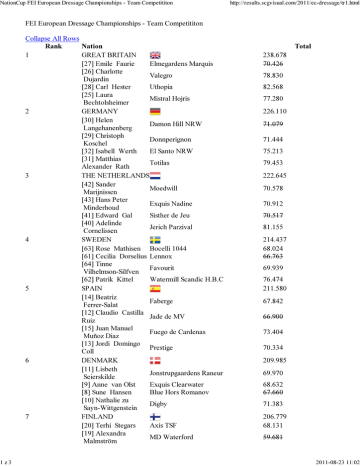 NationCup FEI European Dressage Championships - Team Competititon 1z3 http://results.scgvisual.com/2011/ec-dressage/tr1.html FEI European Dressage Championships - Team Competititon Collapse All Rows Rank Nation 1 GREAT BRITAIN [27] Emile Faurie Elmegardens Marquis [26] Charlotte Valegro Dujardin [28] Carl Hester Uthopia [25] Laura Mistral Hojris Bechtolsheimer 2 GERMANY [30] Helen Damon Hill NRW Langehanenberg [29] Christoph Donnperignon Koschel [32] Isabell Werth El Santo NRW [31] Matthias Totilas Alexander Rath 3 THE NETHERLANDS [42] Sander Moedwill Marijnissen [43] Hans Peter Exquis Nadine Minderhoud [41] Edward Gal Sisther de Jeu [40] Adelinde Jerich Parzival Cornelissen 4 SWEDEN [63] Rose Mathisen Bocelli 1044 [61] Cecilia Dorselius Lennox [64] Tinne Favourit Vilhelmson-Silfven [62] Patrik Kittel Watermill Scandic H.B.C 5 SPAIN [14] Beatriz Faberge Ferrer-Salat [12] Claudio Castilla Jade de MV Ruiz [15] Juan Manuel Fuego de Cardenas Muñoz Diaz [13] Jordi Domingo Prestige Coll 6 DENMARK [11] Lisbeth Jonstrupgaardens Raneur Seierskilde [9] Anne van Olst Exquis Clearwater [8] Sune Hansen Blue Hors Romanov [10] Nathalie zu Digby Sayn-Wittgenstein 7 FINLAND [20] Terhi Stegars Axis TSF [19] Alexandra MD Waterford Malmström [17] Emma Kanerva Sini Spirit Total 238.678 70.426 78.830 82.568 77.280 226.110 71.079 71.444 75.213 79.453 222.645 70.578 70.912 70.517 81.155 214.437 68.024 66.763 69.939 76.474 211.580 67.842 66.900 73.404 70.334 209.985 69.970 68.632 67.660 71.383 206.779 68.131 59.681 70.198 2011-08-23 11:02 NationCup FEI European Dressage Championships - Team Competititon 2z3 8 9 10 11 12 13 14 15 16 http://results.scgvisual.com/2011/ec-dressage/tr1.html [17] Emma Kanerva Sini Spirit [18] Mikaela Lindh Skovlunds Más Guapo AUSTRIA [3] Renate Voglsang Fabriano 58 [1] Peter Gmoser Cointreau [2] Victoria Augustin OLD Max-Theurer [] POLAND [50] Beata Stremler Martini [48] Katarzyna Ekwador Milczarek [49] Michal Randon Rapcewicz [] BELGIUM [7] Johan Zagers Question de Liberte [5] Claudia Fassaert Donnerfee [6] Philippe Jorissen Le Beau [4] Jeroen Devroe Apollo van het Vijverhof NORWAY [47] Cathrine Orlando III Rasmussen [46] Camilla Kalseth Carte d´Or [45] Lillann Jebsen Pro - Set [44] Siril Helljesen Dorina PORTUGAL [51] Maria Caetano Xiripiti [53] Luis Principe World Performance Washington [52] Gonçalo Rubi Carvalho [] ITALY [37] Ester Soldi Harmonia [36] Susanna Bordone Dark Surprise [38] Valentina Truppa Eremo del Castegno [] SWITZERLAND [58] Markus Graf Ronaldo II [57] Elisabeth Rokoko N Eversfield-Koch [66] Marcela Krinke Smeyers Molberg Susmelj [60] Hans Staub Warbeau FRANCE [23] Anne-Sophie Le Guerrier Serre [21] Sébastien Passe Partout Duperdu [22] Catherine Paradieszauber Henriquet [24] Arnaud Serre Helio II RUSSIAN 70.198 68.450 206.778 66.474 67.492 72.812 206.505 69.650 68.967 67.888 202.128 62.584 64.818 67.751 69.559 201.459 63.906 60.243 66.292 71.261 201.155 67.173 64.620 69.362 199.681 61.292 66.246 72.143 198.921 64.696 66.155 66.550 66.216 193.556 65.152 63.374 DNS 65.030 184.179 2011-08-23 11:02 NationCup FEI European Dressage Championships - Team Competititon 3z3 RUSSIAN FEDERATION [56] Yulia Vinnitskaja Vodevil [54] Tatiana Khorovod Dorofeeva [55] Tatyana Fatinitza Makarova [] SCG Visual, the Netherlands www.scgvisual.com 16 http://results.scgvisual.com/2011/ec-dressage/tr1.html 184.179 55.699 63.450 65.030 2011-08-23 11:02
