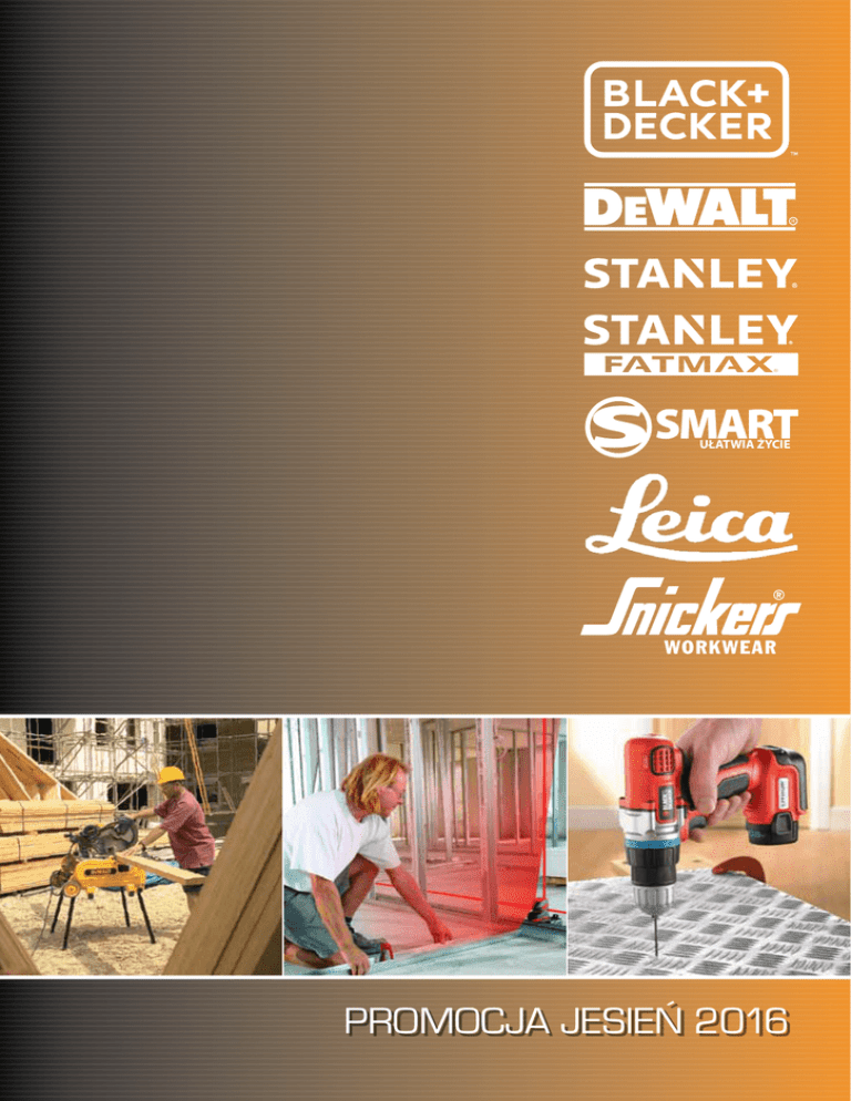 Promocja Jesień 2016 DCD780 DCD785 Akumulatorowa wiertarko-wkrętarka 18V XR 18V 18V Akumulatorowa wiertarko-wkrętarka z udarem18V XR 60Nm Rodzaj akumulatora (XR) Napięcie Moc użyteczna Prędkość bez obciążenia Częstość udaru Uchwyt wiertarski Maks. moment obr.(twardy/miękki) Maks. śr. wiercenia w drewnie Maks. śr. wiercenia w metalu/murze Waga (kg) 60Nm Napięcie 18V 1,5 - 13 mm Uchwyt wiertarski 350W Moc użyteczna 0-600/2000 obr/min Prędkość bez obciążenia Maks. moment obr. (twardy/miękki) 60Nm/35 Nm 38 mm Maks. śr. wiercenia w drewnie Maks. śr. wiercenia w metalu w13 mm 1,55/1,84/1,84/1,84 Waga (kg) Litowo-jonowy 18V 350W 0-600/2000 obr/min 0-10200/34000 ud/min 1.5-13 mm 60 Nm/23 Nm 38mm 13mm 1,24/1,60/1,88 Wyposażenie standardowe: 2 akumulatory Li-Ion XR, ładowarka wielonapięciowa XR, zaczep do paska, uchwyt magnetyczny, mocny kufer transportowy. DCD780C2 2 x 1,5Ah 1089 PLN netto DCD780M2 2 x 4,0Ah 1259 PLN netto ∅ DCD785N 619 PLN netto DCD785C2 2 x 1,5Ah 1209 PLN netto DCD785M2 2 x 4,0Ah 1519 PLN netto DCD791 DCD796 Wyposażenie standardowe: kufer, wsuwane baterie, 60 minutowa ładowarka. 1339,47 PLN brutto 1487,07 PLN brutto 1548,47 PLN brutto 18V 1868,37 PLN brutto Akumulatorowa wiertarko-wkrętarka 18V XR b silnik ezszc ow zotk silnik 18V czot bezsz kowY 70Nm Technologia akumulatorów XR Li-Ion 18 V Napięcie 70 Nm Maks. moment obrotowy (twardy) 27 Nm Maks. moment obrotowy (miękki) 460 W Moc użyteczna 0-550/2000 obr/min Prędkość bez obciążenia 0-9350/34000 ud/min Czestość udaru 1.5-13 mm Uchwyt wiertarski 40 mm Maks. średnica wiercenia [Drewno] 13 mm Maks. średnica wiercenia [Metal] 13 mm Maks. średnica wiercenia [Mur] 1.8 kg (p2) / 1.6 kg(d2 i d2b) Masa Wyposażenie standardowe: 2 akumulatory Li-Ion XR, model d2b ma akumulatory z bluethooth, uchwyt magnetyczny, ładowarka wielonapięciowa XR, zaczep do paska, mocny kufer transportowy TSTAK. XR Li-Ion 18 V 5.0 Ah 70 Nm 27 Nm 460 W 0-550/2000 obr/min 1.5-13 mm 40 mm 13 mm 1.7 kg(p2) / 1.5 kg (d2b i d2) Wyposażenie standardowe: 2 akumulatory Li-Ion XR, model d2b ma akumulatory z bluetooth, uchwyt magnetyczny, ładowarka wielonapięciowa XR, zaczep do paska, mocny kufer transportowy TSTAK. DCD791D2 2 x 2,0 Ah 1009 PLN netto DCD791D2B 2 x 2,0 Ah 1229 PLN netto DCD791P2 2 x 5,0 Ah 1269 PLN netto DCD796D2 2 x 2,0 Ah 1149 PLN netto DCD796D2B 2 x 2,0 Ah 1359 PLN netto DCD796P2 2 x 5,0 Ah 1329 PLN netto 1241,07 PLN brutto Akumulatory z Bluetooth Akumulatorowa wiertarko-wkrętarka z udarem18V XR Y 70Nm Technologia akumulatorów Napięcie Pojemność akumulatora Maks. moment obrotowy (twardy) Maks. moment obrotowy (miękki) Moc użyteczna Prędkość bez obciążenia Uchwyt wiertarski Maks. średnica wiercenia [Drewno] Maks. średnica wiercenia [Metal] Masa 761,37 PLN brutto Bez wyposażenia standardowego 1413,27 PLN brutto 1511,67 PLN brutto Akumulatory z Bluetooth 1560,87 PLN brutto 1671,57 PLN brutto 1634,67 PLN brutto –2– DCD730 DCD735 Kompaktowa akumulatorowa wiertarko-wkrętarka 14,4V XR Kompaktowa akumulatorowa wiertarko-wkrętarka z udarem XR Li-Ion, 14,4 V 14.4V 57Nm 14.4V 57Nm Napięcie Wielkość uchwytu Moc użyteczna Prędkość bez obciążenia Maks. moment obr.(twardy) Maks. moment obr.(miękki) Maks. Średnica wiercenia w drewnie Maks. Średnica wiercenia w metalu Waga (kg) 14.4 V 1.5 - 13 mm 300 W 0-550/1900 obr/min 57 Nm 20 Nm 35 mm 13 mm 1,5/1,5/1,73/1,73 Rodzaj akumulatora (XR) Napięcie Maks. moment obrotowy (twardy) Maks. moment obrotowy (miękki) Moc użyteczna Predkość bez obciążenia Częstość udaru Uchwyt wiertarski Maks. średnica wiercenia [Drewno] Maks. średnica wiercenia [Metal] Maks. średnica wiercenia [Mur] Waga (kg) Wymiary Wyposażenie standardowe: kufer, 2 wsuwane baterie, 30 minutowa ładowarka. DCD730C2 2 x 1,5Ah 949 PLN netto DCD730C3 3 x 1,5Ah 999 PLN netto DCD730M2 2 x 4,0Ah 1219 PLN netto 1167,27 PLN brutto Wyposażenie standardowe: 2 akumulatory Li-Ion XR, ładowarka wielonapięciowa XR, zaczep do paska, uchwyt magnetyczny, mocny kufer transportowy. 1228,77 PLN brutto OFERTA SPECJALNA DCD735M2 2 x 4,0Ah 1319 PLN netto 1499,37 PLN brutto DCD732 1622,37 PLN brutto DCD737 Akumulatorowa wiertarko-wkrętarka 14,4 V XR silnik czot bezsz Akumulatorowa wiertarko-wkrętarka z udarem 14,4 V XR kowY silnik 14.4V 57Nm Rodzaj akumulatora (XR) Napięcie Moc użyteczna Prędkość bez obciążenia Uchwyt wiertarski Maks. moment obr.(twardy) Maks. moment obr.(miękki) Maks. śr. wiercenia w drewnie Maks. śr. wiercenia w metalu Waga (kg) Litowo-jonowy 14.4V 57 Nm 20 Nm 300 W 0-550/1900 obr/min 0-9350/32300 ud/min 1.5-13 mm 35 mm 13 mm 13 mm 1,24/1,55/1,78 202 x 198 x 80 mm czot bezsz kowY 14.4V 57Nm Litowo-jonowy 14,4V 310W 0-550/2000 obr/min 1.5-13 mm 57 Nm 19 Nm 38mm 13mm 1,52 /1,72/1,72 Rodzaj akumulatora (XR) Napięcie Moc użyteczna Prędkość bez obciążenia Częstość udaru Uchwyt wiertarski Maks. moment obr.(twardy/miękki) Maks. śr. wiercenia w drewnie Maks. śr. wiercenia w metalu/murze Waga (kg) Wyposażenie standardowe: 2 akumulatory Li-Ion XR, ładowarka wielonapięciowa XR, zaczep do paska, uchwyt magnetyczny, mocny kufer transportowy. Litowo-jonowy 14,4V 310W 0-550/2000 obr/min 0-9500/33200 ud/min 1.5-13 mm 57 Nm/ 19 Nm 38mm 13mm 1,58/1,78/1,78 Wyposażenie standardowe: 2 akumulatory Li-Ion XR, ładowarka wielonapięciowa XR, zaczep do paska, uchwyt magnetyczny, mocny kufer transportowy. DCD732D2 2 x 2,0 Ah 1159 PLN netto DCD732M2 2 x 4,0 Ah 1429 PLN netto DCD732P2 2 x 5,0 Ah 1409 PLN netto DCD737D2 2 x 2,0 Ah 1289 PLN netto DCD737M2 2 x 4,0 Ah 1479 PLN netto DCD737P2 2 x 5,0 Ah 1459 PLN netto 1425,57 PLN brutto 1585,47 PLN brutto 1757,67 PLN brutto 1819,17 PLN brutto 1733,07 PLN brutto 1794,57 PLN brutto –3– DCD710 DCD734C2 Wiertarko -wkrętarka 10,8V Wiertarko-wkrętarka XR z udarem 14,4V 2x 1.3Ah 14.4V 38Nm Napięcie 14,4V 1,3Ah Pojemność akumulatora 38 Nm Maks. moment obrotowy (twardy) 22 Nm Maks. moment obrotowy (miękki) 250 W Moc uz