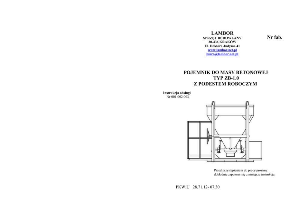 LAMBOR SPRZĘT BUDOWLANY 30-436 KRAKÓW Ul. Doktora Judyma 41 www.lambor.net.pl [email protected] Nr fab. POJEMNIK DO MASY BETONOWEJ TYP ZB-1.0 Z PODESTEM ROBOCZYM Instrukcja obsługi Nr 001 002 003 Przed przystąpieniem do pracy prosimy dokładnie zapoznać się z niniejszą instrukcją PKWiU 28.71.12- 07.30 ZAWARTOŚĆ INSTRUKCJI NOTATKI WPROWADZENIE .........................................................................................1 PRZEZNACZENIE ..........................................................................................1 ZNACZENIE SYMBOLI ..................................................................................2 PRZYGOTOWANIE DO TRANSPORTU .............................................................3 PRZYGOTOWANIE DO PRACY .......................................................................3 DEMONTAś I KASACJA ...............................................................................3 INSTRUKCJE OBSŁUGIWANIA .......................................................................4 PRZECHOWYWANIE .....................................................................................4 CHARAKTERYSTYKA ...................................................................................5 ZASADY BEZPIECZEŃSTWA..........................................................................7 .....................................................................8 DEKLARACJA ZGODNOŚCI ...........................................................................9 KARTA GWARANCYJNA ............................................................................. 10 WYKAZ CZĘŚCI ZAMIENNYCH 13 NOTATKI WPROWADZENIE Przed użyciem nowego pojemnika do masy betonowej należy: 1. Dokładnie zapoznać się z treścią niniejszej instrukcji obsługi. 2. Sprawdzenie prawidłowości zamocowania zawiesi, oraz zamknięcia suwaka otworu wylotowego. 3. Sprawdzić prawidłowość zamocowania kosza do podstawy zbiornika. PRZEZNACZENIE Pojemnik do masy betonowej ZB-1.0 z podestem roboczym przeznaczony jest do transportu urobionej masy betonowej oraz materiałów sypkich dźwigiem lub suwnicą z możliwością obsługi przez pracownika znajdującego się na podeście roboczym, celem wypełnienia form lub szalunków. Pojemnik do masy betonowej powinien być użytkowany, obsługiwany naprawiany wyłącznie przez osoby zaznajomione z jego szczegółowymi charakterystykami i zapoznane z zasadami postępowania w zakresie bezpieczeństwa. Przepisy dotyczące zapobieganiu wypadkom oraz wszelkie podstawowe przepisy w zakresie bezpieczeństwa i medycyny pracy a także przepisy ruchu drogowego powinny być zawsze przestrzegane. Samowolne wprowadzenie zmian do urządzenia zwalnia producenta od odpowiedzialności za powstałe uszkodzenia lub szkody. 12 1 ZNACZENIE SYMBOLI NOTATKI Symbole: OSTRZEŻENIE! Następstwem nieuważnego i nieprawidłowego posługiwania się urządzeniem mogą być poważne szkody lub śmierć operatora bądź innych osób. Przed przystąpieniem do pracy z pojemnikiem do betonu prosimy o dokładne zapoznanie się z niniejszą instrukcją obsługi. Korzystaj z przeciwpoślizgowego stabilnego i trwałego obuwia. 2 11 LAMBOR PRZYGOTOWANIE DO TRANSPORTU SPRZĘT BUDOWLANY 30-436 KRAKÓW Ul. Doktora Judyma 41 www.lambor.net.pl [email protected] Transport pojemnika na dalszą odległość należy wykonywać na pojazdach w pozycji pionowej. Pojemnik należy zabezpieczyć przed przemieszczaniem się przytwierdzając go pasami do podłogi pojazdu. KARTA GWARANCYJNA POJEMNIK DO MASY BETONOWEJ TYP ZB-1.0 Z PODESTEM ROBOCZYM PRZYGOTOWANIE DO PRACY Nr fab. ……………, rok prod. 2011 Przed przystąpieniem do użytkowania pojemnika należy dokonać oględzin całej konstrukcji stalowej spawanej pod względem widocznych śladów p ęknięć materiału lub spawu oraz połączeń mechanizmu zasuwowego. ORZECZENIE K.T. Pojemnik przeszedł próbę pod obciążeniem z wynikiem pozytywnym. Data badania : 2011-. Pieczęć i podpis kierownika K.T. Zakład udziela gwarancji, jako producent dostarczonego pojemnika do masy betonowej na okres 12 miesięcy. Do okresu gwarancji nie wlicza się okresu poprzedzającego gwarancję (czas transportu i składowania) pod warunkiem, że okres ten nie przekracza trzech miesięcy. Karta gwarancyjna bez podpisu i pieczęci jest nieważna. Odbiorca może dochodzić roszczeń z tytułu udzielonej mu gwarancji tylko wówczas, gd y przy eksploatacji zastosował się do instrukcji obsługi a uszkodzenie nastąpiło na skutek wad jakościowych. Ostrzeżenie: Wymienione wady nie dopuszczają pojemnika do użytkowania. DEMONTAŻ I KASACJA W przypadku całkowitego zużycia urządzenia i przeznaczeniu do kasacji należy pojemnik zdemontować na części. Zdemontowane części przekazać do punktu skupu złomu. Nie są uznane za wady w rozumieniu niniejszej gwarancji usterki, braki lub uszkodzenia, które powstały na skutek wadliwego tra nsportu, nieprawidłowego eksploatowania, konserwacji i przechowywania pojemnika. Data sprzedaŜy………… 10 ………. 3 INSTRUKCJE OBSŁUGIWANIA Czyszczenie: DEKLARACJA ZGODNOŚCI ZAŚWIADCZENIE JAKOŚCI Nr /2011 Deklarujemy z pełną odpowiedzialnością, że sprzedany wyrób: W celu zapewnienia długotrwałej i bezawaryjnej pracy pojemnik do betonu powinien być utrzymywany w czystości. Powierzchnia wewnętrzna pojemnika po zakończonej pracy powinna być zabezpieczona środkiem antyadhezyjnym takim jaki stosowany jest na budowie do zabezpieczania szalunków. Smarowanie: 3 Pojemnik do betonu ZB-1.0 o pojemności 1.0m z wylewem prostym i podestem roboczym PKWiU 28.71.12-07.30, Nr fabryczny , data produkcji 2011-, do którego odnosi się niniejsza deklaracja jest zgodny z normą PN-EN 292-2, oraz przepisami Dyrektywy 2006/42/WE z 17 maja 2006 r. i Rozporządzeniem Ministra Gospodarki z 21 października 2008 r. Dz.U.199, poz. 1228. Pojemnik przeznaczony jest do transportu masy betonowej przy uŜyciu urządzenia dźwigowego. Dane Te