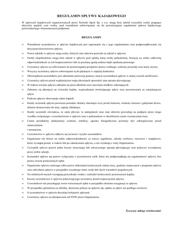 REGULAMIN SPŁYWU KAJAKOWEGO W spływach kajakowych organizowanych przez Śremski Sport Sp. z o.o. mogą brać udział wszystkie osoby pragnące aktywnie spędzić czas wolny, pod warunkiem zobowiązania się do przestrzegania regulaminu spływu kajakowego potwierdzonego własnoręcznym podpisem. REGULAMIN • Warunkiem uczestnictwa w spływie kajakowym jest zapoznanie się z jego regulaminem oraz podporządkowanie się decyzjom kierownictwa spływu. • Prawo udziału w spływie mają osoby, których stan zdrowia pozwala na udział w spływie. • Osoby niepełnoletnie mogą brać udział w spływie pod opieką innej osoby pełnoletniej, biorącej na siebie całkowitą odpowiedzialność za ich bezpieczeństwo lub za pisemną zgodą rodzica bądź opiekuna prawnego. • Uczestnicy spływu są zobowiązani do przestrzegania przepisów prawa wodnego, ochrony przyrody oraz karty turysty. • Wszyscy uczestnicy spływu zobowiązani są do płynięcia w zapiętej kamizelce. • Obowiązkiem uczestników jest udzielanie pierwszej pomocy innym uczestnikom spływu w miarę swoich możliwości. • Uczestnicy spływu przed wypłynięciem mają obowiązek sprawdzić stan sprzętu pływającego. • W trakcie trwania spływu zabrania się picia alkoholu oraz używania środków odurzających. • Zabrania się płynięcia na wierzchu kajaka, wyprzedzania otwierającego spływ oraz pozostawania za zamykającym spływ. • Podczas spływu obowiązuje zakaz kąpieli. • Każdy uczestnik spływu powinien posiadać okulary chroniące oczy przed słońcem, wiatrem, kurzem i gałęziami drzew, ubranie dostosowane do aury, napoje chłodzące. • Każdy uczestnik oświadcza, że umie pływać, ta umiejętność oraz stan zdrowia pozwalają na podjęcie przez niego wysiłku związanego z uczestnictwem w spływie oraz z pokonaniem w określonym czasie wyznaczonej trasy. • Cenne przedmioty (dokumenty osobiste, telefony, aparaty fotograficzne) powinny być zabezpieczone przed zamoczeniem i utonięciem. • Uczestnictwo w spływie odbywa się na koszt i ryzyko uczestników. • Organizator nie bierze na siebie odpowiedzialności za rzeczy zagubione, szkody osobowe, rzeczowe i majątkowe, które wystąpią przed, w trakcie lub po zakończeniu spływu, a nie wynikają z winy Organizatora. • Uczestnik spływu ponosi pełne koszty utraconego lub zniszczonego sprzętu pływającego oraz pokrywa wyrządzone przez siebie szkody. • Komandor spływu ma prawo wyłączenia z uczestnictwa osób, które nie podporządkują się regulaminowi spływu, bez prawa zwrotu poniesionych opłat. • Organizator spływu zastrzega sobie prawo dokonania koniecznych zmian trasy, godziny rozpoczęcia i programu spływu oraz odwołania spływu w przypadku wysokiego stanu wody lub złych warunków pogodowych. • Na niektórych trasach występują przeszkody wodne i zachodzi konieczność przenoszenia kajaka. • Koszty uczestnictwa w spływie pokrywają jego uczestnicy przed rozpoczęciem spływu. • Uczestnikowi nie przysługuje zwrot wniesionych opłat w przypadku złożenia rezygnacji ze spływu. • W przypadku spóźnienia na zbiórkę, skrócenia pobytu na spływie itp. opłata za spływ nie podlega zwrotowi. • O uczestnictwie w spływie decyduje kolejność zgłoszeń. • Uczestnicy spływu są ubezpieczeni od NNW przez Organizatora. Życzymy miłego wiosłowania!