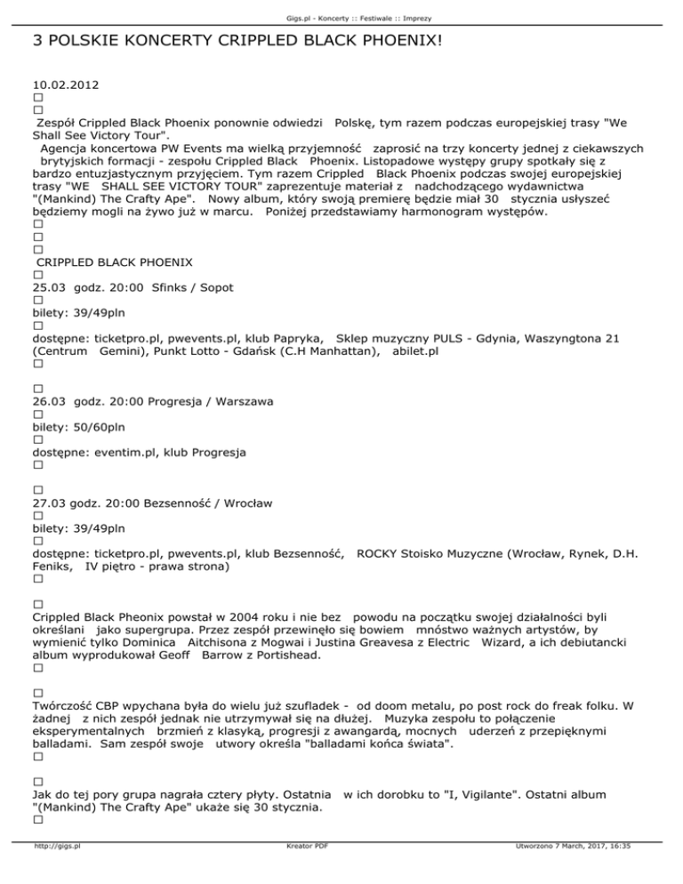 Gigs.pl - Koncerty :: Festiwale :: Imprezy 3 POLSKIE KONCERTY CRIPPLED BLACK PHOENIX! 10.02.2012 Zespół Crippled Black Phoenix ponownie odwiedzi Polskę, tym razem podczas europejskiej trasy "We Shall See Victory Tour". Agencja koncertowa PW Events ma wielką przyjemność zaprosić na trzy koncerty jednej z ciekawszych brytyjskich formacji - zespołu Crippled Black Phoenix. Listopadowe występy grupy spotkały się z bardzo entuzjastycznym przyjęciem. Tym razem Crippled Black Phoenix podczas swojej europejskiej trasy "WE SHALL SEE VICTORY TOUR" zaprezentuje materiał z nadchodzącego wydawnictwa "(Mankind) The Crafty Ape". Nowy album, który swoją premierę będzie miał 30 stycznia usłyszeć będziemy mogli na żywo już w marcu. Poniżej przedstawiamy harmonogram występów. CRIPPLED BLACK PHOENIX 25.03 godz. 20:00 Sfinks / Sopot bilety: 39/49pln dostępne: ticketpro.pl, pwevents.pl, klub Papryka, Sklep muzyczny PULS - Gdynia, Waszyngtona 21 (Centrum Gemini), Punkt Lotto - Gdańsk (C.H Manhattan), abilet.pl 26.03 godz. 20:00 Progresja / Warszawa bilety: 50/60pln dostępne: eventim.pl, klub Progresja 27.03 godz. 20:00 Bezsenność / Wrocław bilety: 39/49pln dostępne: ticketpro.pl, pwevents.pl, klub Bezsenność, Feniks, IV piętro - prawa strona) ROCKY Stoisko Muzyczne (Wrocław, Rynek, D.H. Crippled Black Pheonix powstał w 2004 roku i nie bez powodu na początku swojej działalności byli określani jako supergrupa. Przez zespół przewinęło się bowiem mnóstwo ważnych artystów, by wymienić tylko Dominica Aitchisona z Mogwai i Justina Greavesa z Electric Wizard, a ich debiutancki album wyprodukował Geoff Barrow z Portishead. Twórczość CBP wpychana była do wielu już szufladek - od doom metalu, po post rock do freak folku. W żadnej z nich zespół jednak nie utrzymywał się na dłużej. Muzyka zespołu to połączenie eksperymentalnych brzmień z klasyką, progresji z awangardą, mocnych uderzeń z przepięknymi balladami. Sam zespół swoje utwory określa "balladami końca świata". Jak do tej pory grupa nagrała cztery płyty. Ostatnia "(Mankind) The Crafty Ape" ukaże się 30 stycznia. http://gigs.pl Kreator PDF w ich dorobku to "I, Vigilante". Ostatni album Utworzono 7 March, 2017, 16:35 Gigs.pl - Koncerty :: Festiwale :: Imprezy Źródło: Materiały promocyjne organizatora http://gigs.pl Kreator PDF Utworzono 7 March, 2017, 16:35