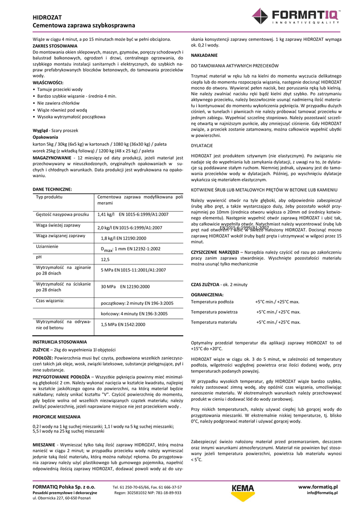 HIDROZAT Cementowa zaprawa szybkosprawna Wiąże w ciągu 4 minut, a po 15 minutach może byd w pełni obciążona. ZAKRES STOSOWANIA Do montowania okien sklepowych, maszyn, gzymsów, poręczy schodowych i balustrad balkonowych, ogrodzeo i drzwi, centralnego ogrzewania, do szybkiego montażu instalacji sanitarnych i elektrycznych, do szybkich napraw prefabrykowanych bloczków betonowych, do tamowania przecieków wody. WŁAŚCIWOŚCI: • Tamuje przecieki wody • Bardzo szybkie wiązanie - średnio 4 min. • Nie zawiera chlorków • Wiąże również pod wodą • Wysoka wytrzymałośd początkowa Wygląd - Szary proszek Opakowania karton 5kg / 30kg (6x5 kg) w kartonach / 1080 kg (36x30 kg) / paleta worek 25kg (z wkładką foliową) / 1200 kg (48 x 25 kg) / paleta MAGAZYNOWANIE - 12 miesięcy od daty produkcji, jeżeli materiał jest przechowywany w nieuszkodzonych, oryginalnych opakowaniach w suchych i chłodnych warunkach. Data produkcji jest wydrukowana na opakowaniu. DANE TECHNICZNE: Cementowa zaprawa modyfikowana polimerami Gęstośd nasypowa proszku 1,41 kg/l EN 1015-6:1999/A1:2007 Waga związanej zaprawy Uziarnienie pH NAKŁADANIE DO TAMOWANIA AKTYWNYCH PRZECIEKÓW Trzymad materiał w ręku lub na kielni do momentu wyczucia delikatnego ciepła lub do momentu rozpoczęcia wiązania, następnie docisnąd HIDROZAT mocno do otworu. Wywierad pełen nacisk, bez poruszania ręką lub kielnią. Nie należy zwalniad nacisku ręki bądź kielni zbyt szybko. Po zatrzymaniu aktywnego przecieku, należy bezzwłocznie usunąd nadmierną ilośd materiału i kontynuowad do momentu wykooczenia pęknięcia. W przypadku dużych ciśnieo, w tunelach i piwnicach nie należy próbowad tamowad przecieku w jednym zabiegu. Wypełniad szczelinę stopniowo. Należy pozostawid szczelinę otwartą w najniższym punkcie, aby zmniejszyd ciśnienie. Gdy HIDROZAT zwiąże, a przeciek zostanie zatamowany, można całkowicie wypełnid ubytki w powierzchni. DYLATACJE HIDROZAT jest produktem sztywnym (nie elastycznym). Po związaniu nie nadaje się do wypełniania lub zamykania dylatacji, z uwagi na to, że dylatacje są poddawane stałym ruchom. Niemniej jednak, używany jest do tamowania przecieków wody w dylatacjach. Później, po wyschnięciu dylatacje wykaocza się materiałem elastycznym. KOTWIENIE ŚRUB LUB METALOWYCH PRĘTÓW W BETONIE LUB KAMIENIU Typ produktu Waga świeżej zaprawy skania konsystencji zaprawy cementowej. 1 kg zaprawy HIDROZAT wymaga ok. 0,2 l wody. 2,0 kg/l EN 1015-6:1999/A1:2007 1,8 kg/l EN 12190:2000 D max: 1 mm EN 12192-1:2002 12,5 Należy wywiercid otwór na tyle głęboki, aby odpowiednio zabezpieczył śrubę albo pręt, a także wystarczająco duży, żeby pozostało wokół przynajmniej po 10mm (średnica otworu większa o 20mm od średnicy kotwionego elementu). Następnie wypełnid otwór zaprawą HIDROZAT i ubid tak, aby całkowicie wypełniła otwór. Natychmiast należy wycentrowad śrubę lub EN 1015-6:1999/A1:2007 pręt nad otworem i wbid w świeżo nałożony HIDROZAT. Docisnąd mocno zaprawę HIDROZAT wokół śruby bądź pręta i utrzymywad w wilgoci przez 15 minut. CZYSZCZENIE NARZĘDZI – Narzędzia należy czyścid od razu po zakooczeniu pracy zanim zaprawa stwardnieje. Wyschnięte pozostałości materiału można usunąd tylko mechanicznie Wytrzymałośd na zginanie po 28 dniach 5 MPa EN 1015-11:2001/A1:2007 Wytrzymałośd na ściskanie po 28 dniach 30 MPa EN 12190:2000 CZAS ZUŻYCIA - ok. 2 minuty początkowy: 2 minuty EN 196-3:2005 OGRANICZENIA: Temperatura podłoża +5°C min./ +25°C max. koocowy: 4 minuty EN 196-3:2005 Temperatura powietrza +5°C min./ +25°C max. 1,5 MPa EN 1542:2000 Temperatura materiału +5°C min./ +25°C max. Czas wiązania: Wytrzymałośd na odrywanie od betonu INSTRUKCJA STOSOWANIA ZUŻYCIE – 2kg do wypełnienia 1l objętości PODŁOŻE: Powierzchnia musi byd czysta, pozbawiona wszelkich zanieczyszczeo takich jak oleje, wosk, związki lateksowe, substancje pielęgnujące, pył i inne substancje. PRZYGOTOWANIE PODŁOŻA – Wszystkie pęknięcia powinny mied minimalną głębokośd 2 cm. Należy wykonad nacięcia w kształcie kwadratu, najlepiej w kształcie jaskółczego ogona do powierzchni, na którą materiał będzie nakładany; należy unikad kształtu "V". Czyścid powierzchnię do momentu, gdy będzie wolna od wszelkich niezwiązanych cząstek materiału; należy zwilżyd powierzchnię, jeżeli naprawiane miejsce nie jest przeciekiem wody . PROPORCJE MIESZANIA Optymalny przedział temperatur dla aplikacji zaprawy HIDROZAT to od +15°C do +20°C. HIDROZAT wiąże w ciągu ok. 3 do 5 minut, w zależności od temperatury podłoża, wilgotności względnej powietrza oraz ilości dodanej wody, przy temperaturach podanych powyżej. W przypadku wysokich temperatur, gdy HIDROZAT wiąże bardzo szybko, należy zastosowad zimną wodę, aby opóźnid czas wiązania, umożliwiając nanoszenie materiału. W ekstremalnych warunkach należy przechowywad produkt w cieniu i dodawad lód do wody zarobowej. Przy niskich temperaturach, należy używad ciepłej lub gorącej wody do przygotowania mieszanki. W ekstremalnie niskiej temperaturze, tj. blisko 0°C, należy podgrzewad materiał i używad gorącej wody. 0,2 l wody na 1 kg suchej mieszanki; 1,1 l wody na 5 kg suchej mieszanki; 5,5 l wody na 25 kg suchej mieszanki MIESZANIE - Wymieszad tylko taką ilośd zaprawy HIDROZAT, którą można nanieśd w ciągu 2 minut; w przypadku przecieku wody należy wymieszad jedynie taką ilośd materiału, którą można nałożyd rękoma. Do przygotowania zaprawy należy użyd plastikowego lub gumowego pojemnika, napełnid odpowiednią ilością zaprawy HIDROZAT, dodawad powoli wody aż do uzy- FORMATIQ Polska Sp. z o.o. Posadzki przemysłowe i dekoracyjne ul. Obornicka 227, 60-650 Poznao Tel. 61 250-70-65/66, Fax. 61 666-37-57 Regon: 302581032 NIP: 781-18-89-933 Zabezpieczyd świeżo nałożony materiał przed przemarzaniem, deszczem oraz innymi warunkami 